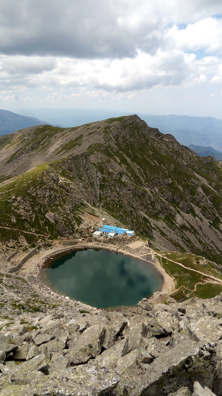 下撤,山路坎坷非普通人能经历,脚下就是龙的泪滴——大爷海,幽深如一泓黑珍珠,据说国家潜水队队员来到这里也没找到源头,在这样高海拔的地方(3690多米),竟然有如此深的高原湖泊,不得不说是一件奇事,想着去年清明时节来探望它,那时它还是冰封雪飘不肯以真面目示人,今年终于看个够,“大爷海”三字是著名书画家中石先生的手笔,古朴大方,和这环境极衬,登顶拔仙台,看够大爷海,也算不虚此行了。