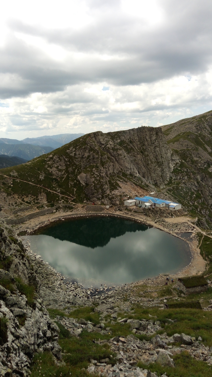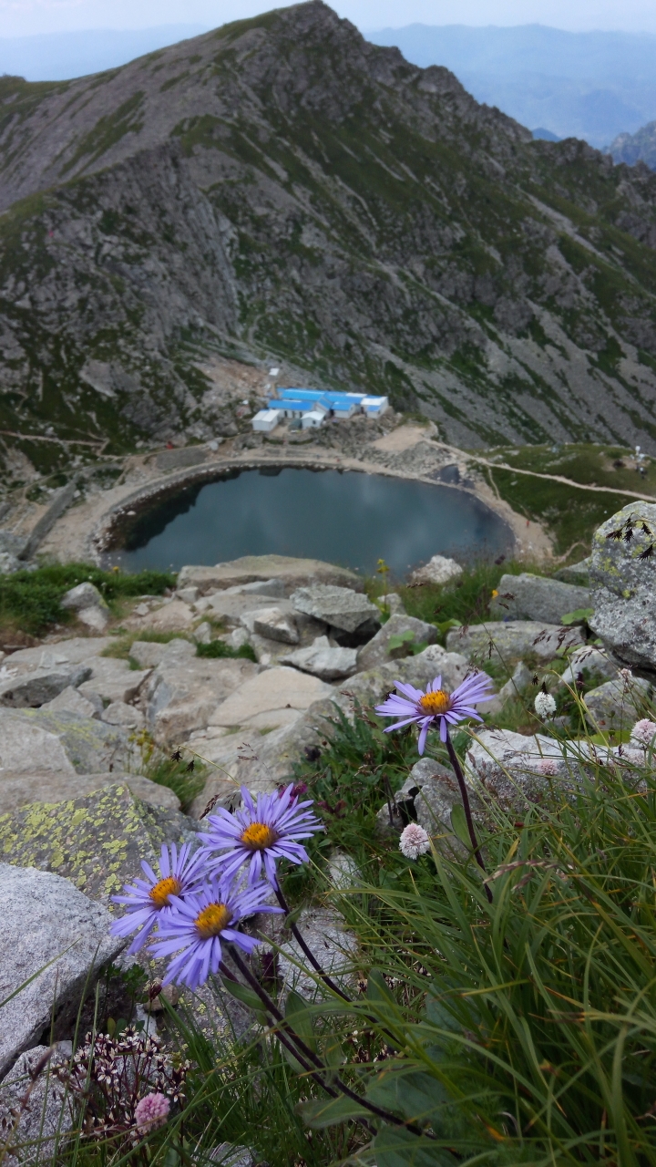 万仙阵过后就是东跑马梁,号称四十里的跑马梁实际只有八公里,踏上跑马梁就能看到一座破败的庙宇——雷公庙,五一鳌太出事如果云南的团队能够在雷公庙扎营,也许悲剧就不会发生了。这八公里大多是高山草甸,偶有乱石,穿行其间也算舒服,走到尽头有两条线路选择,一是继续登攀太白主峰——拔仙台,一是绕道而行直接到达大爷海,我虽去过拔仙台,但还是有不到拔仙台心不甘的情怀。蛇哥因为走的太多了,根本就不想上拔仙台了,就自顾自的趴在草甸上各种拍照,你别说,蛇哥拍照水平还真好,好多照片的角度和取景都很独到。我在拔仙台下行到大爷海路上遇到几朵小野花,配上犹如黑珍珠一样的大爷海,真是美极了。蛇哥给了好评,还说最好是横版,我的大多数都是竖版,想要表现对面山峰倒映水中的感觉。