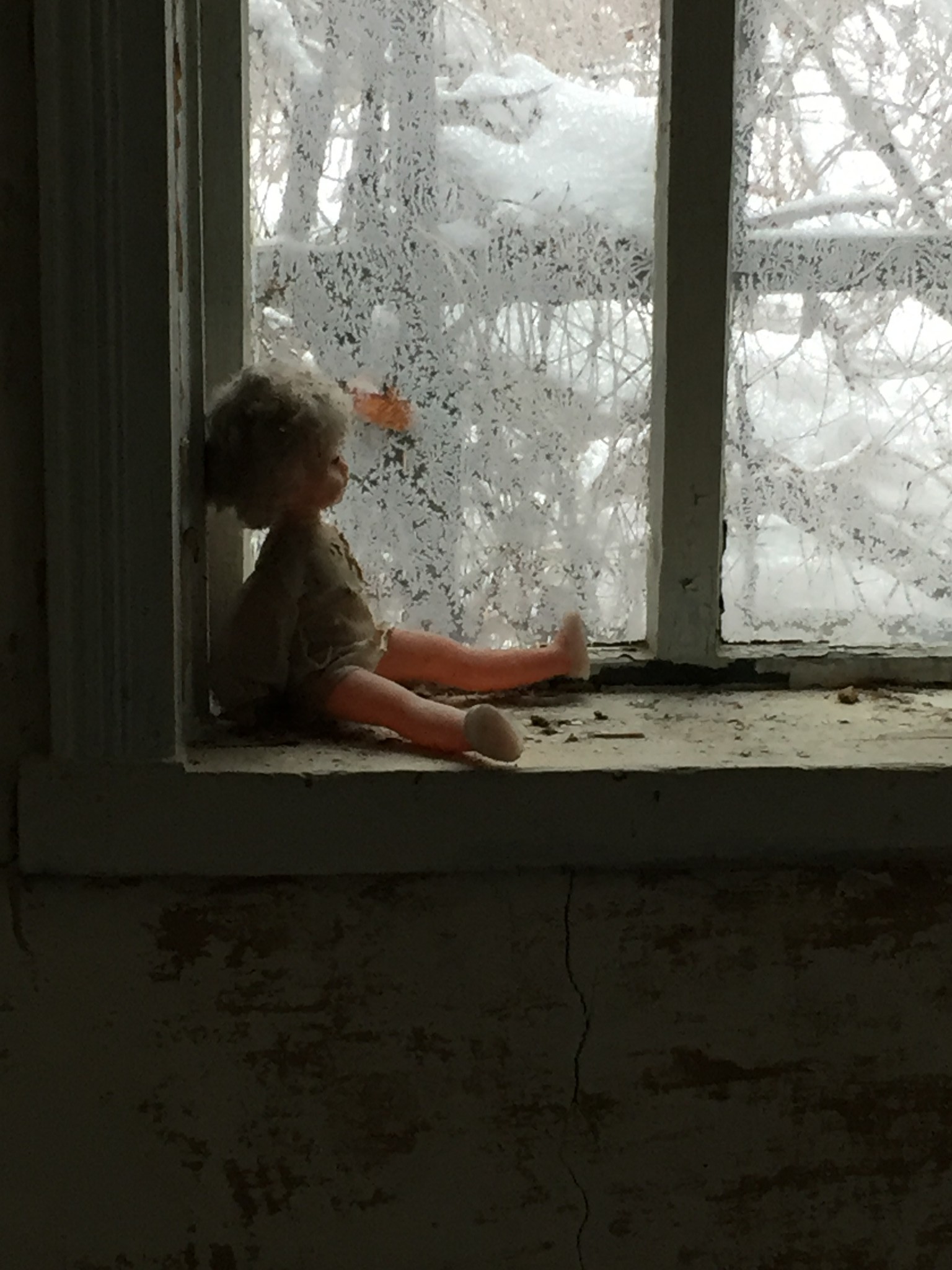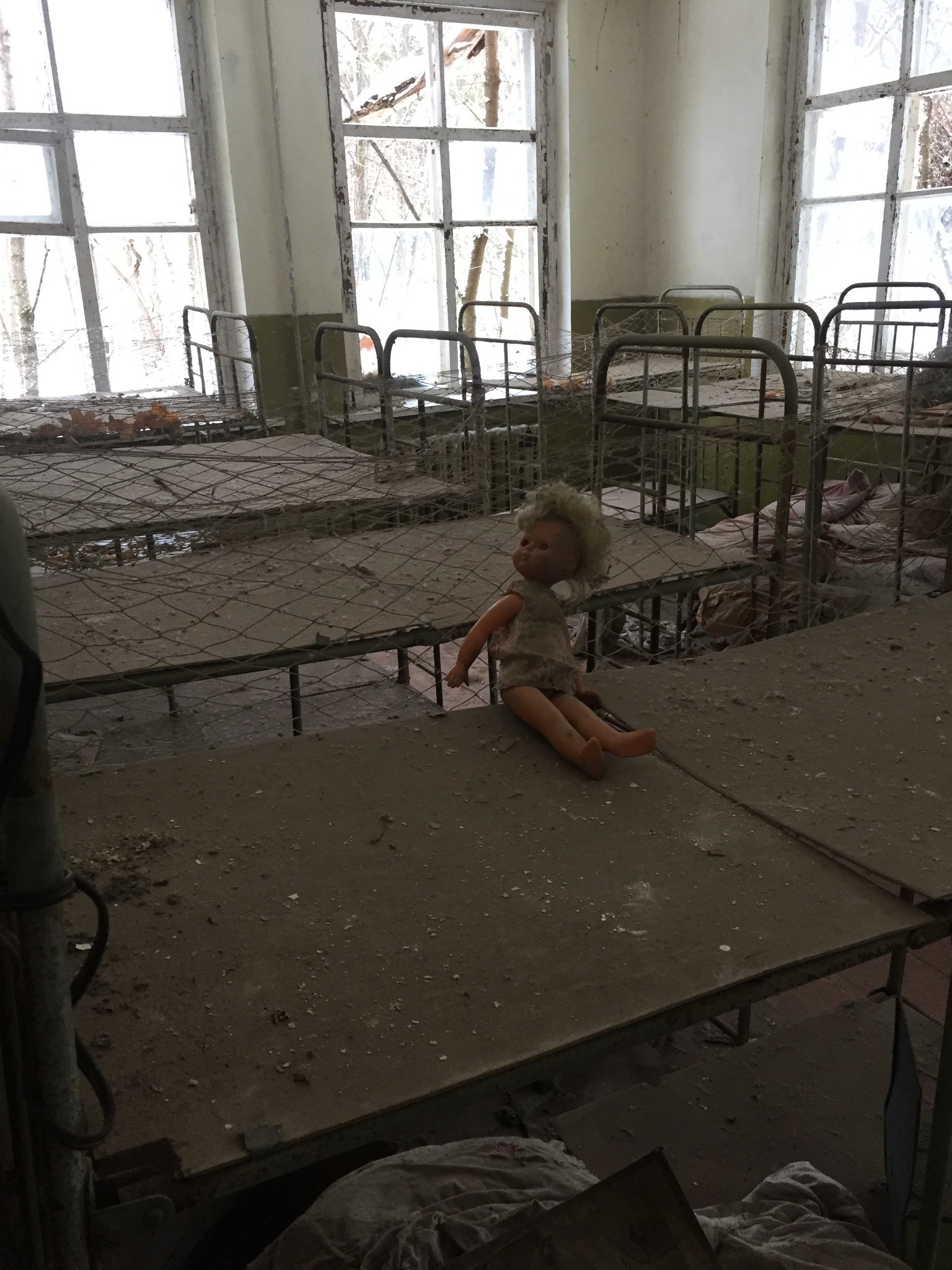 在去4号反应堆路边废弃的应该是座当时临时医院的建筑内,到处都是残垣,和那只没人会去动的洋娃娃,因为空气中至今还飘散着铀、钚的同位素,还有碘、铯、锶,它们的半衰期日久年深。