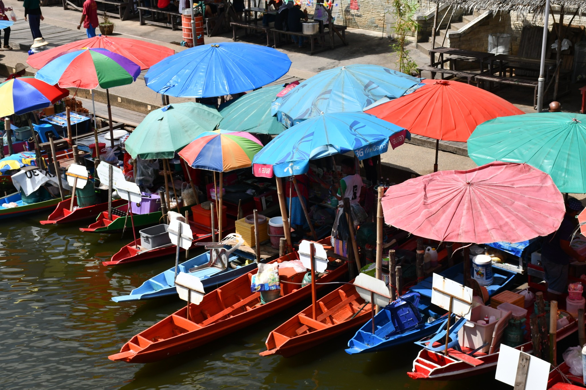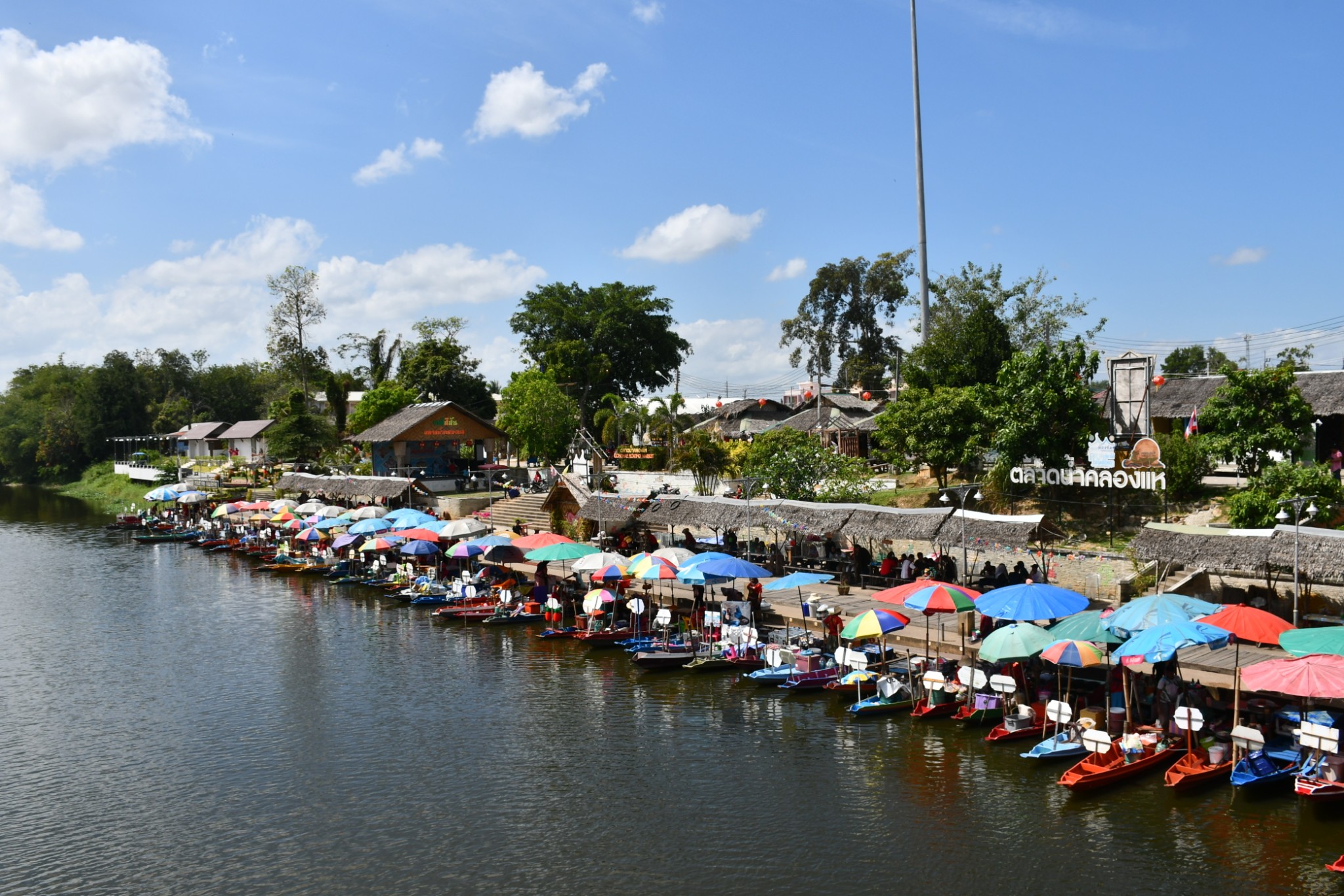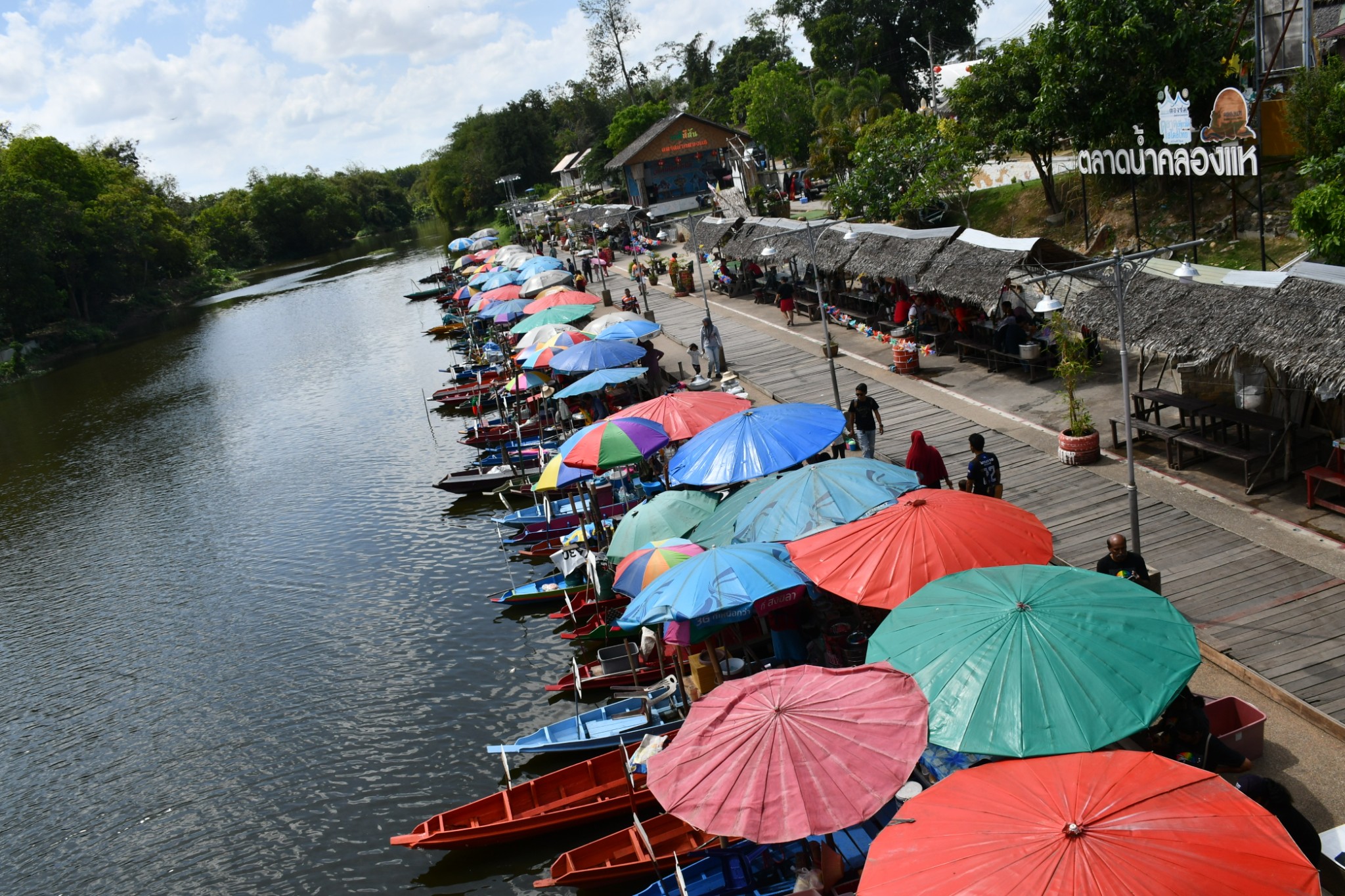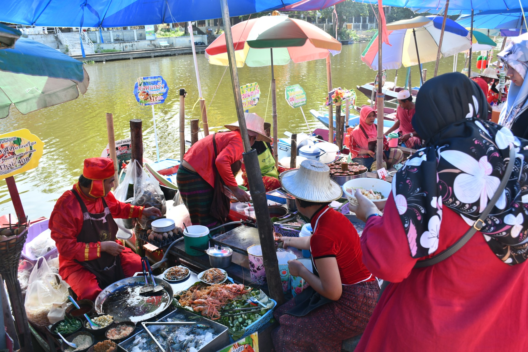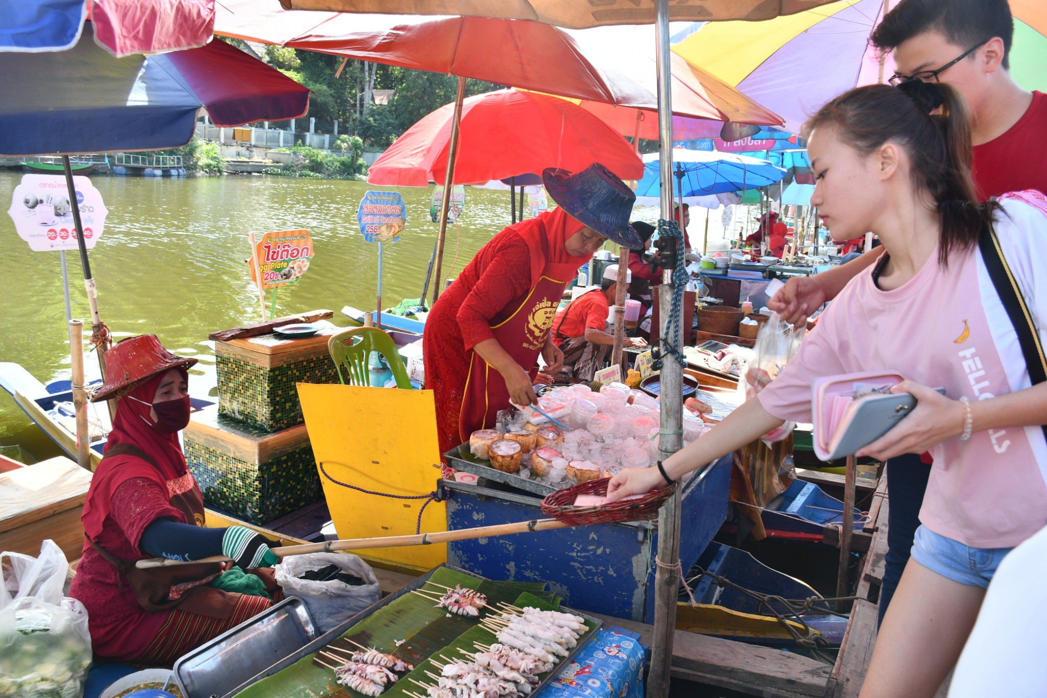 泰国合艾的水上市场只在每逢星期五、六、日营业。我们到达的时候是下午4点多,烈日当空,艳阳炙烤,当时觉得这个时段来这里实在是有点失策。一艘艘扁窄的长方型木舟,密密麻麻地停在河在两岸,令我们感到奇特的是水上市场交易时,坐在船中央的小贩,会通过一把前端装有小藤篮子的长竹杆,将食物置放在篮子内移交给顾客,客户付款时也把现款放在篮子内让小贩收取。在河畔的岸上,有个亚答盖顶搭成的市场,粗略一数有上百个摊档,我点了芒果饭、蜜汁猪扒、炸虾等小食与同伴大块朵颐。这里空间不大,人潮拥挤但井然有序。此刻幸福感满满,就是超级无敌的热,不过我们长年生活在吉隆坡,无惧酷热。