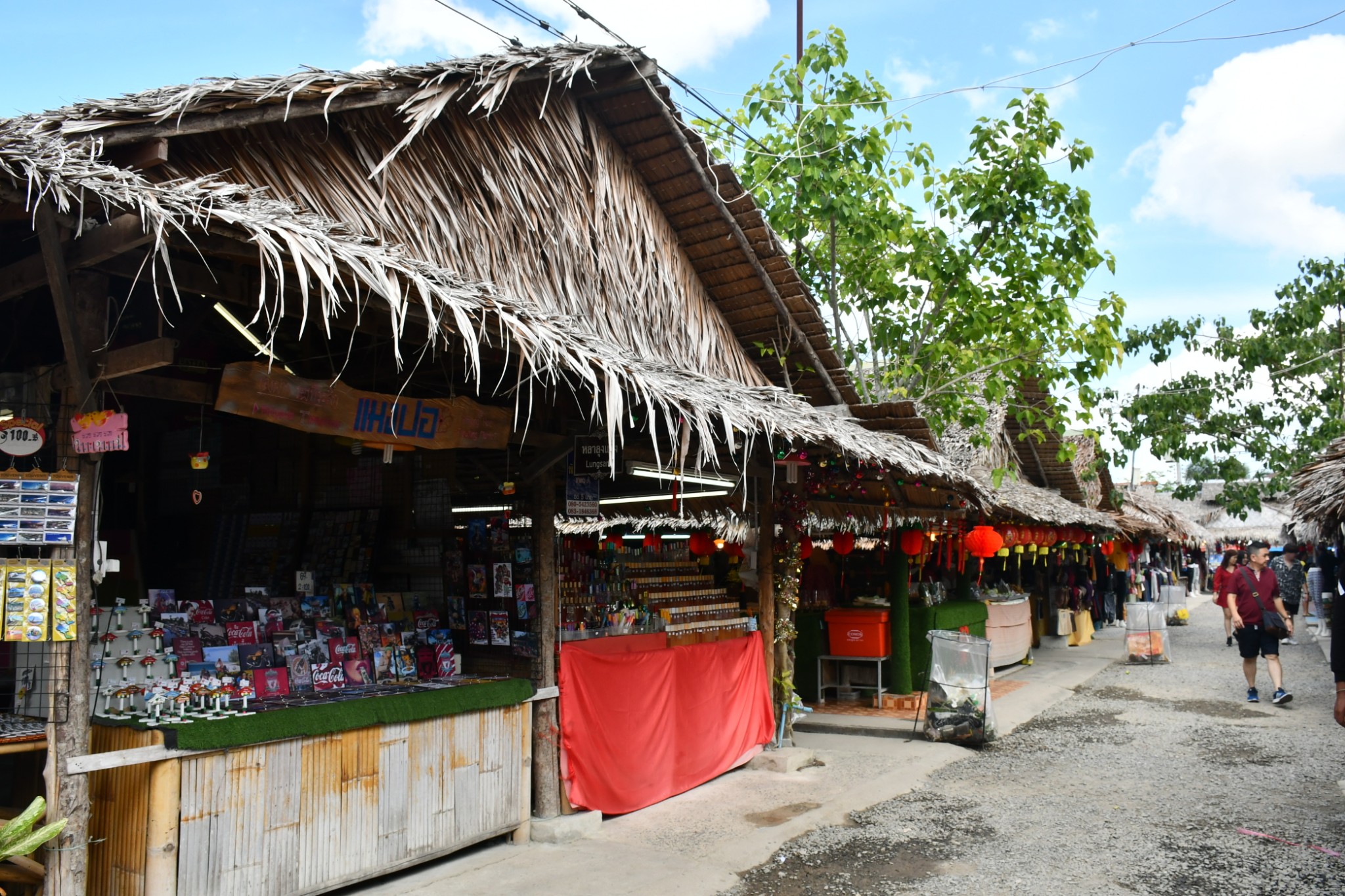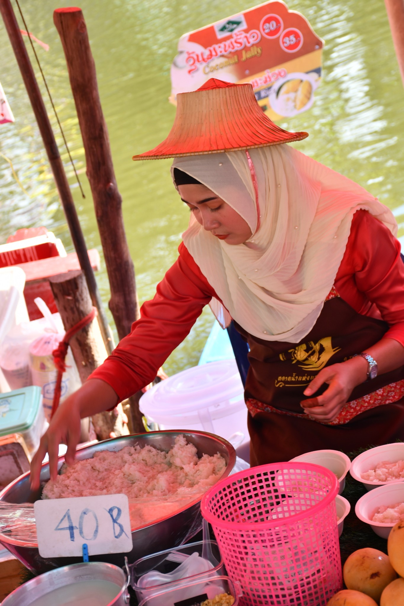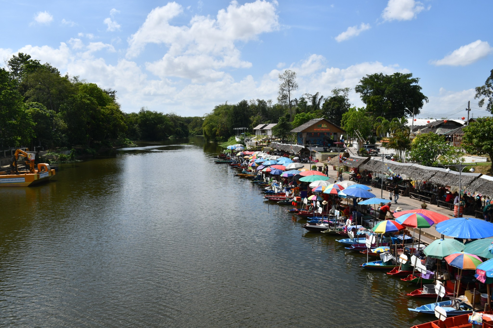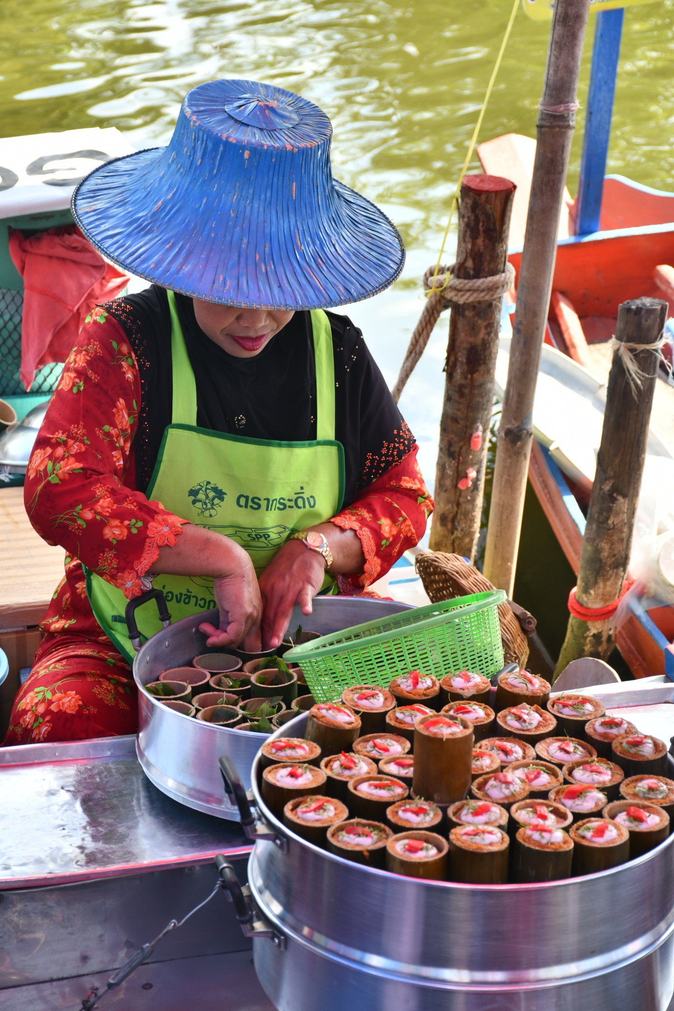 泰国合艾的水上市场只在每逢星期五、六、日营业。我们到达的时候是下午4点多,烈日当空,艳阳炙烤,当时觉得这个时段来这里实在是有点失策。一艘艘扁窄的长方型木舟,密密麻麻地停在河在两岸,令我们感到奇特的是水上市场交易时,坐在船中央的小贩,会通过一把前端装有小藤篮子的长竹杆,将食物置放在篮子内移交给顾客,客户付款时也把现款放在篮子内让小贩收取。在河畔的岸上,有个亚答盖顶搭成的市场,粗略一数有上百个摊档,我点了芒果饭、蜜汁猪扒、炸虾等小食与同伴大块朵颐。这里空间不大,人潮拥挤但井然有序。此刻幸福感满满,就是超级无敌的热,不过我们长年生活在吉隆坡,无惧酷热。