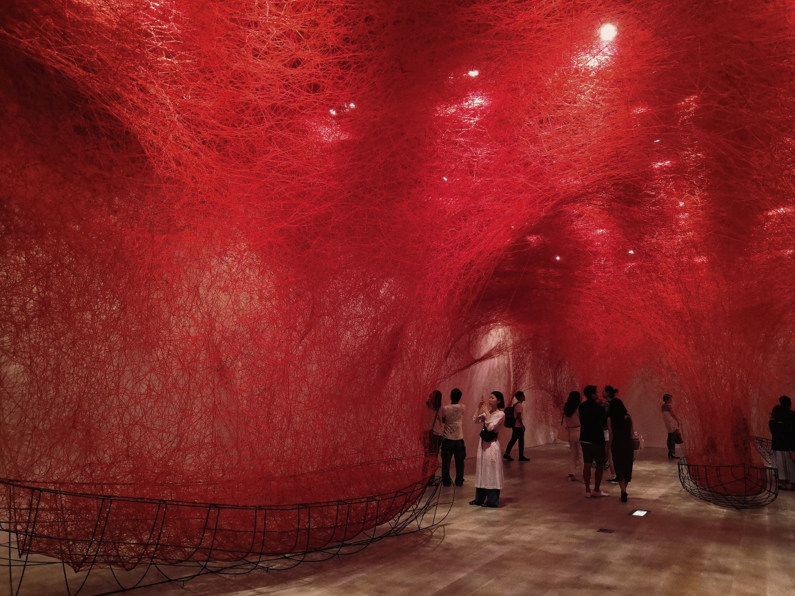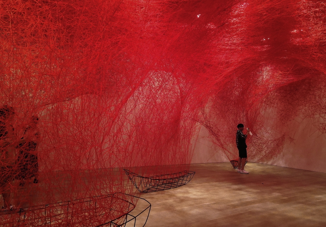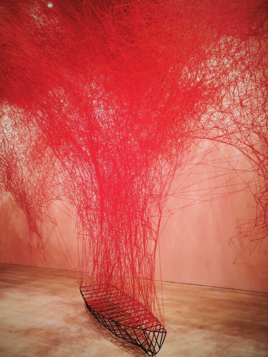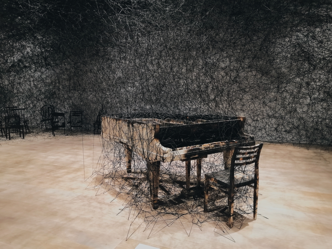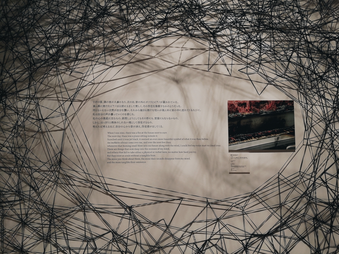 燃烧的钢琴和密密麻麻的黑线牵扯不断。创作灵感据说来自于盐田千春儿时邻居家的一场大火。