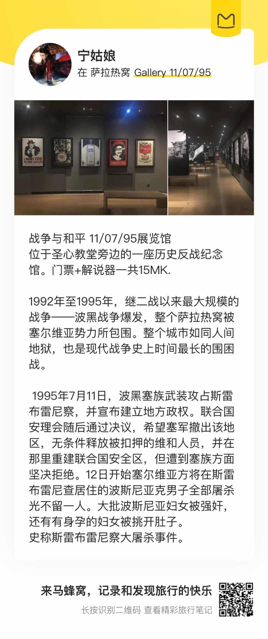 这个月也是斯雷布雷尼察悲剧的周年纪念日,所以一定要参观纪念馆11/07/95展览馆,这里保留了1995年7月发生的事件的记忆。除了固定展览外,展览馆还组织和举办临时展览。目前正在展出的是“ 1993年萨拉热窝的问候”,其中有饱受战争伤害的萨拉热窝的明信片和海报。
