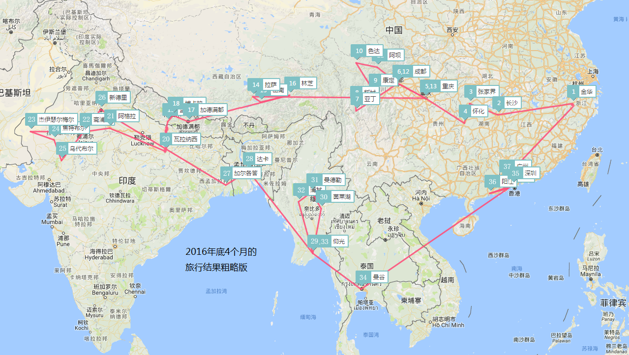 最开始从长沙出发一路向西,途径张家界、重庆、成都、稻城亚丁、色达、阿坝、拉萨、山南、墨脱、林芝,于是两个月过去了。接着,从吉隆口岸陆路出境尼泊尔,加德满都、博卡拉、蓝毗尼;然后陆路进入印度,瓦拉纳西、阿格拉、斋浦尔、乌代浦尔、杰伊瑟尔梅尔、焦特布尔、新德里、加尔各答;飞机入境孟加拉国,达卡和Cox's Bazar;接着飞到缅甸首都,仰光、莱茵湖、曼德勒、蒲甘;最后一站飞到曼谷,在曼谷短暂逗留5天之后回到广州。