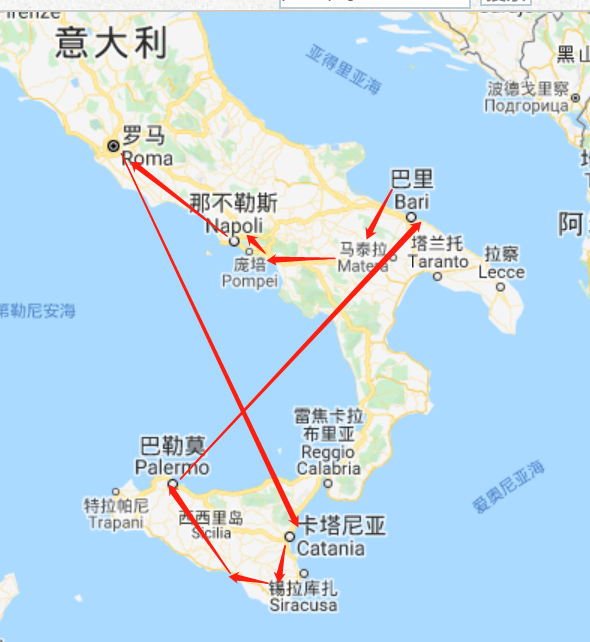 中间不是没有想过删掉其中一个,毕竟按照网上大部分的攻略,常规是从罗马--那不勒斯--阿马尔菲海岸--马泰拉,再返回那不勒斯,然后坐船或飞过去西西里(全程起码4天),环西西里基本要6-7天,中间还得预留飞回罗马坐飞机的时间,看起来似乎是不可能任务。可惜权衡再三都舍不得。最后,被我找到了每两天才一班的从西西里巴勒莫直飞巴里的航班,于是我选择先走西西里,然后从巴勒莫直飞巴里,再从巴里自驾经过alberobello、马泰拉、阿马尔菲海岸最后回到那不勒斯,再回罗马,全程不走回头路。