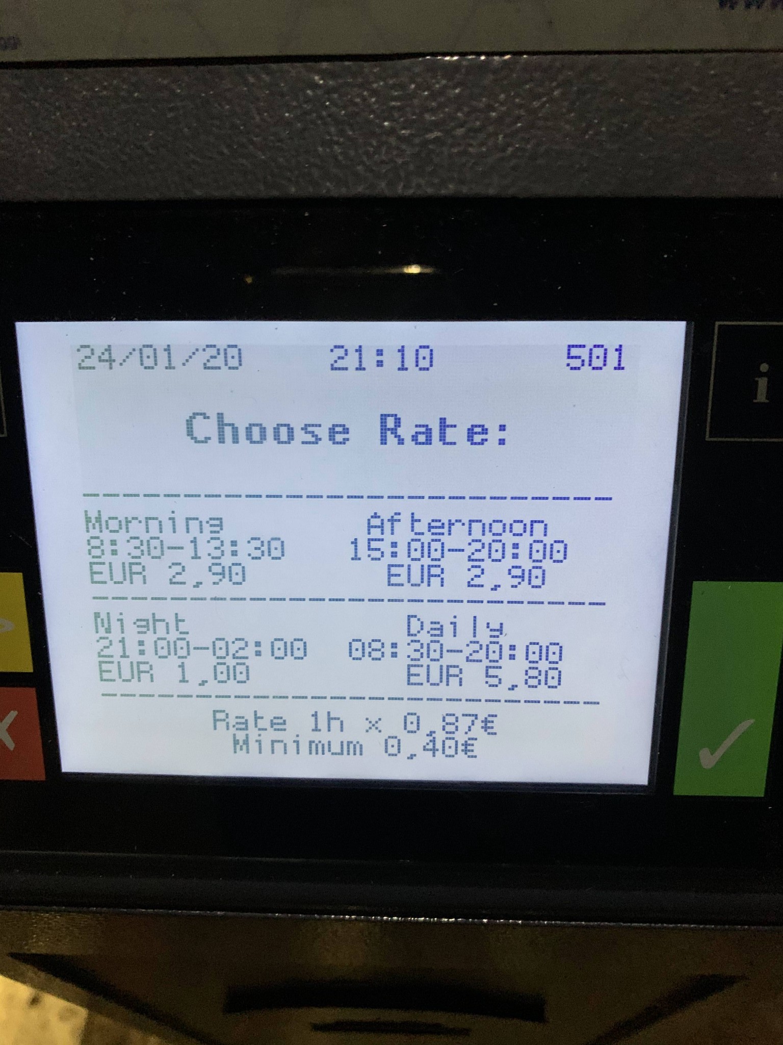 1、自助咪表:说实在这个东东我至今没太搞懂过,主要是在卡塔尼亚时碰到(也是本次自驾的初段,一碰到就头皮发麻,每次问当地人都是由于沟通不畅最终直接是他们帮我弄,而我最终也没搞懂)。刷卡似乎是可以的,但大部分人都是投币,部分机器没有英文。唯一要说的是,像在西西里大部分地方,晚上8点到第二天早上8点半前停车都免费,唯独在卡塔尼亚中心会加收一个晚上9点到凌晨2点的费用(下图黄色部分),而且好像周日也要付。购买成功后将车票放在挡风玻璃处即可。