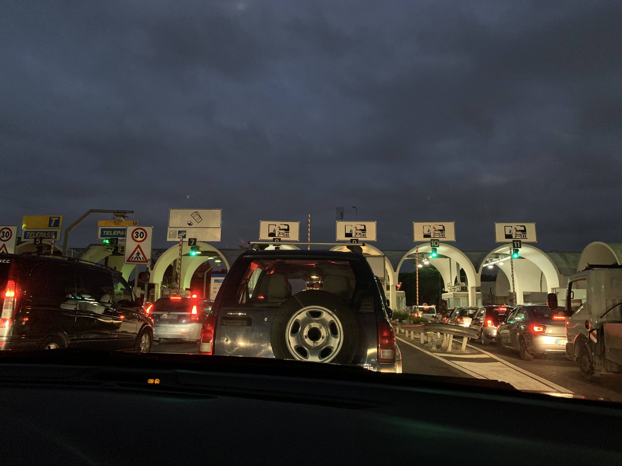 2、城市间路况。西西里的收费高速只有一条,就是卡塔尼亚到陶尔米纳那段,务必走高速,不到2块欧元,比不上高速节省一小时,而且路况好多了,高速出口有人工收费(见下图,跟国内差不多,但千万别走左边的telepass,那是类似我们的ETC)。卡塔尼亚到阿格里真托的路,中间不时会从高速接驳到类似国道、省道,而且有时谷歌会导航到一些奇怪的山路,有一次我们遇到一个很陡的窄坡差点都过不去。从土耳其阶梯到夏卡,基本都是乡道,两车道没有隔离带没有路灯,还经过了没灯的隧道,我们还走的是夜路(下午5点就天黑了),但周围的车都不断飙车、超车,是这次自驾中最害怕的一段。(千万别在西西里走夜路)。