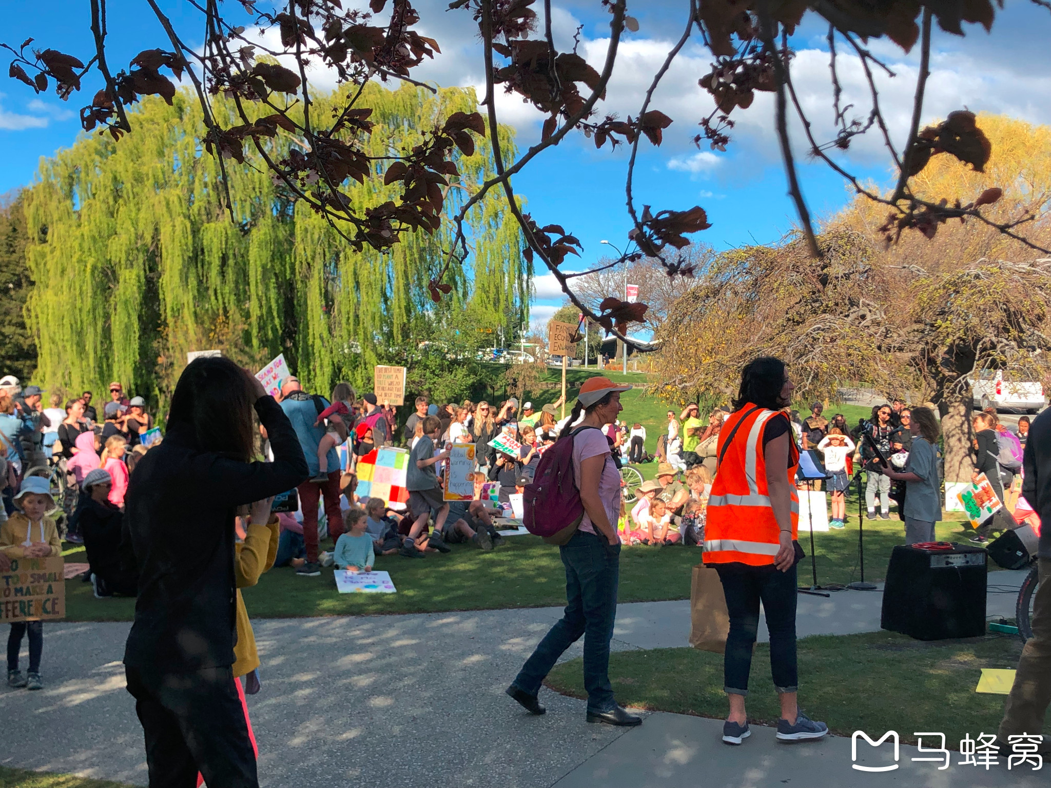 走到湖边,发现居民们举着标语,不时有孩子在话筒前自弹自唱,人群不时爆发出掌声和谈笑声。