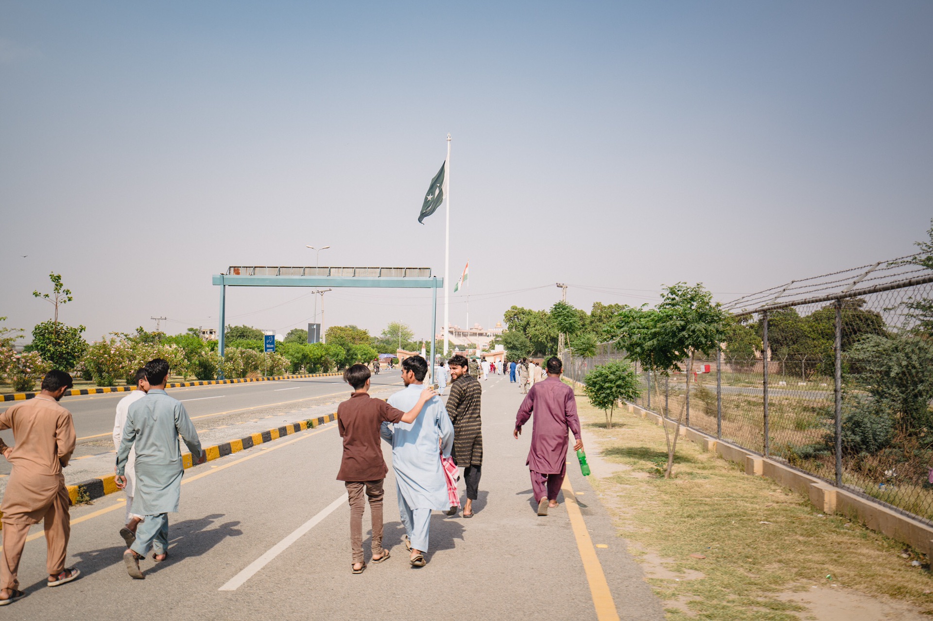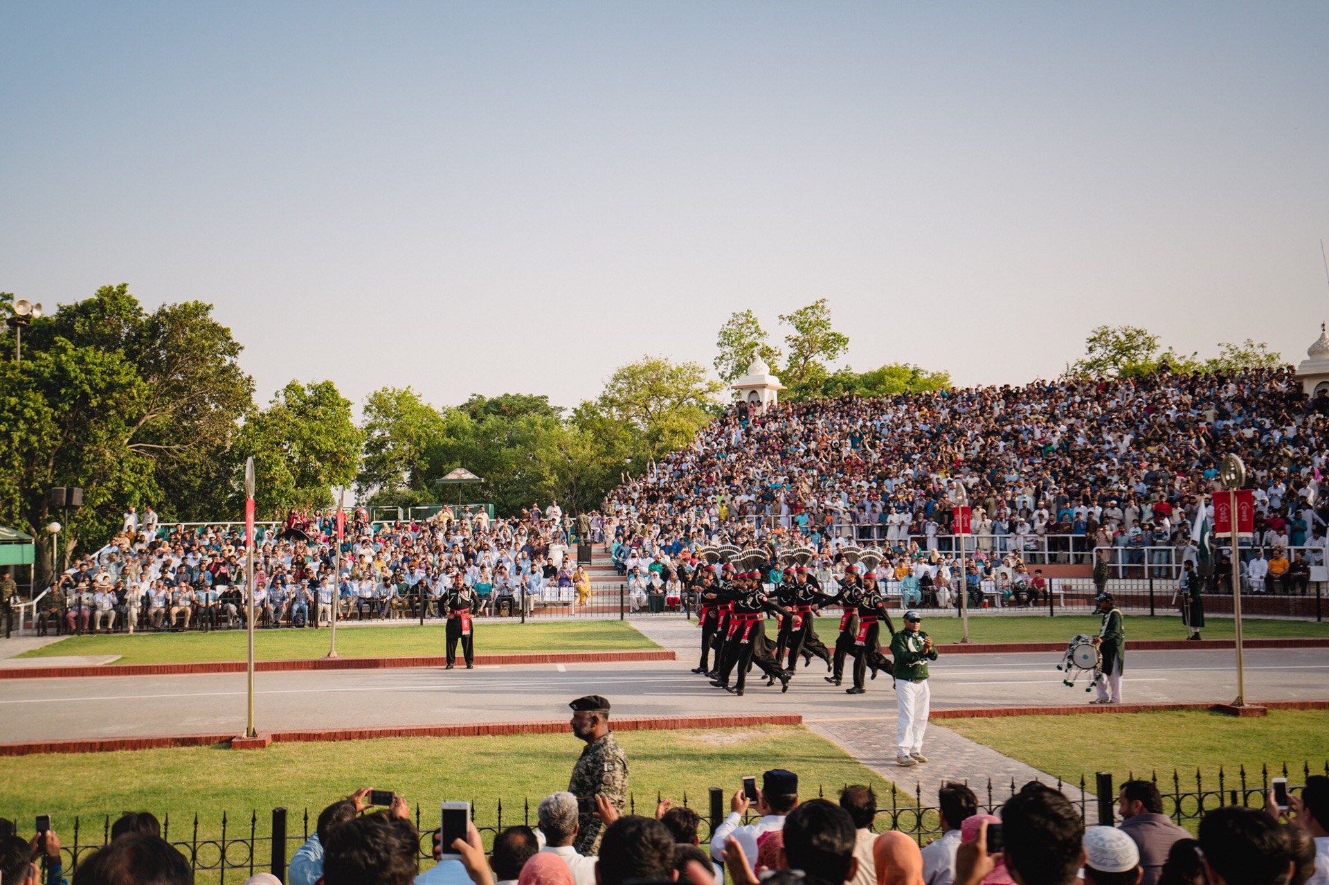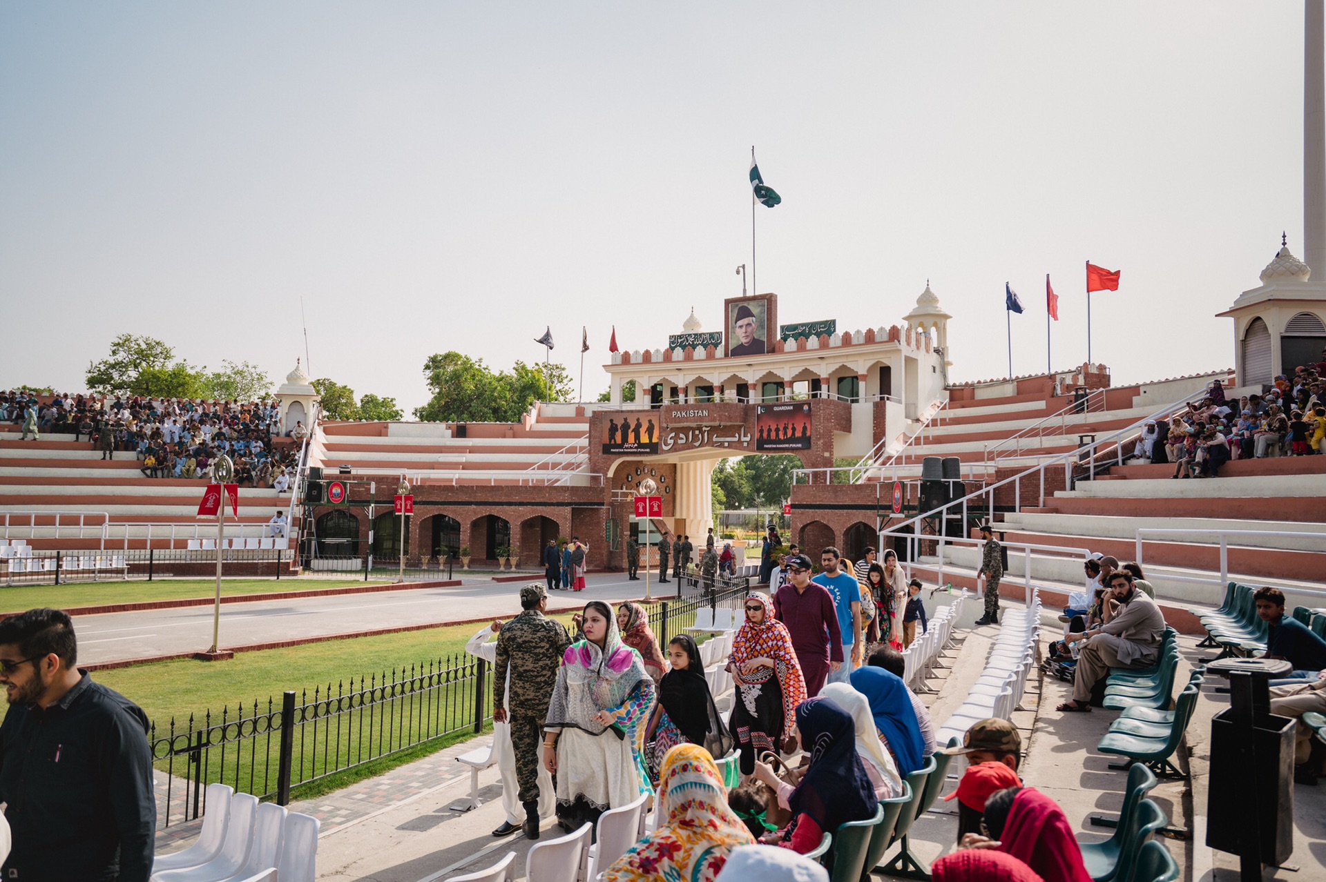 降旗仪式是四点以后开始,我们提前了一个钟头左右到达还是发现早已排起长龙,本来我们想着老老实实地排队,谁知tutu司机直接把我们拉到队伍的最前面,与边境军官对话了一下后,他们直接让我们排在了第一位!在军官示意我们站在首位之前,热情的巴铁们就早早地、热切地想让出他们的前排位置了。不仅如此,在拉合尔,不论我们走到哪里都会有很多“锲而不舍”想与我们合影的巴铁们,很多时候真的难以脱身。
