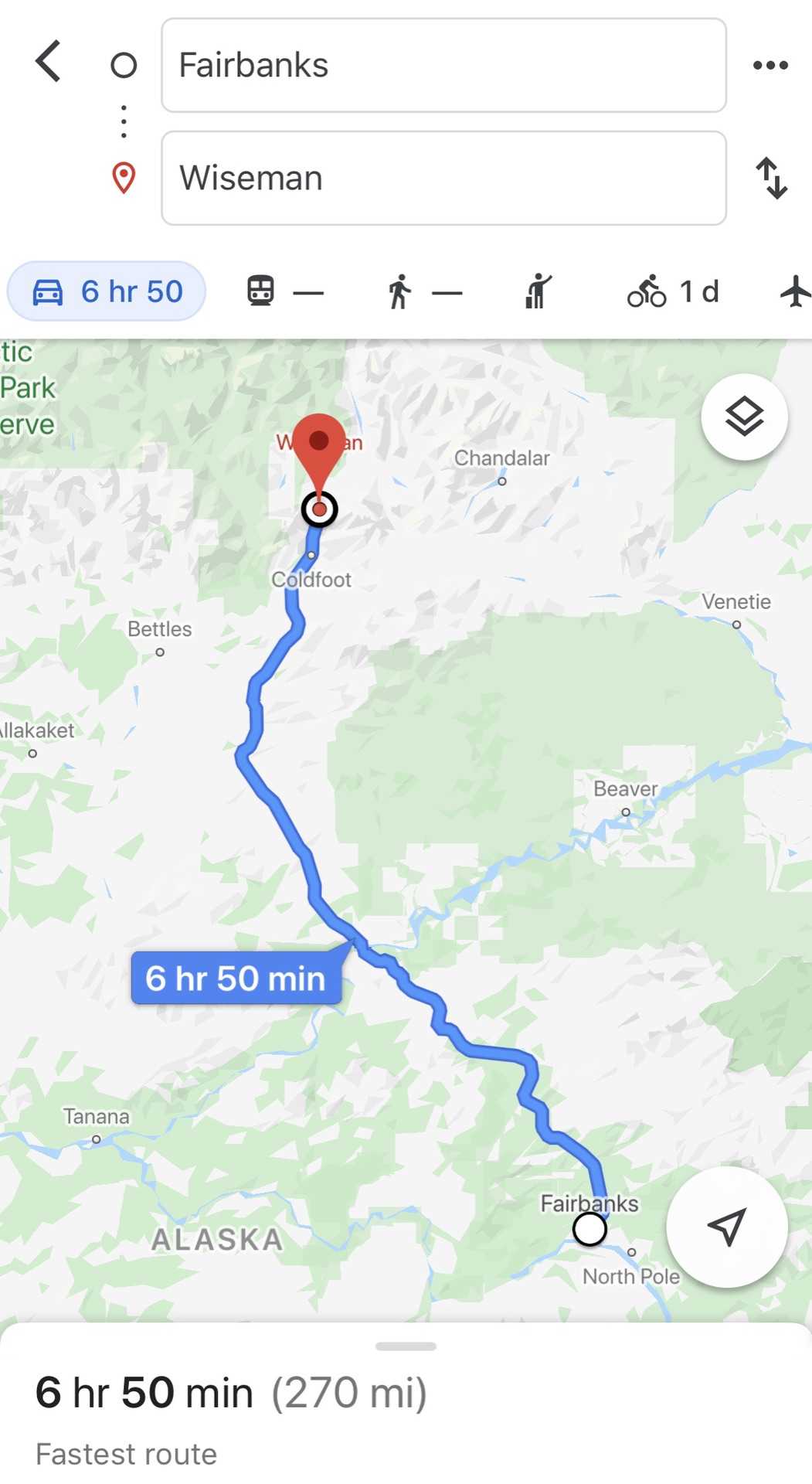 我们定在了10月中旬出发,定在这个时间完全因为我们9月各自安好庆祝完生日,然后各自从自己城市出发,没有想太多。后来发现这个时间点出发,有优点也有缺点。阿拉斯加的北极光期从每年9月开始,因此10月的极光已经开始规律地出现,而这个时候阿拉斯加才刚进入秋冬之交,天气不算太冷,查了往年同期温度也就是零下十度左右,体感不会太难受,尤其夜晚要在室外呆很长时间等极光,温度太冷容易受不了。这个时候通常还没下雪,或只是初雪,在自驾路上危险程度大大降低,不用担心雪路问题。但是这个时间正因为还无厚雪,我们注定错过了阿拉斯加犬拉传统的雪橇体验项目,也看不到茫茫的美丽雪景。但凡事有利弊,时间再晚,一旦雪路形成,就无法自驾进入北极圈了。要想进入,只能参加当地旅行社的一日游,由专业的房车带着旅客进入北极圈,看完极光当晚半夜再出圈,倒是轻松,但少了太多意思。
