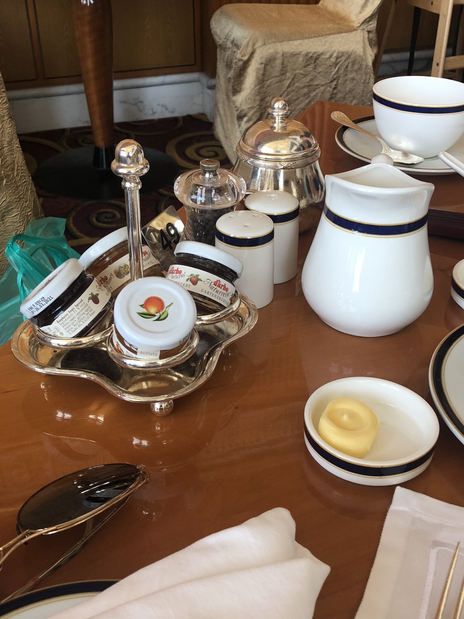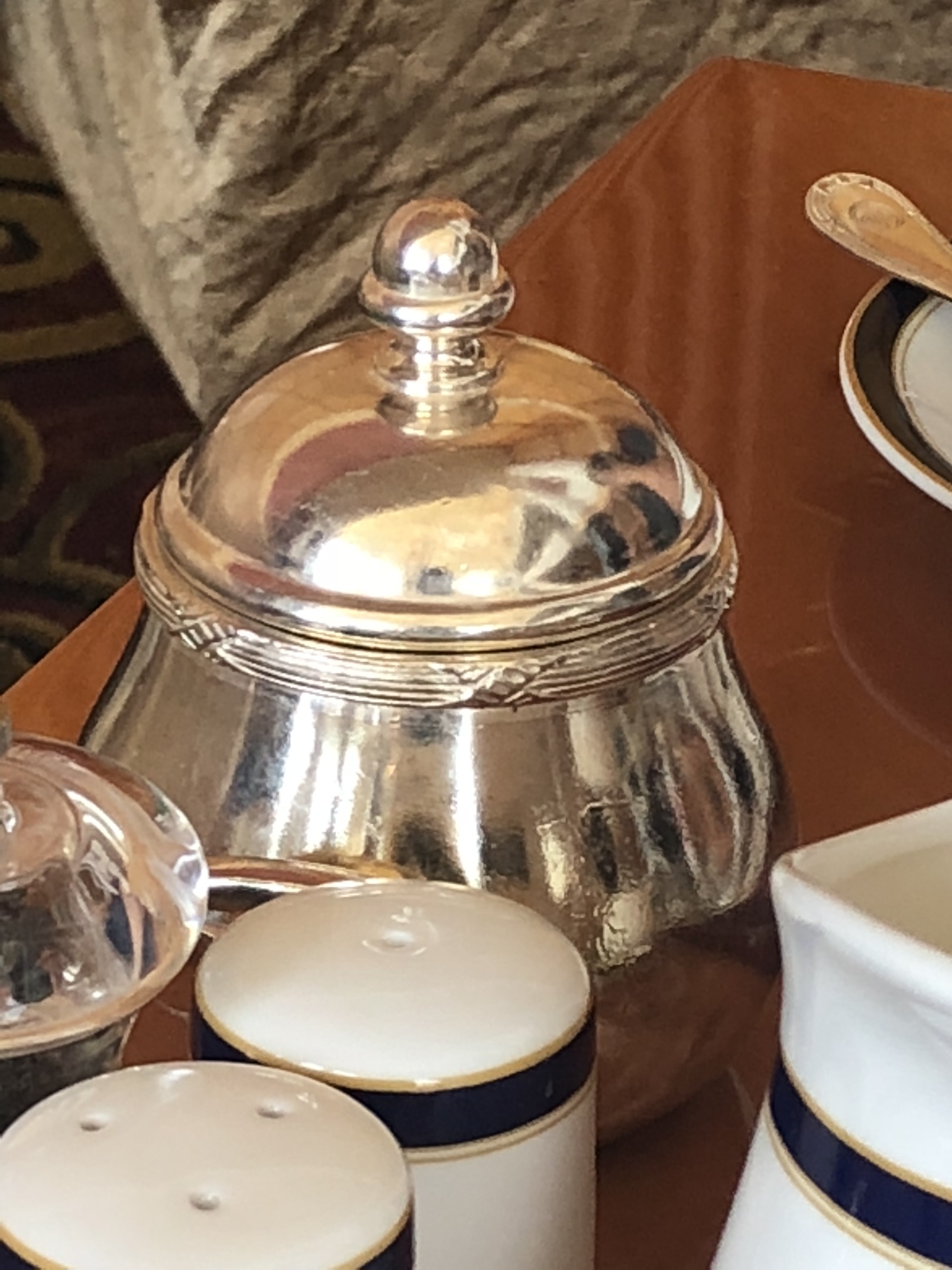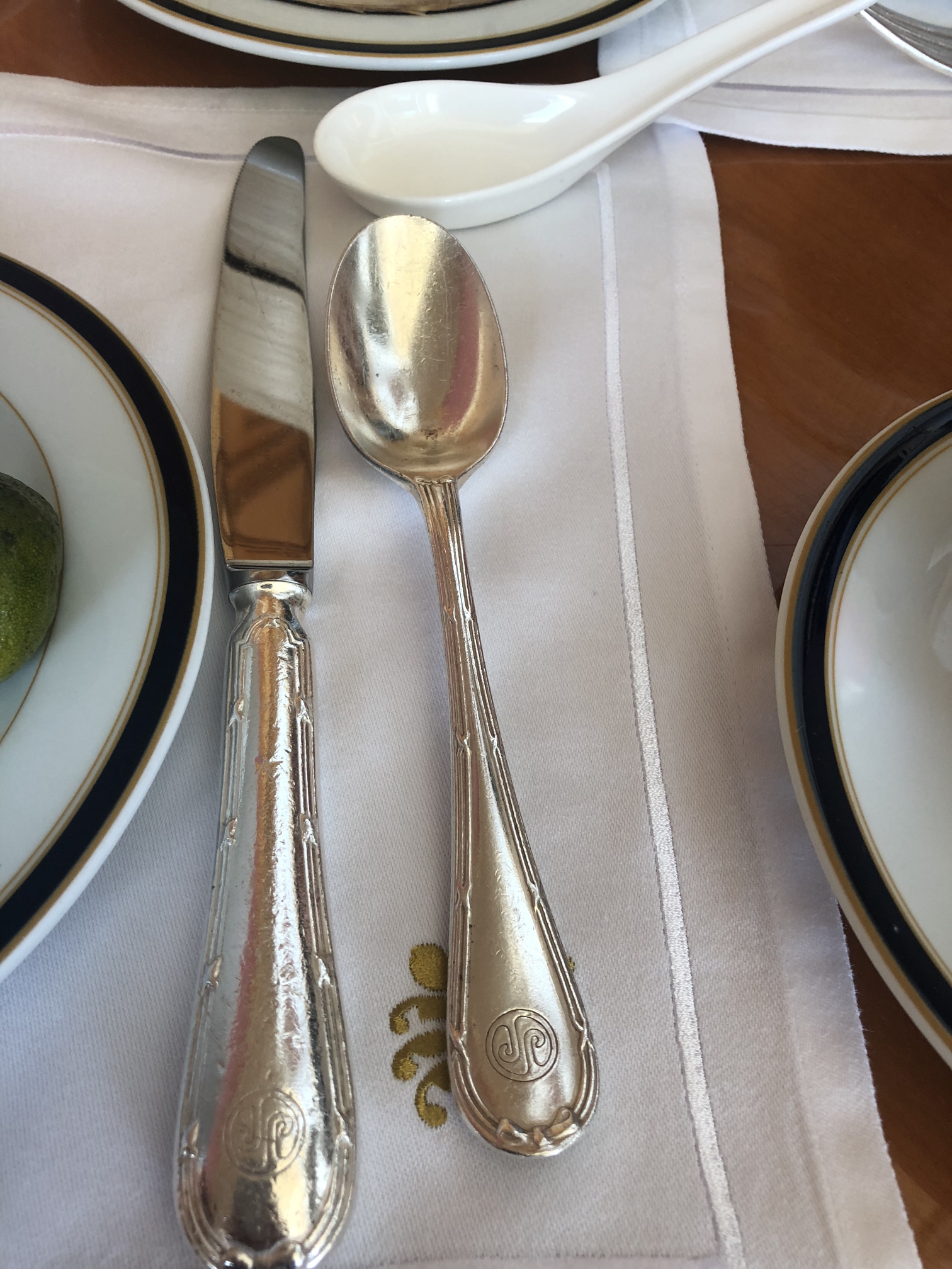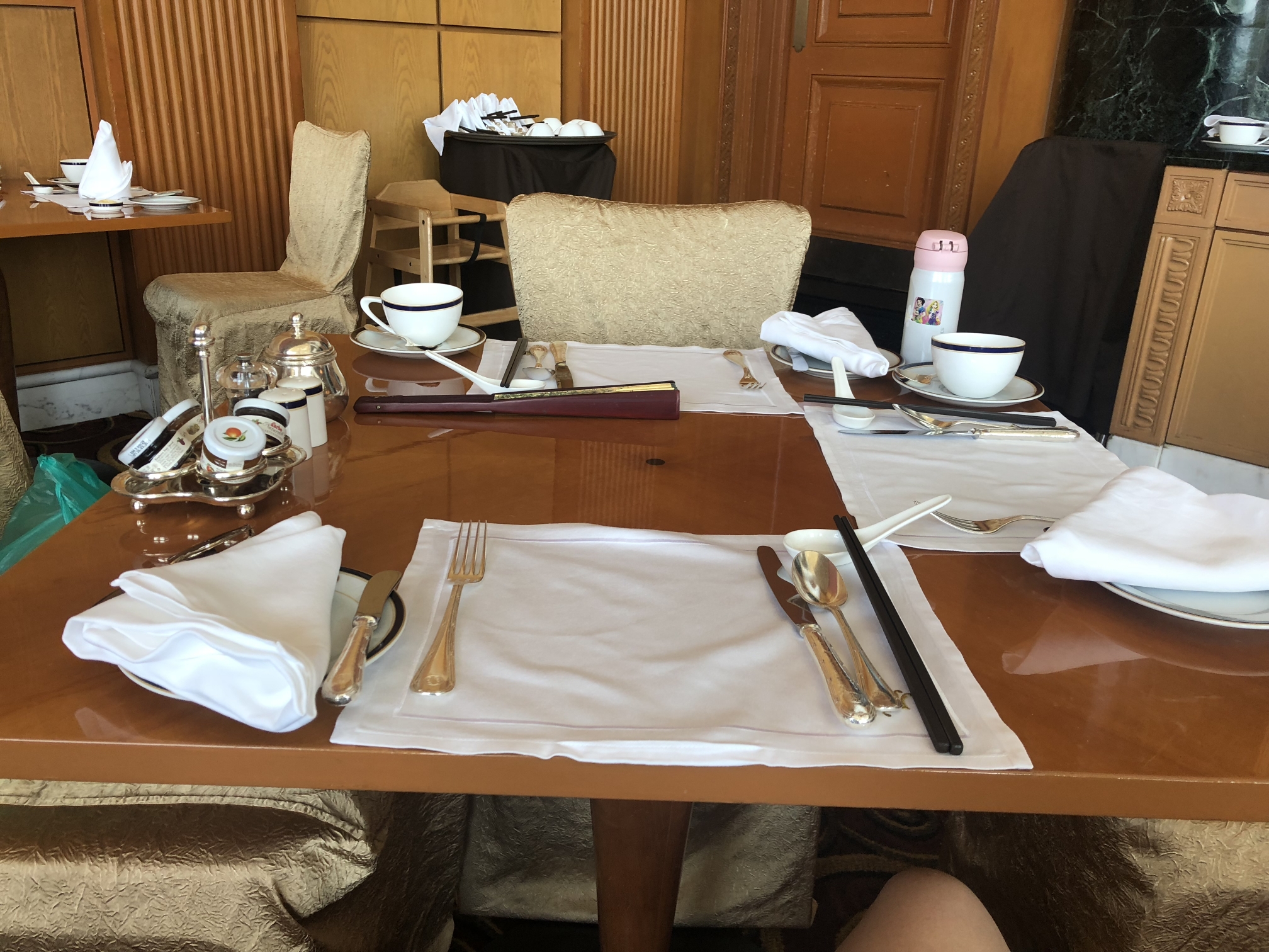 银水壶,不好意思吃饭的时候一直对着餐具拍,嘻嘻!餐厅里面吃饭的人大都穿着正装,我们一家穿了短裤和拖鞋,显得有点儿格格不入!
