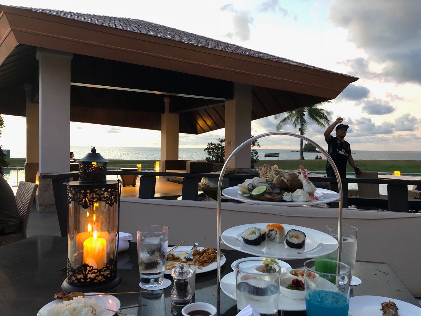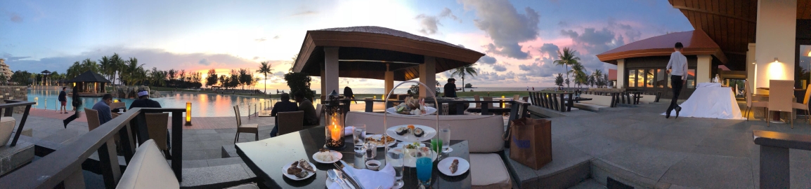 酒店的自助晚餐,据说很有名,价格好像跟国内的五星自助差不了多少,就在泳池边上,但是需要预订,可以看到无敌水景,晚上好饿呀!决定去大吃一顿!由于没有预订,跟小哥搭了搭话,小哥看我还带着娃,吃不了多久,就给我们找了个水边的座位!可惜大失所望!真的不好吃啊!