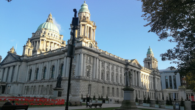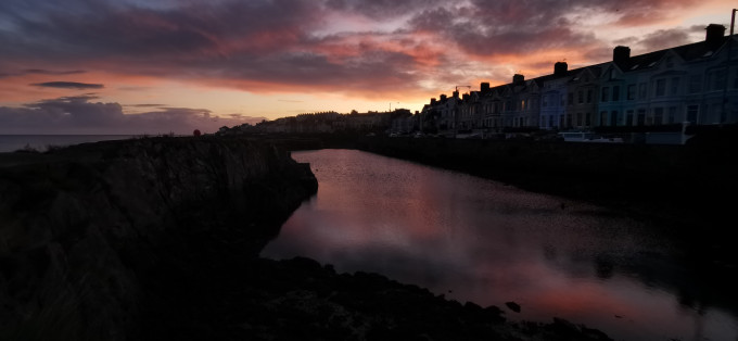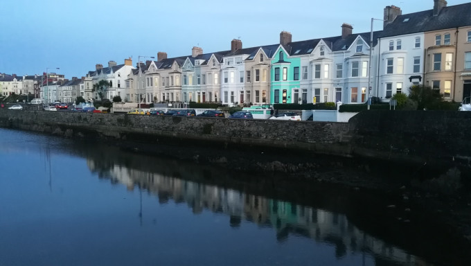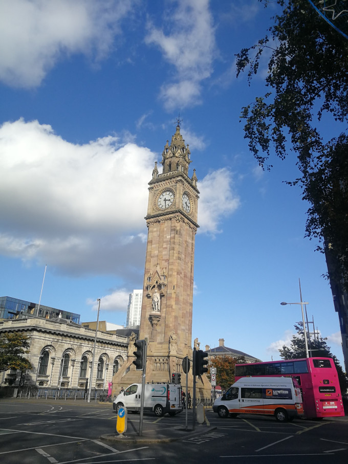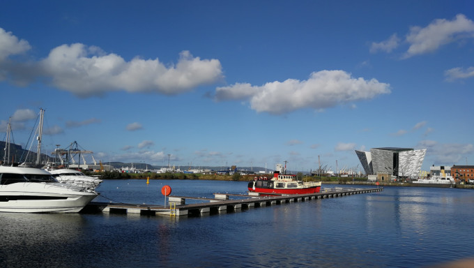 卡莱尔乘坐大巴一路欣赏美丽的苏格兰海岸线和当地近乎原始的乡村风光。 之后从苏格兰西南港口凯恩莱恩坐最先进的【超级快速豪华游轮】,下午抵达北爱尔兰的最大海港城市贝尔法斯特。参观泰坦尼克号纪念馆、阿尔伯特纪念钟楼(由于钟楼地基的问题,钟楼建成后即有所倾斜)、贝尔法斯特市政厅。由于司机开错路,错过了市政厅入内参观的时间。只能外观这个澄净的城市。在英国晴朗的天气并不多。入住的宾馆在附近一个宁静小港,等待落日后的辉煌,小港有两家中餐厅,正好入住两晚,一天吃一家。