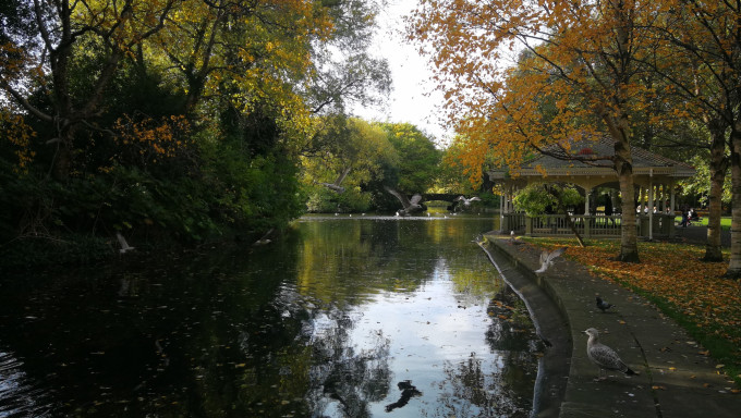 从贝尔法斯特到都柏林又3~4小时,今天的大多数时间在路上,有机会最好爱尔兰自驾游。圣三一学院、半便士桥Ha'penny Bridge(横跨利菲河)、都柏林尖塔Dublin Spire(又称为“光之纪念碑”Monument of Light)、格拉夫顿街购物街Grafton Street、圣马丁圣尼古拉斯大教堂。都柏林有一条中餐馆街,在这里一定能找到合适自己的。今天又是阴天,直到下午路过一个公园,突然放晴。我们又愉快地喂起了鸽子。