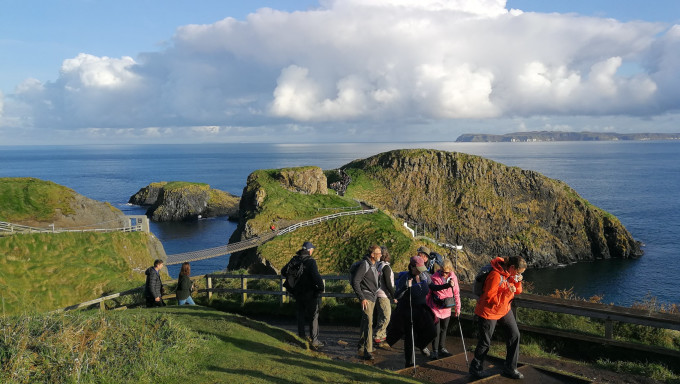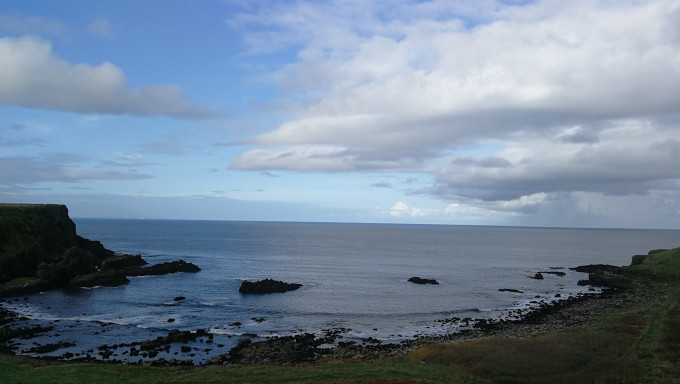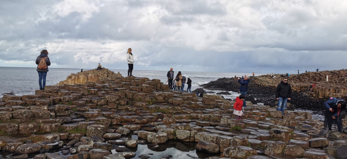今天又是忙碌的一天,回到卡莱尔酒店,错过了饭店,饿了一晚上。正好也累了。但是今天的天气相当给面子。索桥(Carrick-a-rede)→巨人之路(Giants causeway)→黑暗树篱(The Dark Hedges)。距离贝尔法斯特大约2小时路程,这三个景点之间距离较近。如果是自由行,黑暗树篱可以忽略。巨人之路是由总计约4万根玄武岩柱(同济州岛的柱状节理)组成的6公里海岸,石柱连绵有序,平整光滑,却又高高低低,参差不齐,呈阶梯状延伸入海,1986年被列为世界自然遗产。巨人之路是六千年前火山爆发后的结果。融化的熔浆从地面弥漫了整个峡谷,接着很快便冷却、收缩并且破裂。