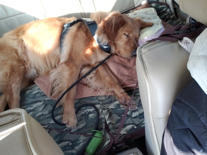 (前情回顾:今年2月回珠海的途中,在瑞金停下休息,疫情特殊时期,原本允许宠物入住的酒店,也不给狗狗进房间了,大帅狗生第一次,独自在车里过夜,天气冷,再加上又是露天停车场,可怜的娃一夜没睡好,第二天看到我们都回来了,才疲惫又安心的倒下,几乎是秒睡,阳光那么温柔的撒在它身上,这娃一路上睡得那个香甜啊,看得我好心疼!)