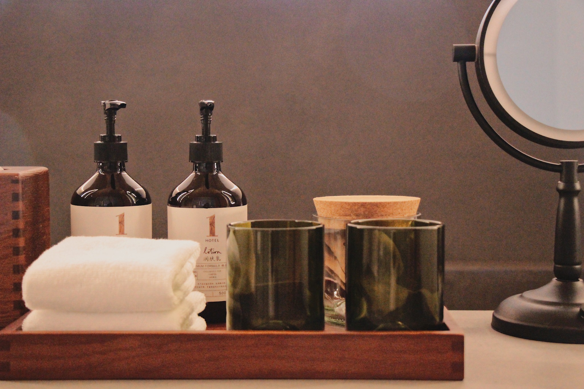洗手池上木质托盘里整齐摆放着洗手液、润肤露,擦手巾,水杯和装东西的小玻璃罐子。然而这些东西里,最吸引我目光的是两个军绿色的玻璃杯。