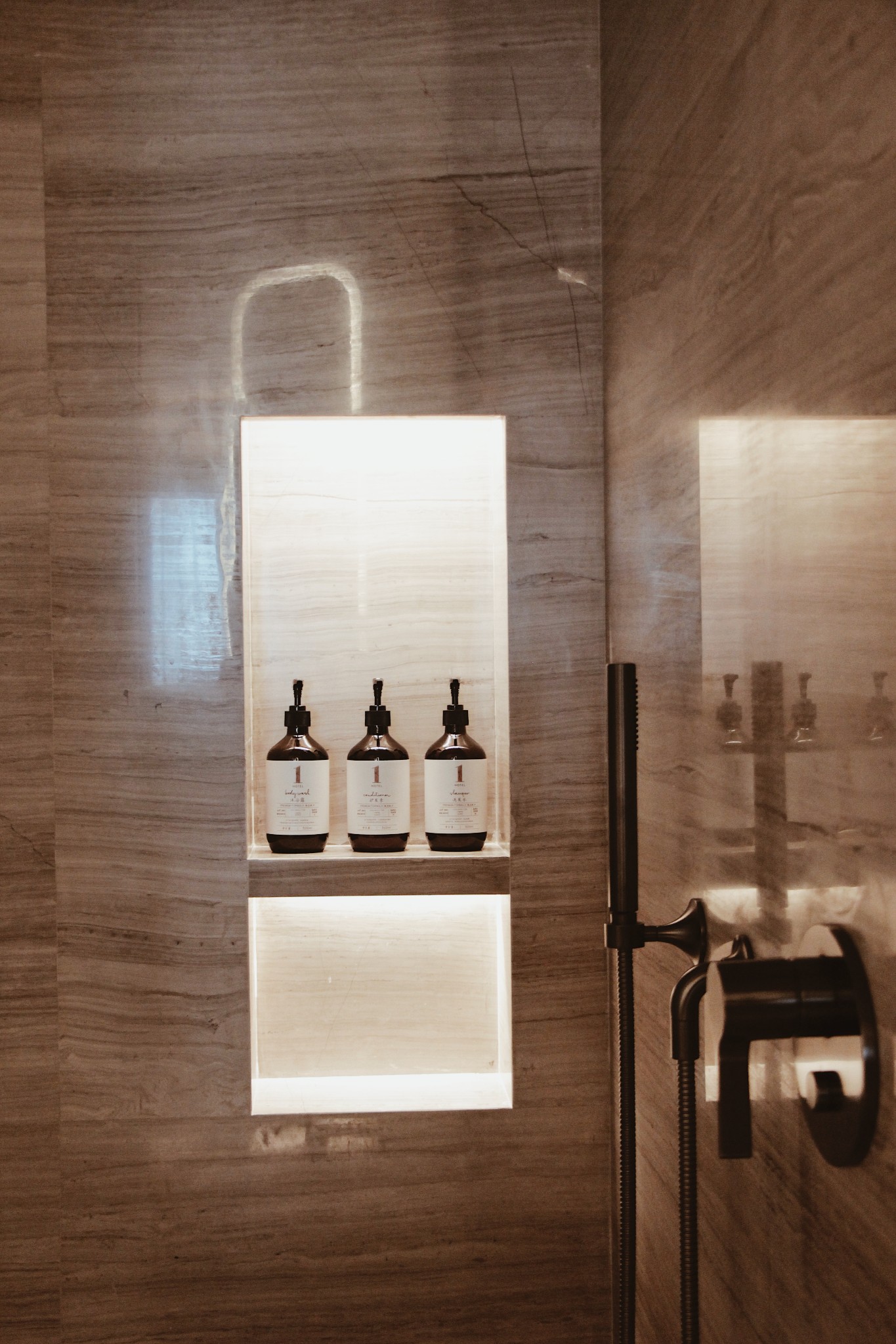 淋浴间没有花里胡哨的装饰,空间虽小但刚刚好,不浪费空间也不感觉狭窄。灰白色的大理石,黑色手柄的淋浴装置,简约而不失美感。