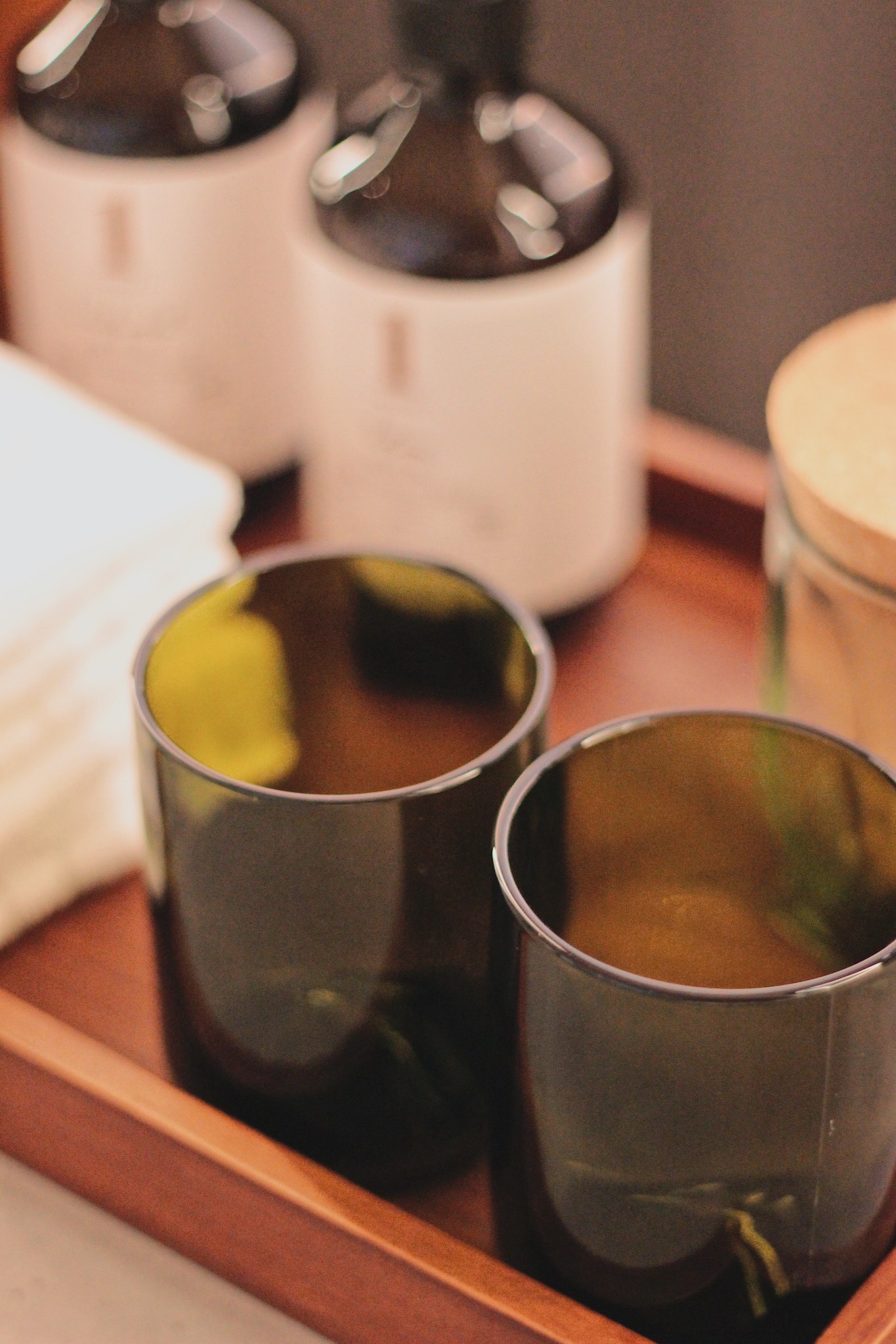 这两个玻璃杯都是由酒瓶切割后打磨瓶口制成的口杯,就连酒瓶的底部的凹槽都还留着,这样环保还给了这些原本会成为废品的物品第二次生命,不过我觉得还挺好看的,真的是用途恰到好处。