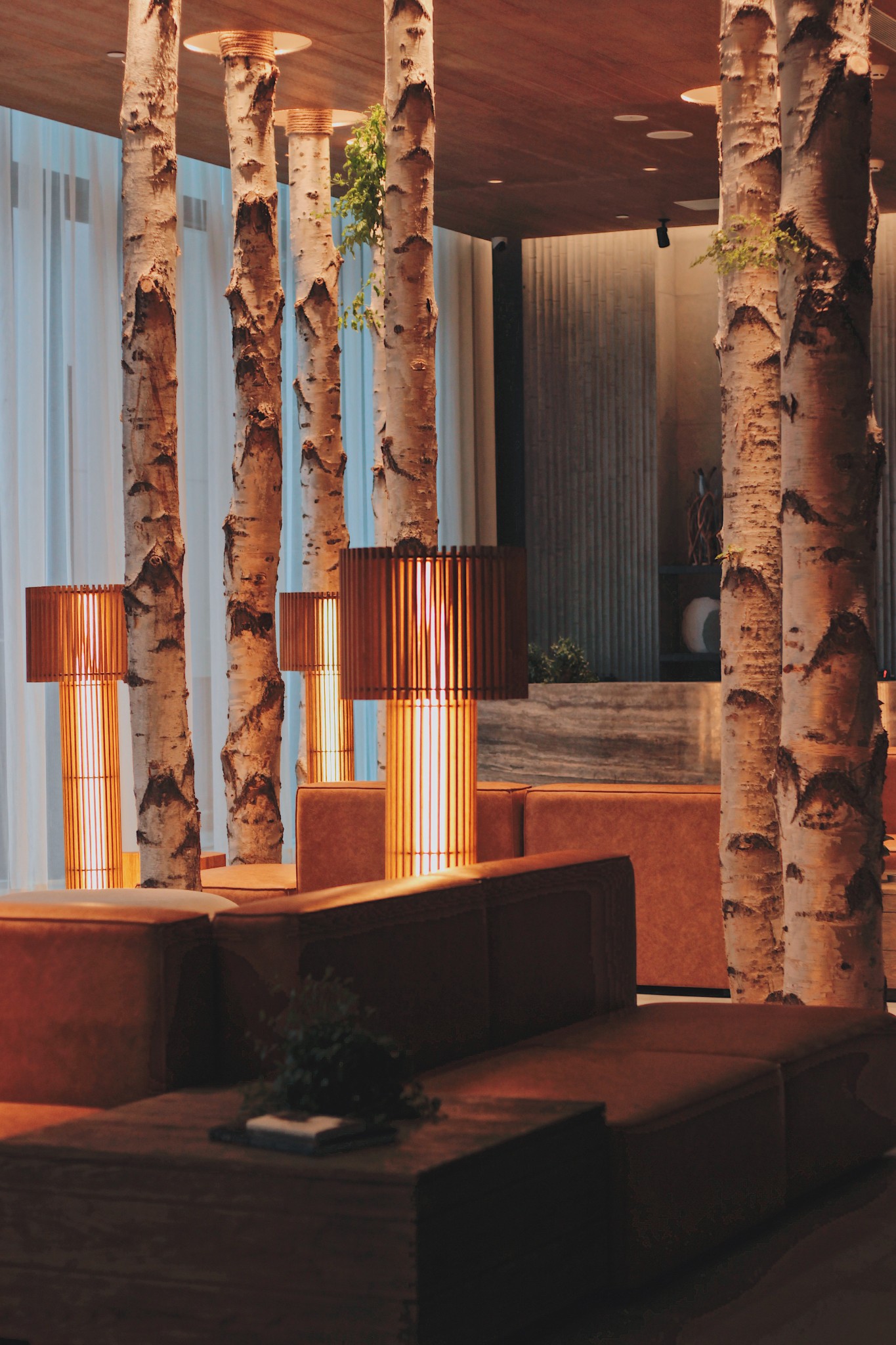 绕过前台,后面的的橘色皮质沙发给人一种安全感,厅内的白桦树原本被风干运到这里,谁知在小岛春天来临之时,也从身体里冒出了嫩芽,大自然的神奇魔力原来真的可以起死回生。