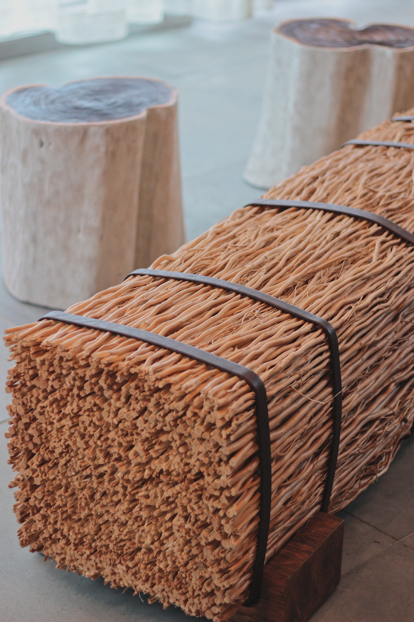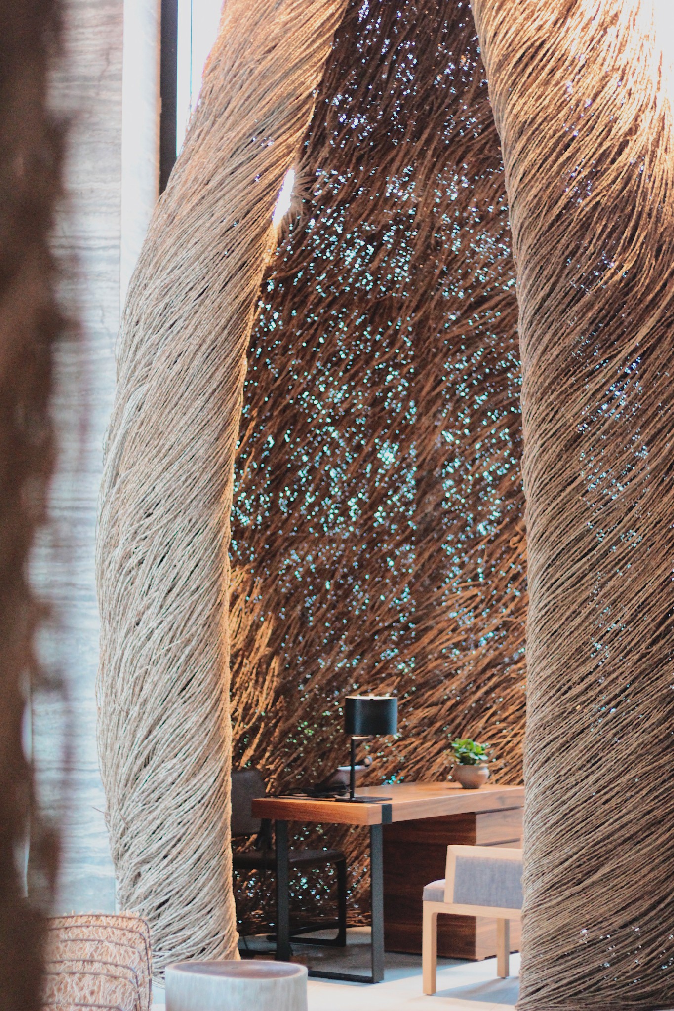 在靠近大落地玻璃窗的地方,有两个巨大的,像是鸟巢一样形状的设计,据说这一根根缠绕着的藤蔓是从台南运回来的,之后再由人们手工编制而成,坐在巢内有种莫名的安全感,像一双巨大的手相拥着。