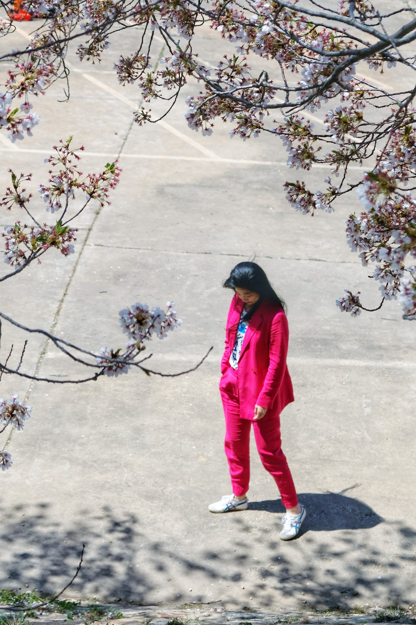 我穿了一套玫粉色的休闲装,大概是觉得樱花太好看,一定要穿的颜色比樱花还要鲜艳,才能在樱花丛中抢到些戏份。