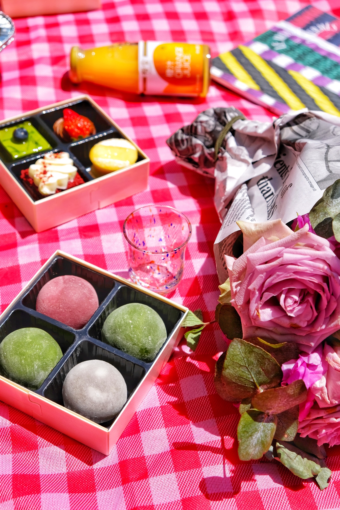 水果和花束是酒店入住的时候赠送的,饮料就直接从minibar里选了几瓶好看的,还借走了樱花主题房里的抱枕和餐具,酒店听说我想去拍樱花野餐,早餐的时候还多给我准备了一些牛角包和小面包。