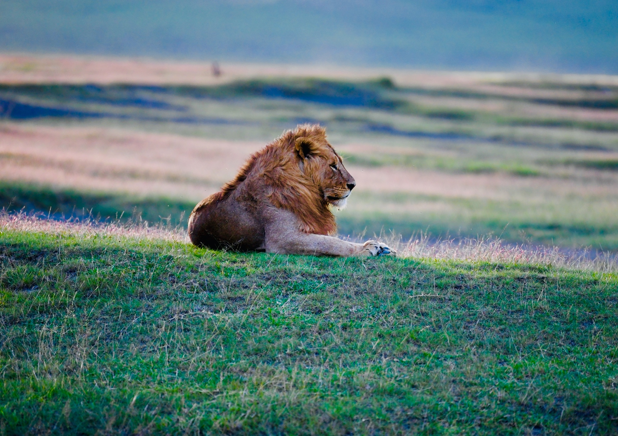 车子在底部的草原上奔驰,司机时不时给我们指向周围各种各样的动物。接近黄昏时,东非最有特色的场景出现了,几缕阳光冲破云层的空隙处,撒向地面,映得野菊花金灿灿的。这时一只似乎离了群的狮子朝我们走来,在离车不远处停下,观察着周围的猎物。我面对着阳光与雄狮,又有些逆光。我见到了阳光照射下金灿灿狮子的鬃毛还有雨水反射下闪着光的草丛……这光与影的配合堪称完美,就像那时在北极午夜阳光下北极熊的剪影一样有趣。