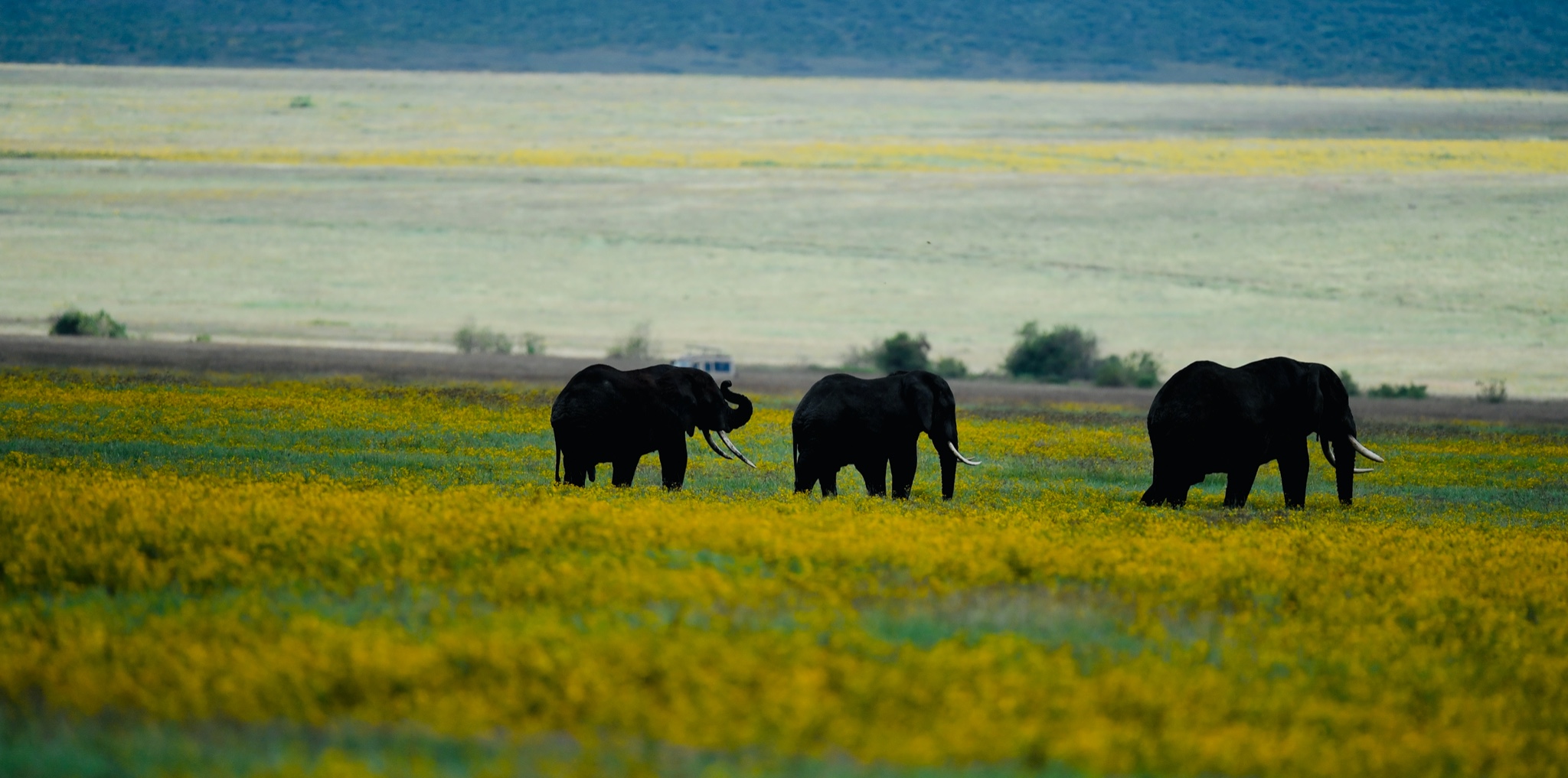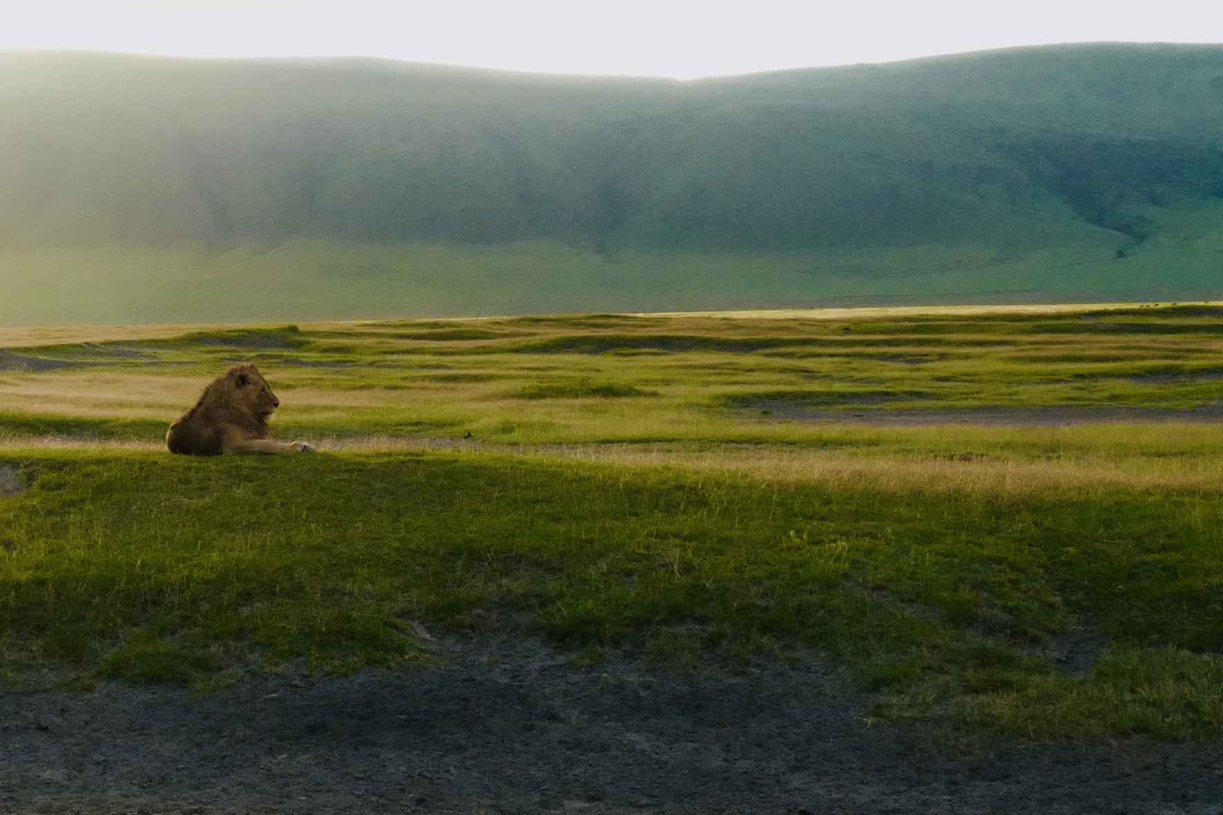 一路阴雨绵绵,空气中弥漫着雨季特有的泥土气息,我们从阿鲁沙赶来恩戈罗恩戈罗。午后一座巨大的火山口在雨雾中出现,火山口内有花海,有湖口,有犀牛,有狮子,还有成片的火烈鸟,我们沿着土路开下朝着火山口内部驶去。接近黄昏时,几缕阳光冲破云层,洒到成片的小黄花上金灿灿的,这时一头狮子朝我们走来……