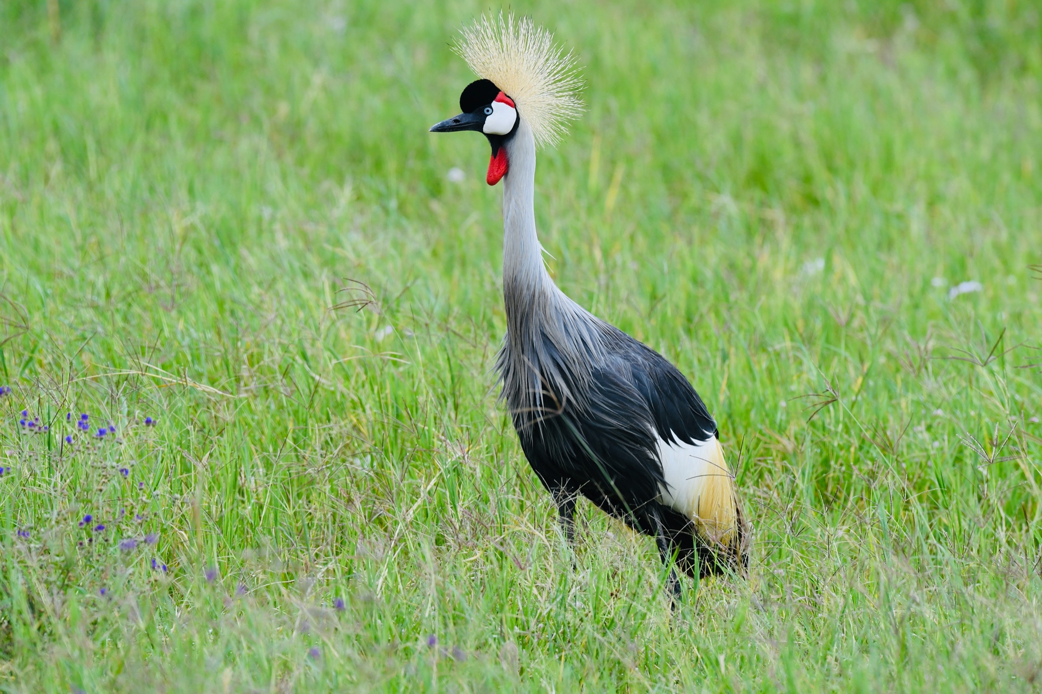 从火山口周围的环形山上沿着蜿蜒的土路开到底部大约需要1.5个小时,可能是由于路上稍感无聊,除了路面上成群的狒狒,还没见到什么,所以我突然困意来袭,在要睡着时司机突然踩停了车子,我们马上惊醒,这是看到有趣动物的预示。果然一直大鸟在我们车旁的树上。这只鸟仿佛在等我们拍它一样,一直换着造型,等我们拍累了,它也飞走了。继续出发,慢慢的我们接近火山口的底部,从远处看到底部成片的黄色和紫色和湖泊。我们赶上了雨季的尾巴,雨水的滋养,火山口内有油菜花和薰衣草的花海,还有小湖泊。