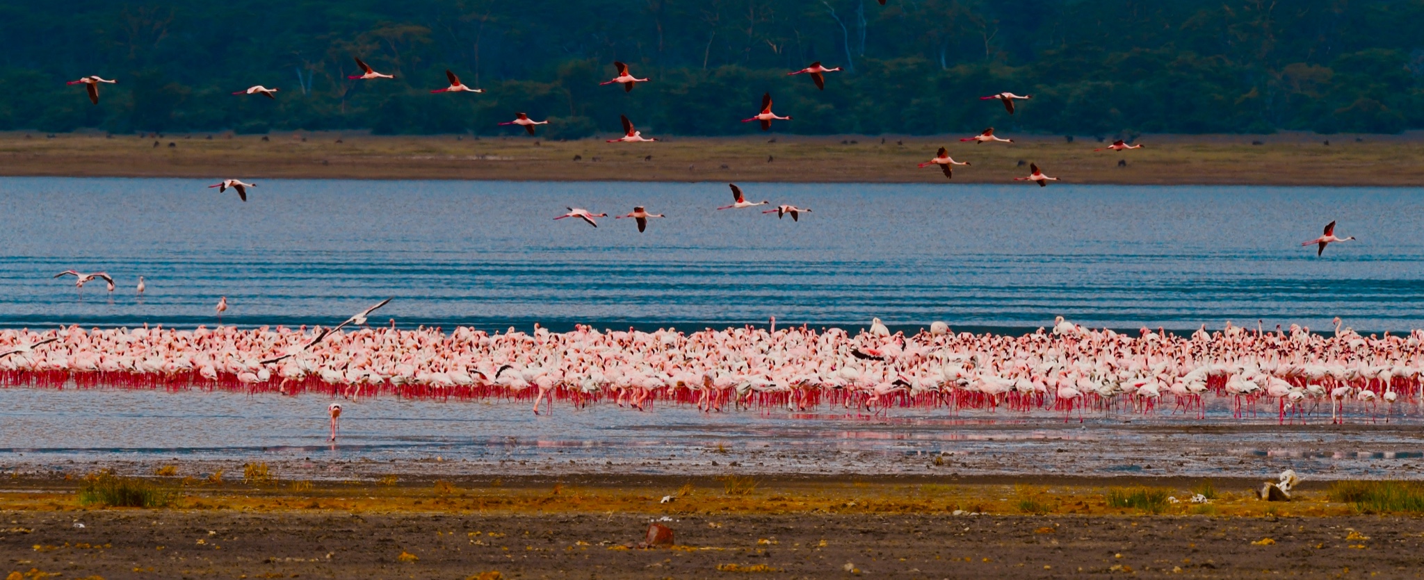 车向前驶去,突然前方出现一大片湖,接着一片粉粉的东西也进入眼帘。“那是火烈鸟”,我说。司机继续开着车,最后停到一处他可以停的距离火烈鸟最近的地方。见一次成片的火烈鸟,一直都在我list 中。第一次来到非洲是在2014年,当时的一个梦想就是去看火烈鸟。那一年,我们从内罗毕开车6个小时,来到肯尼亚的一座湖,然后找了当地一渔民,开着船带我们去寻找火烈鸟,然而两个小时过去了,一只也没见到。后来的几年中,我陆陆续续多次来到东非,可是每次都与火烈鸟无缘。这次来之前我很确信这不是一个看火烈鸟的好季节,然而今年的姗姗来迟的雨季却让我意外收获这群粉粉鸟类。