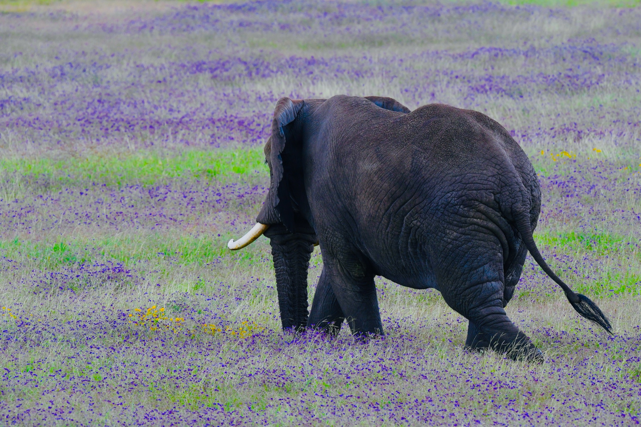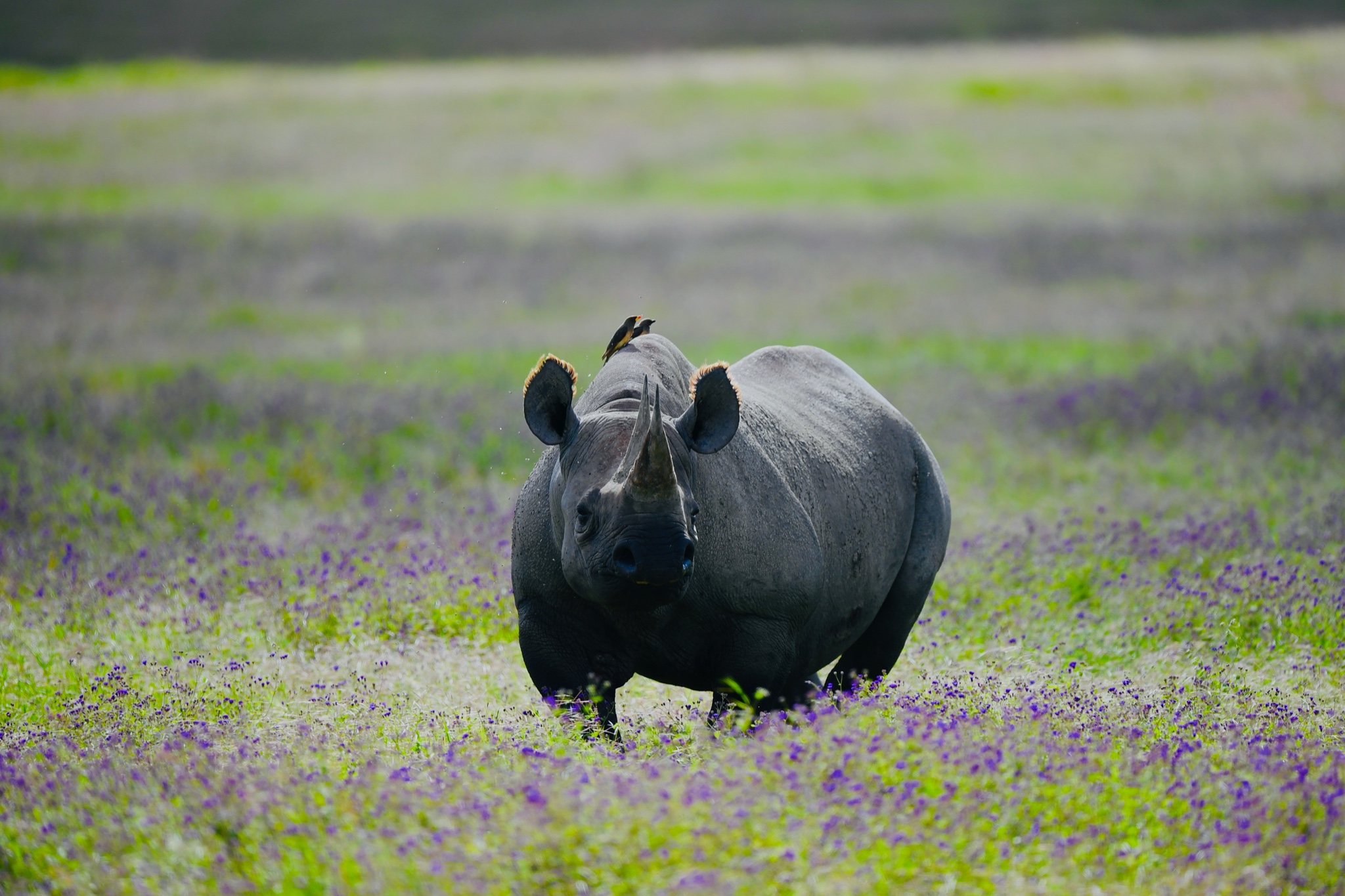 我拿起相机,拍个不停。直到觉得够了,才放下相机,站在车上,好好观赏着它们。大约一个小时后,司机收到无线电通话,然后示意我们差不多了,就急匆匆朝着另一边赶去,原来他得知这里有一头黑犀牛。因为人类的偷猎犀牛角,所以犀牛的数量在过去几年中大幅度减小。现在在东非游猎寻到一只犀牛可不是一件容易的事。这只黑犀牛独自在紫色的花丛中走着,也不在乎我们是否在它身边,过了一会,竟然有两三辆车赶来,想必也是为了目睹犀牛的风采。这些巨大的物种,在这里生存了几百万年,自然选择让它们生长出了角,如今却因为角,它们即将灭绝。就在我还在为犀牛的命运感到悲伤时,一头大象走入了紫色的花海……