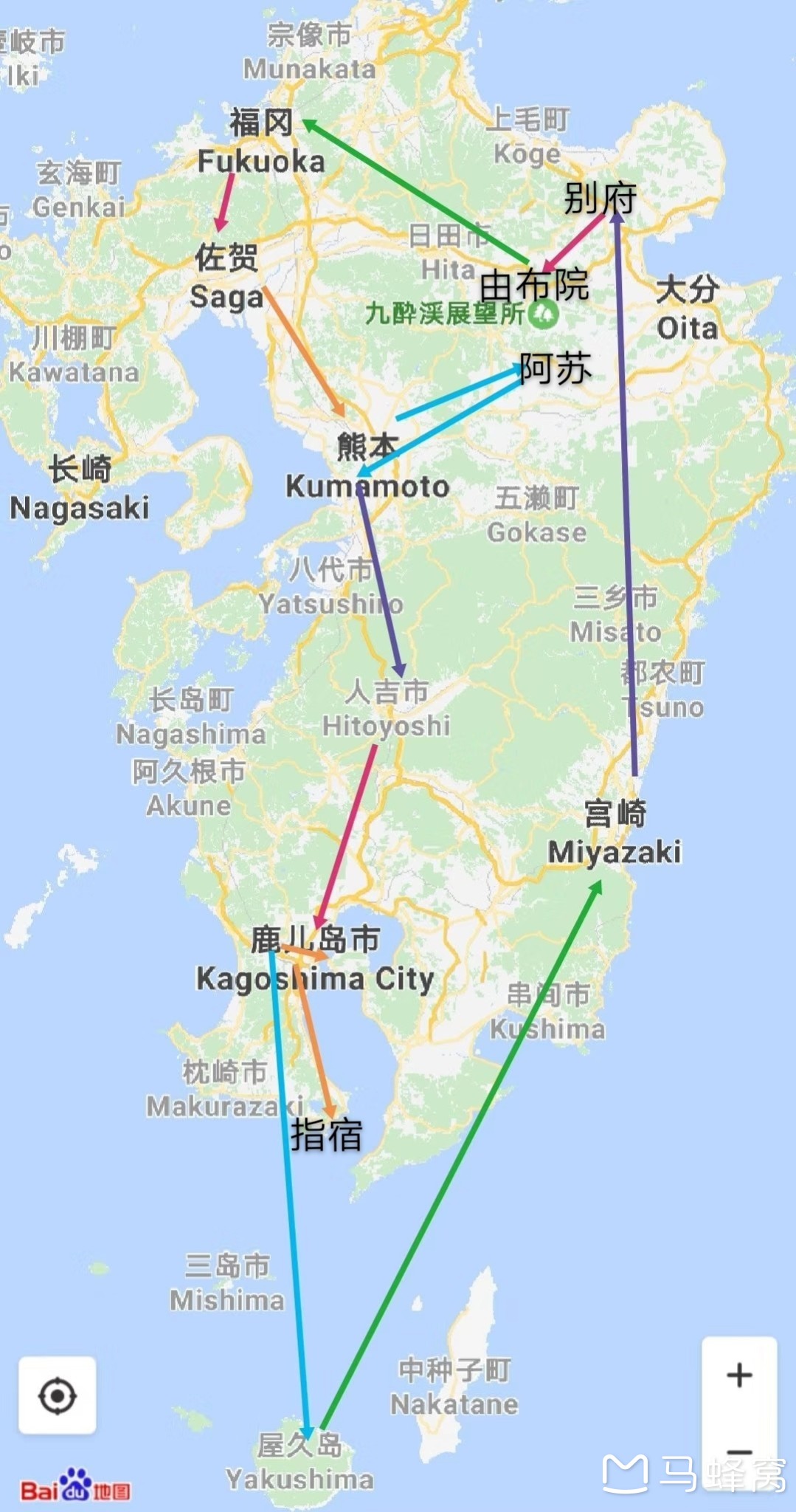 路线:佐贺-熊本-阿苏-人吉-鹿儿岛-屋久岛-指宿-宫崎-别府-福冈总计17天