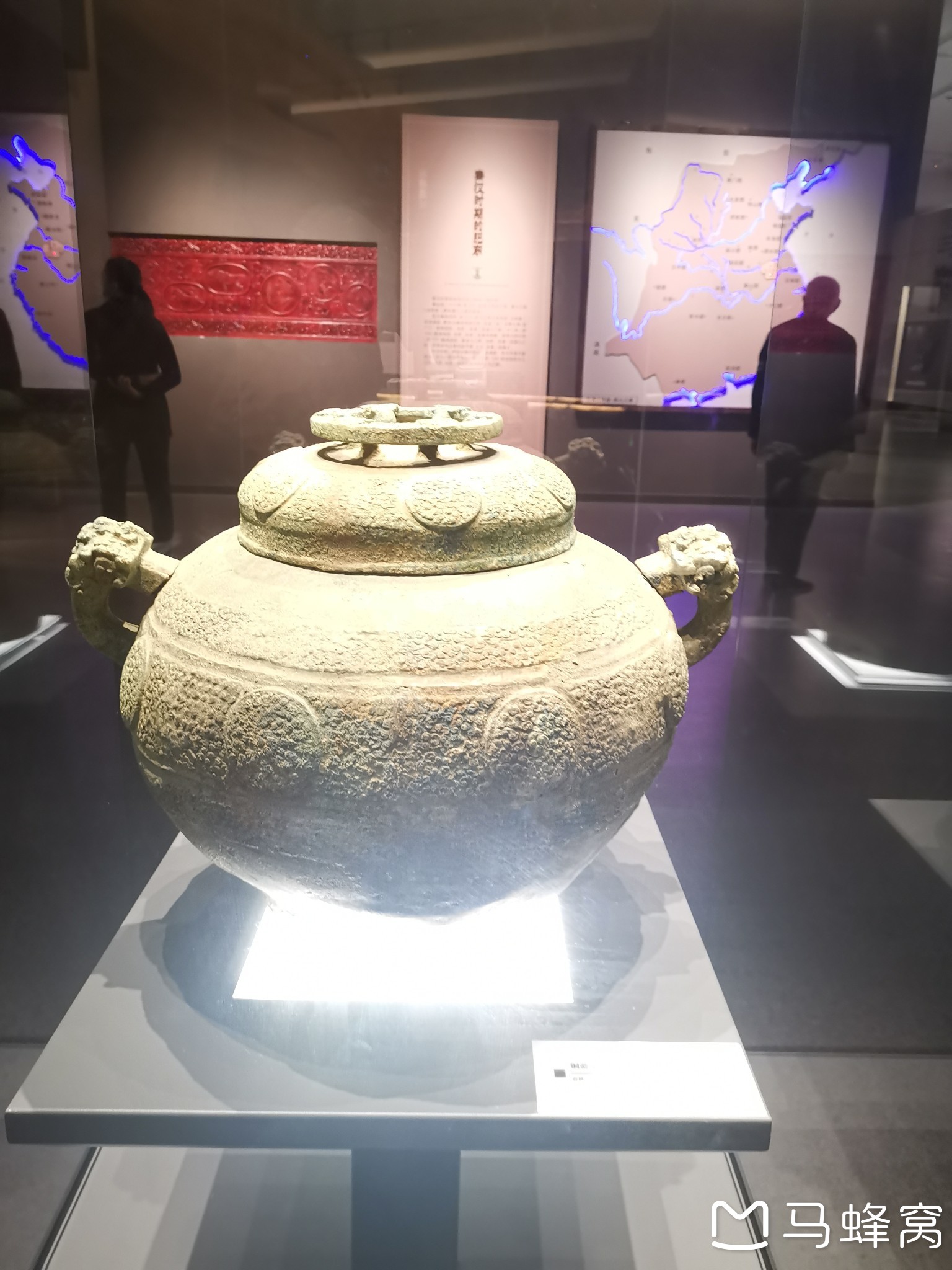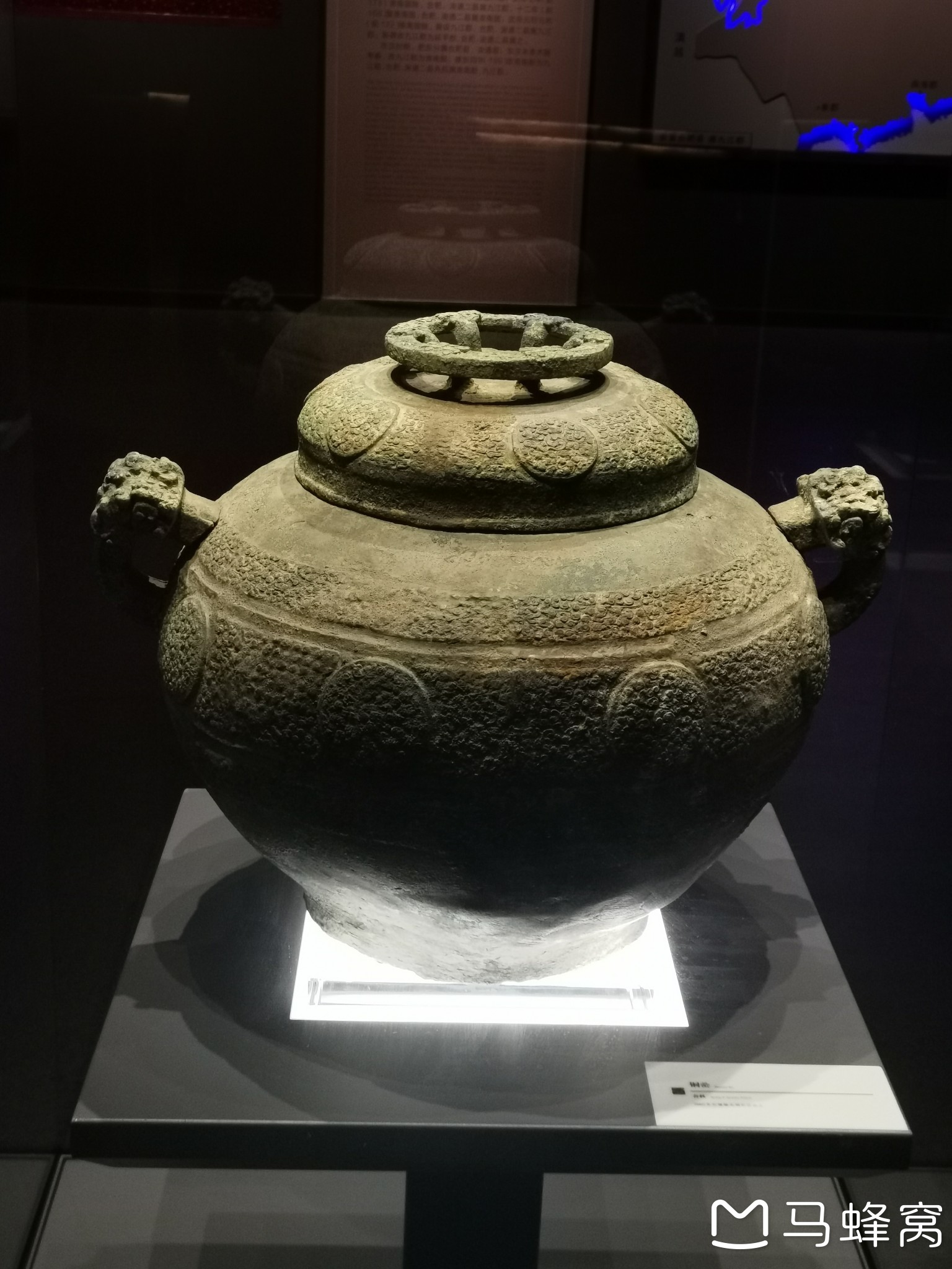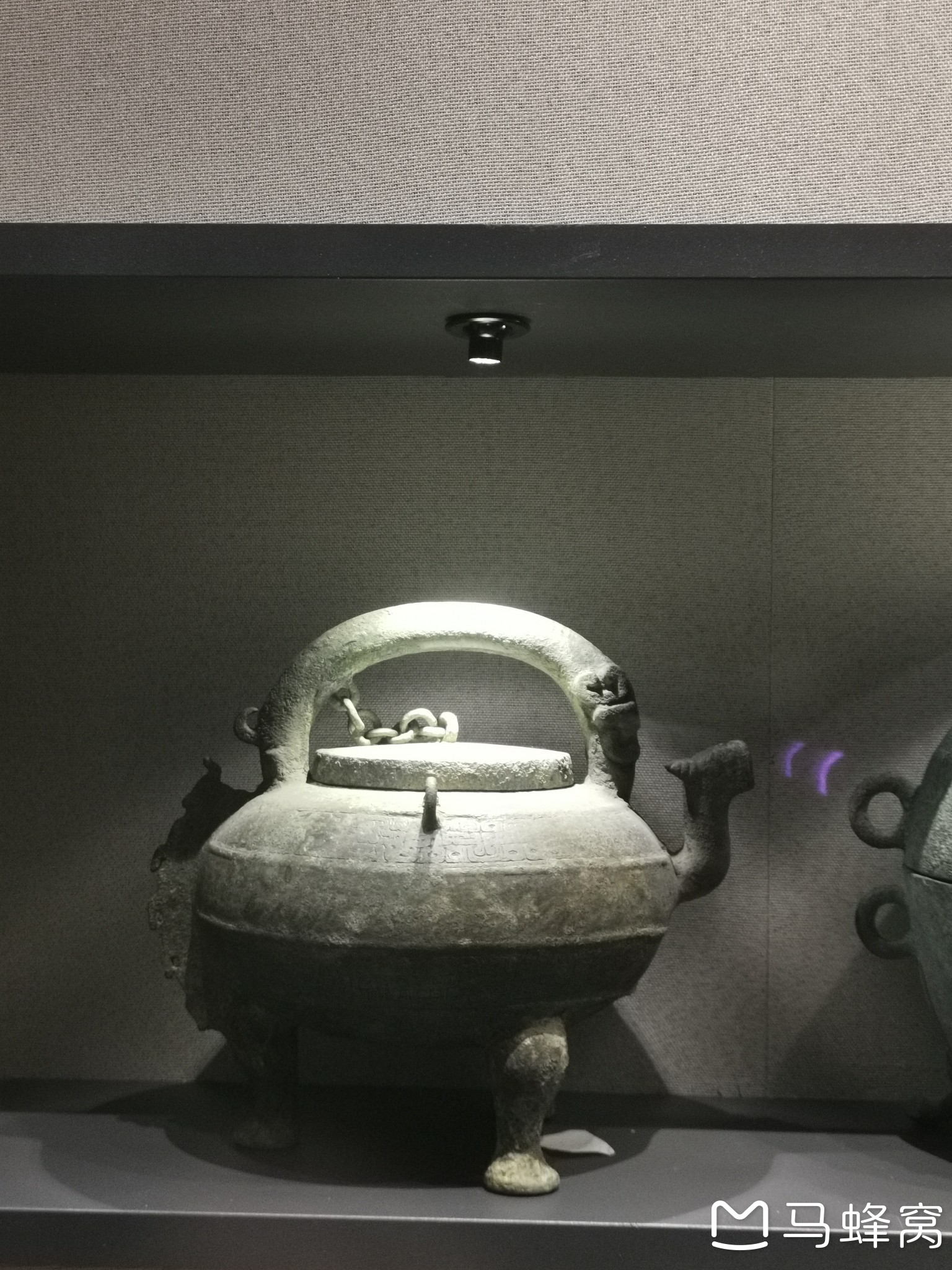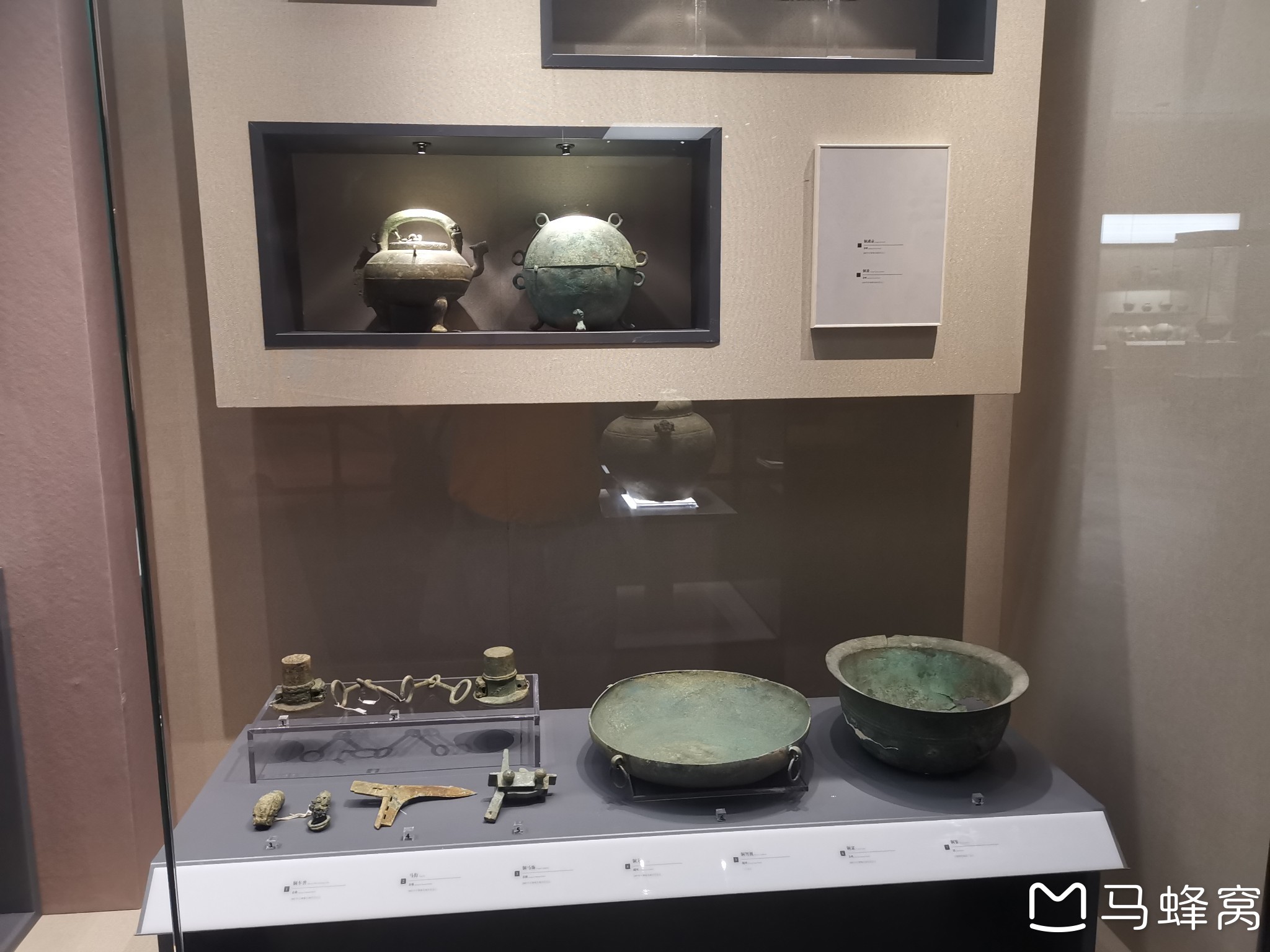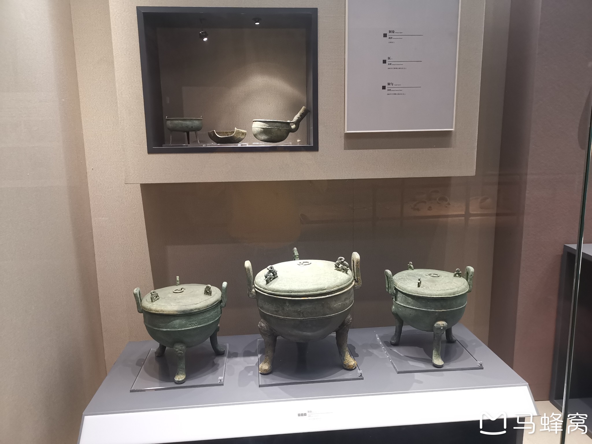 下方左侧是装在马车轮轴两端的青铜车軎,架在驾车的马嘴里的青铜马嚼,两件马车兽头装饰,青铜戈这些都是春秋时期的,还有战国时代的青铜弩机,弩机是当时刚发明的弩上的瞄准具和拉弦省力装置以及击发的扳机。右边是青铜盘(贵族洗手时放在手下接水用的,和用来舀水浇手相当于水瓢功能的青铜匜配套使用)和青铜釜(作用相当于今天的锅)