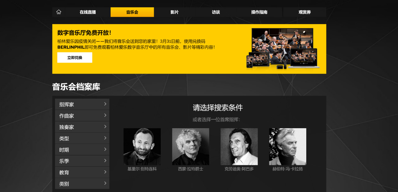官网的档案库不仅有4K高清直播音乐会,还有许多著名音乐家的传记采访、纪录片提供点播,对于交响乐爱好者和音乐专业学生来说都是顶级学习资源了!快登陆官网搜索你想了解的音乐干货吧~