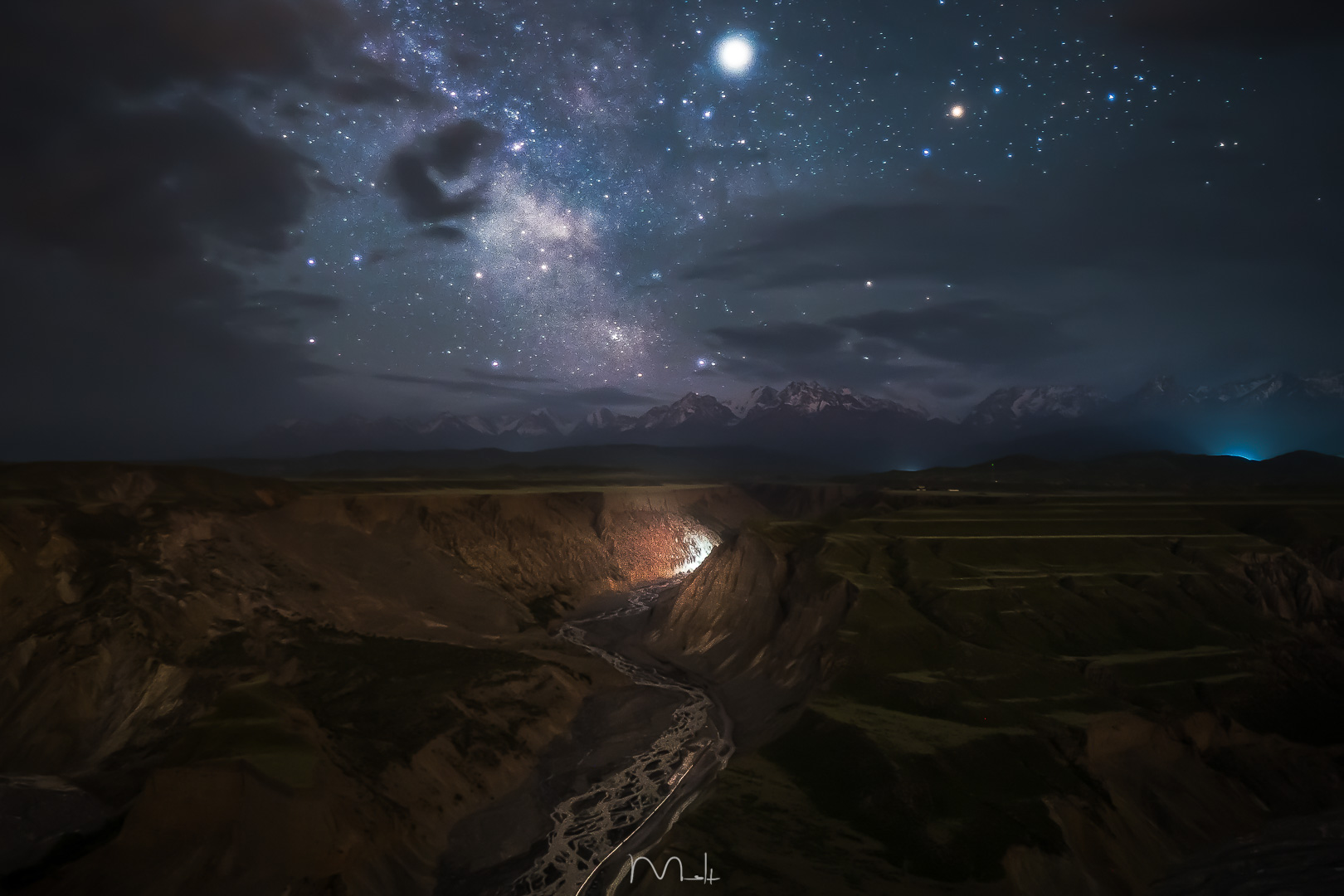 9点钟,太阳落山,在昏暗的暮光中我们发现路边有一大片开阔平整的石滩,另外一边是高耸的岩壁,风景也不错。于是,我们第一晚的露营点就选在这里了。