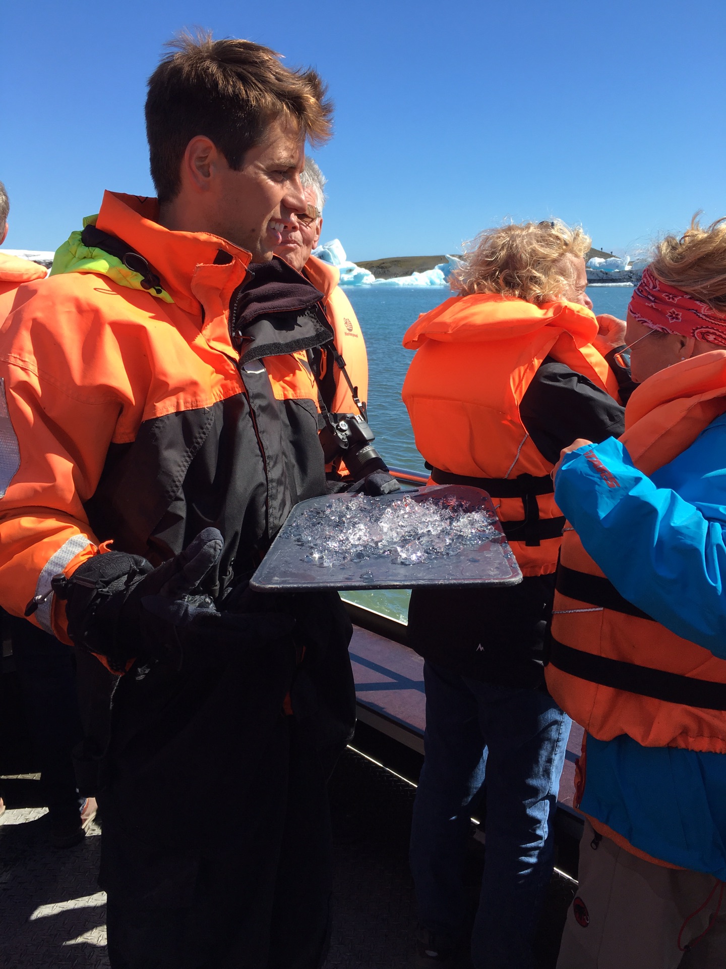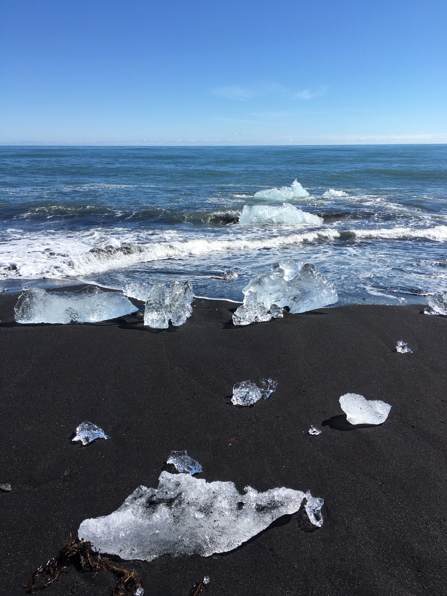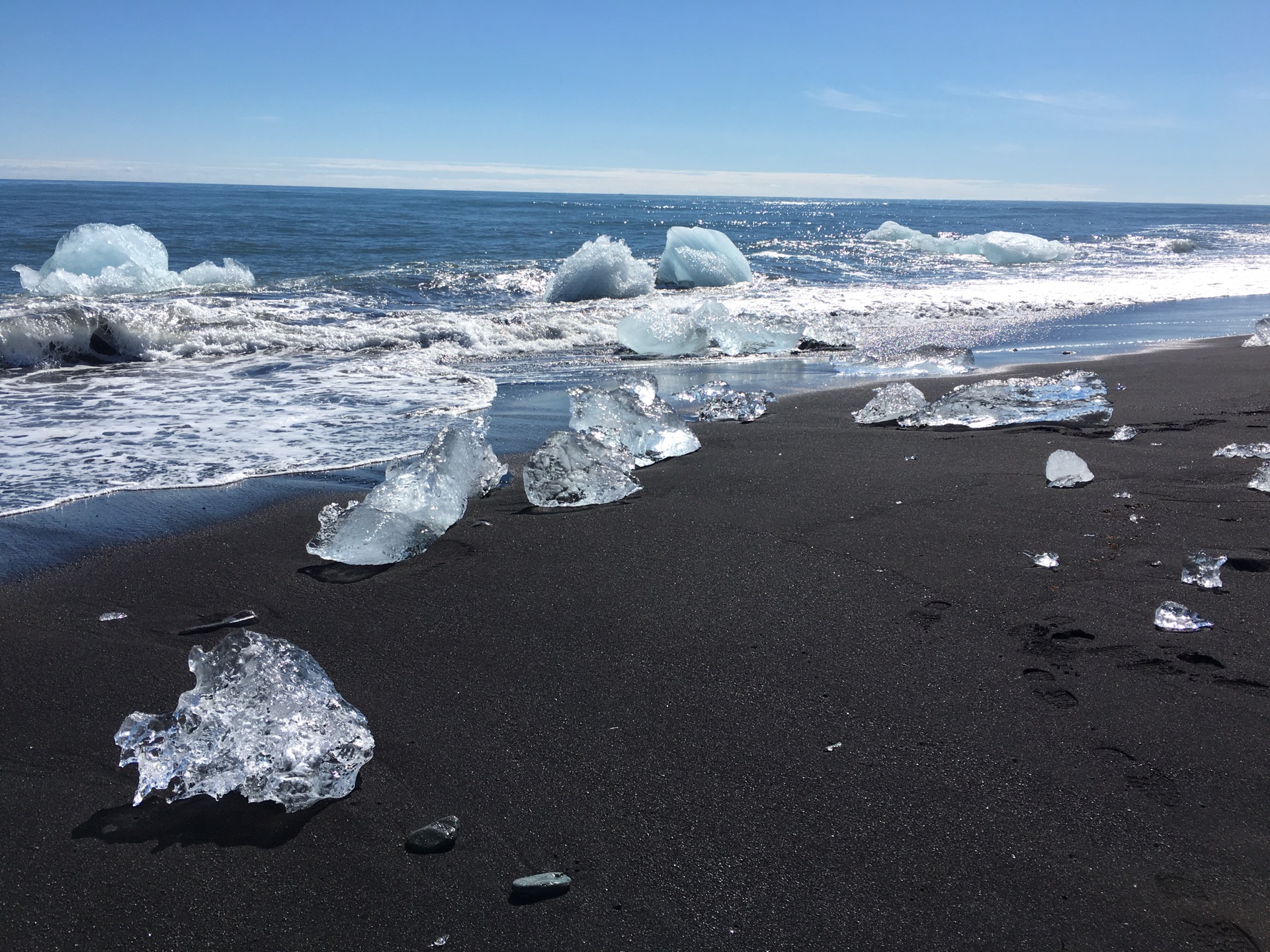 钻石沙滩就在冰河湖对面,过一条马路就是了。可能冰河湖太惊艳了,看到钻石沙滩的时候,心情就没有那么激动了,但也是个非常美的地方。因为是夏天,所以海滩上的冰不如冬天多,但是跟着导游姐姐找对地方,还是能够看到的