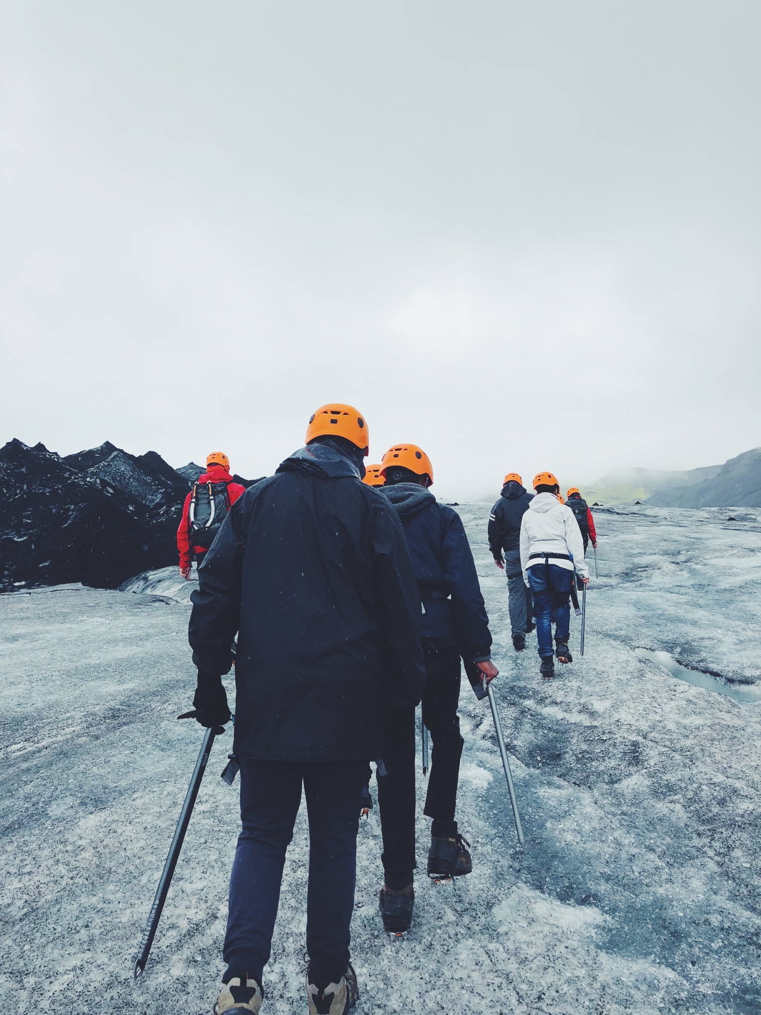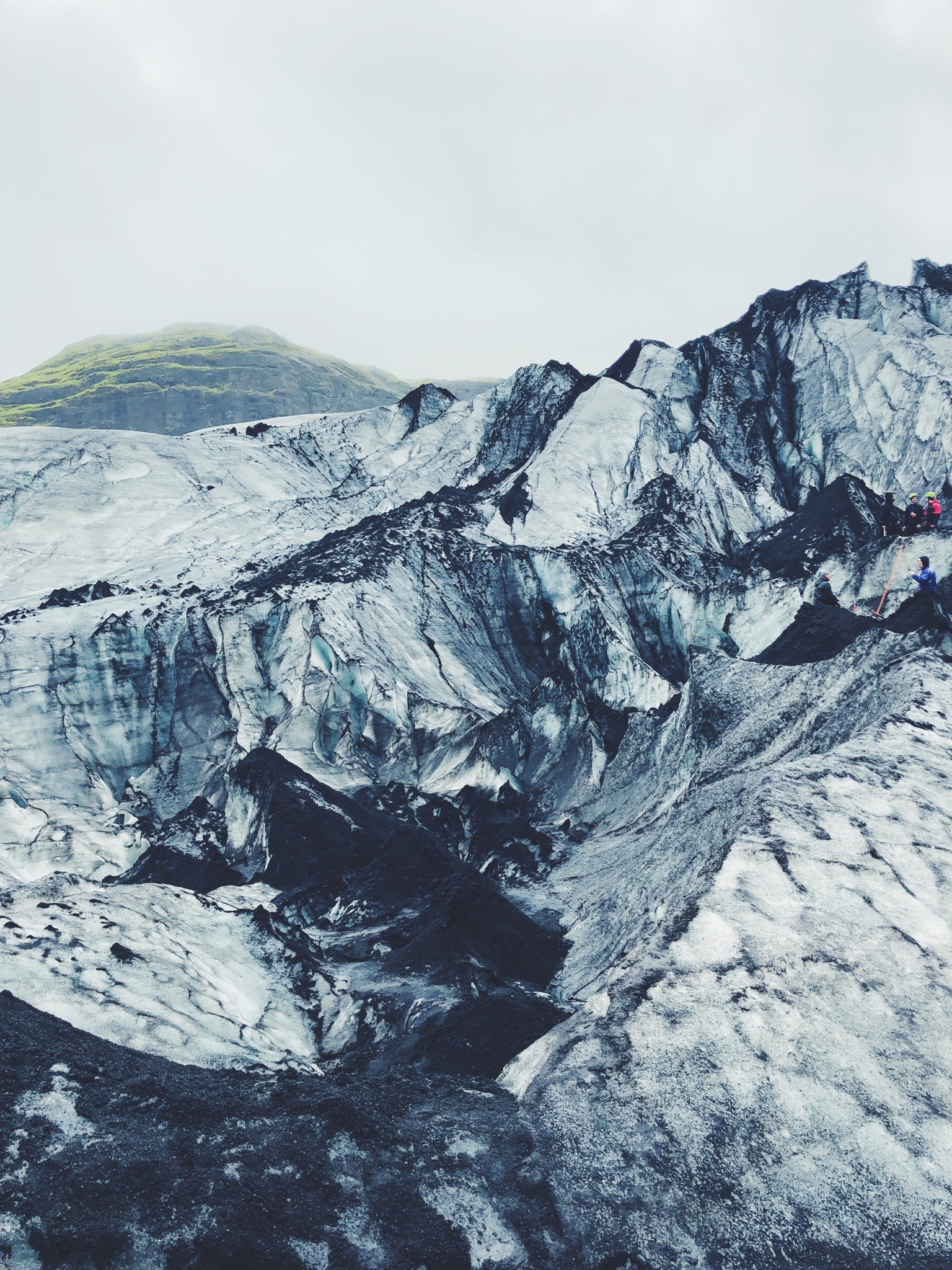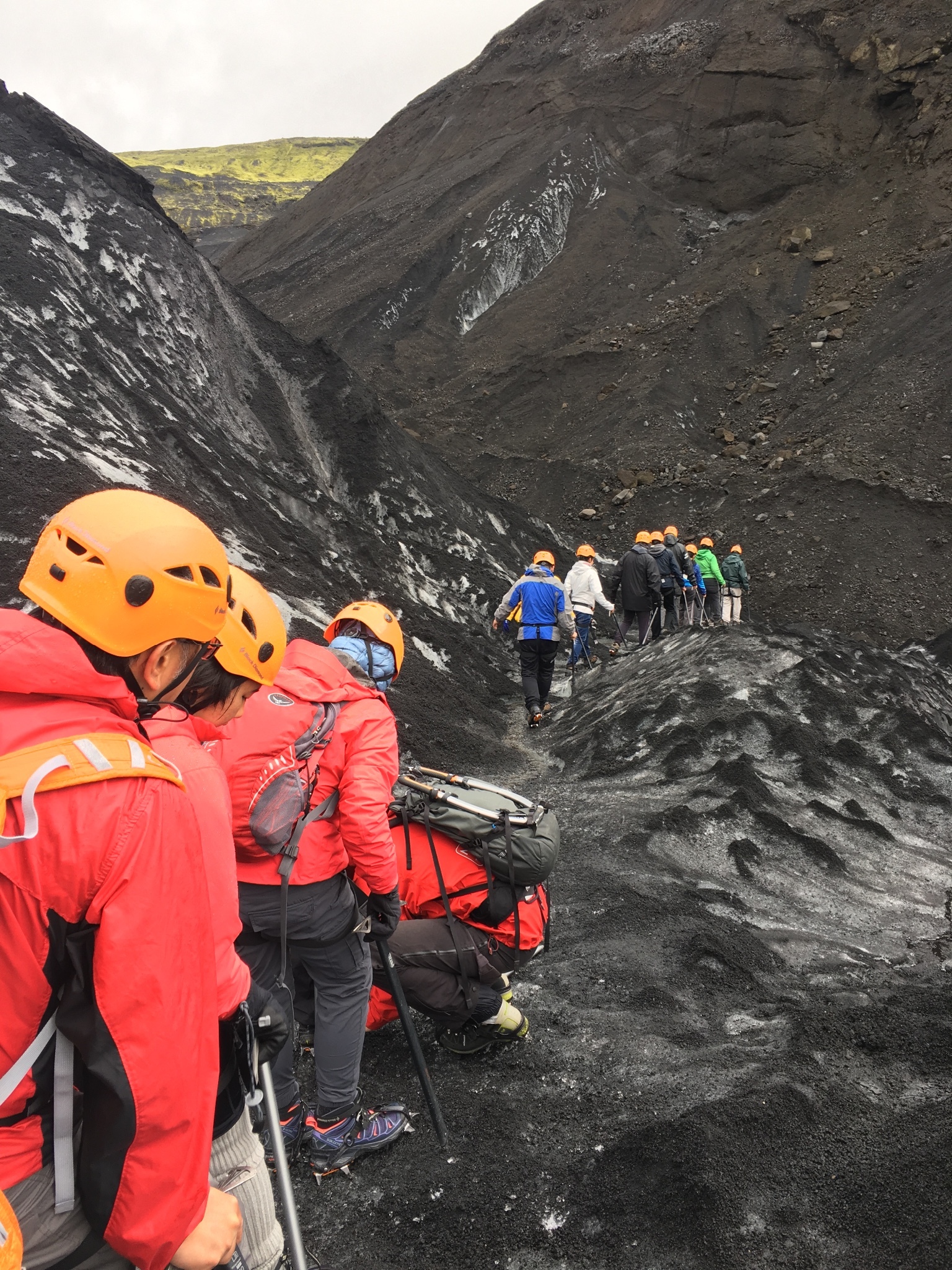 远处看冰川是白色里面透着蓝色,有点像权游里白鬼住的地方,但开始爬的前半程却是黑色的,冰上铺满了黑色的火山灰。越往上爬,白色和蓝色的冰慢慢露出来了。冰川上有些深渊,有些恐怖,掉下去估计就跟世界说拜拜了。导游姐姐在前面引路,司机uncle,一个很典型的北欧uncle在队伍后面,随时帮助有需要的团友。冰川上只有一条小径,很窄,很多地方只容一个人通过,冰上坑坑洼洼,有些地方需要团友互相帮助才能继续往前走的。但祸不单行,从爬冰川开始就一直下大雨了,这种情况打伞是根本不可能的,所以又一次体现了防水衣服的重要性了。