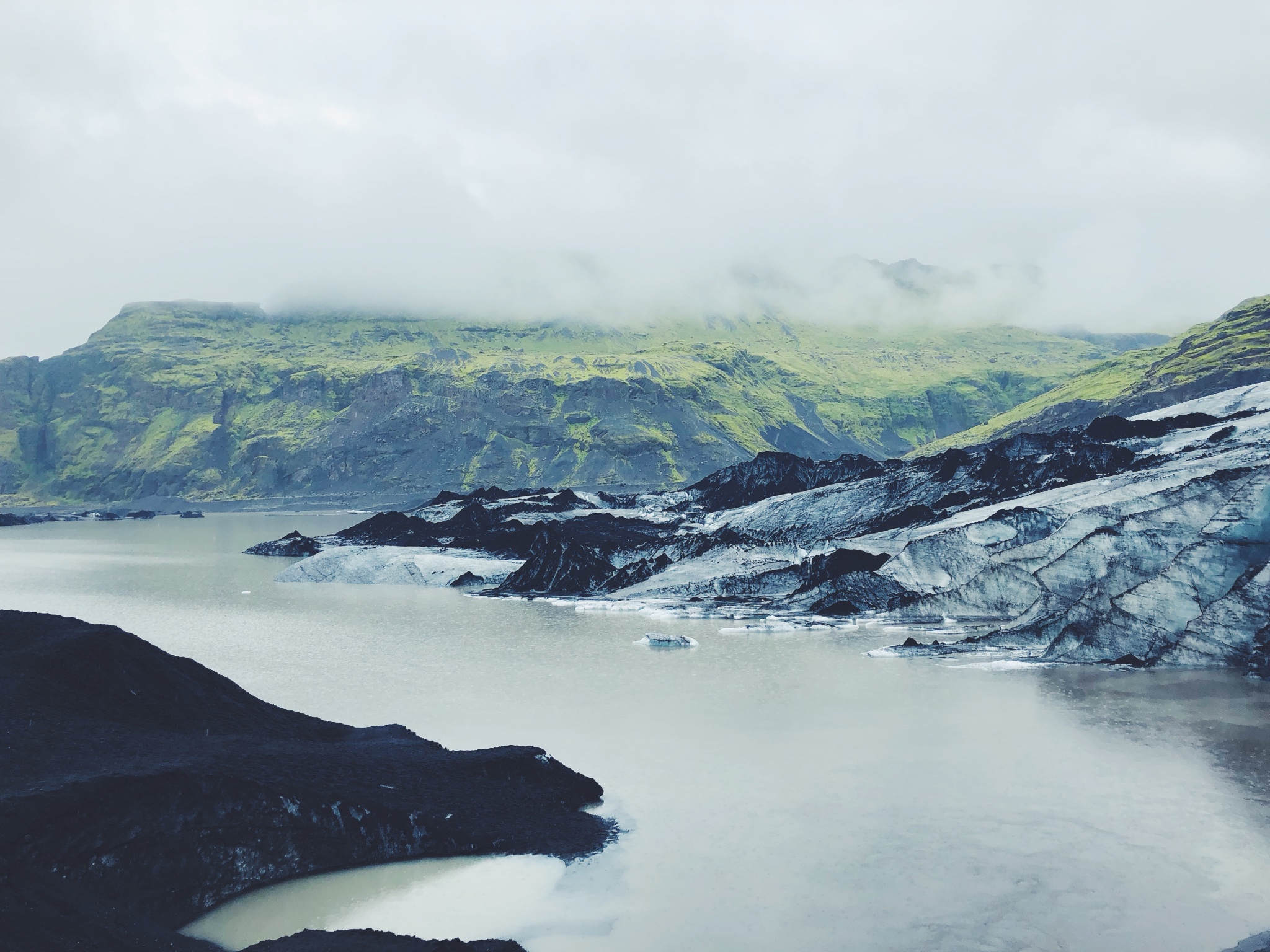 终于,过了不知道多久,我们停在一个很开阔的地方,导游就教我们怎么和冰川水,非常干净,虽然味道却没有想象中的清甜,我们在那里各种拍照留恋,尽情领略冰川上的风光。从冰川上远眺,灰沉沉的天空,近处白色和冰蓝色的冰川,稍远处黑色的火山灰,冰川旁边绿色的山,色调冷清而萧瑟,非常的冰岛。