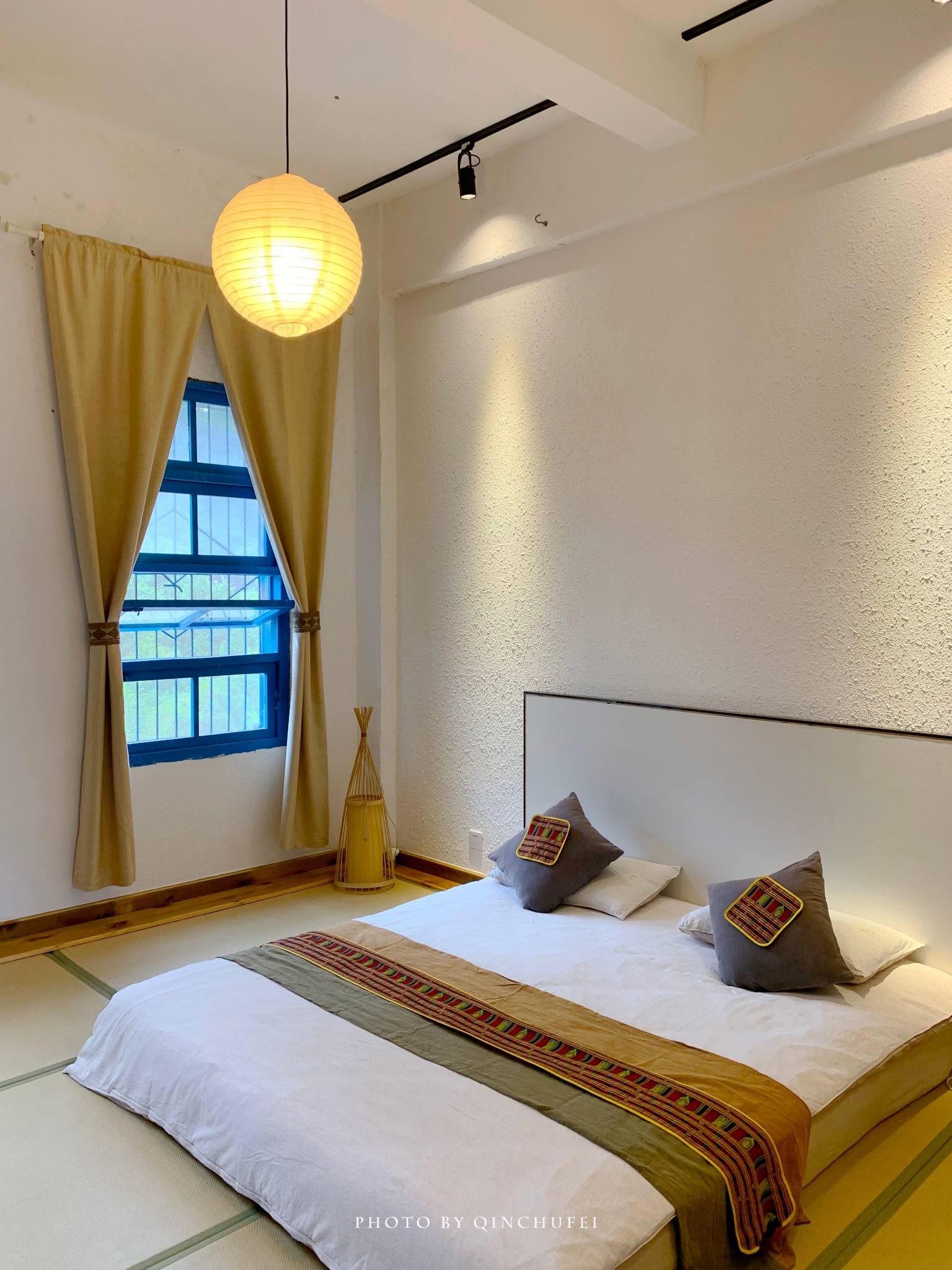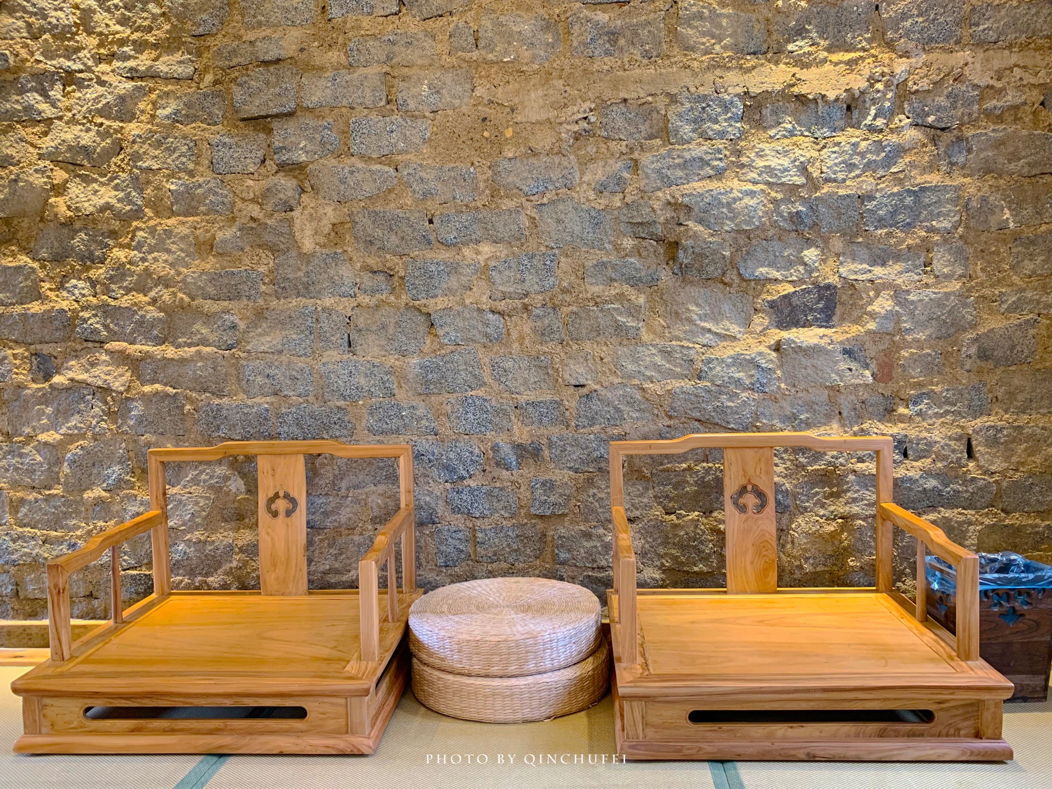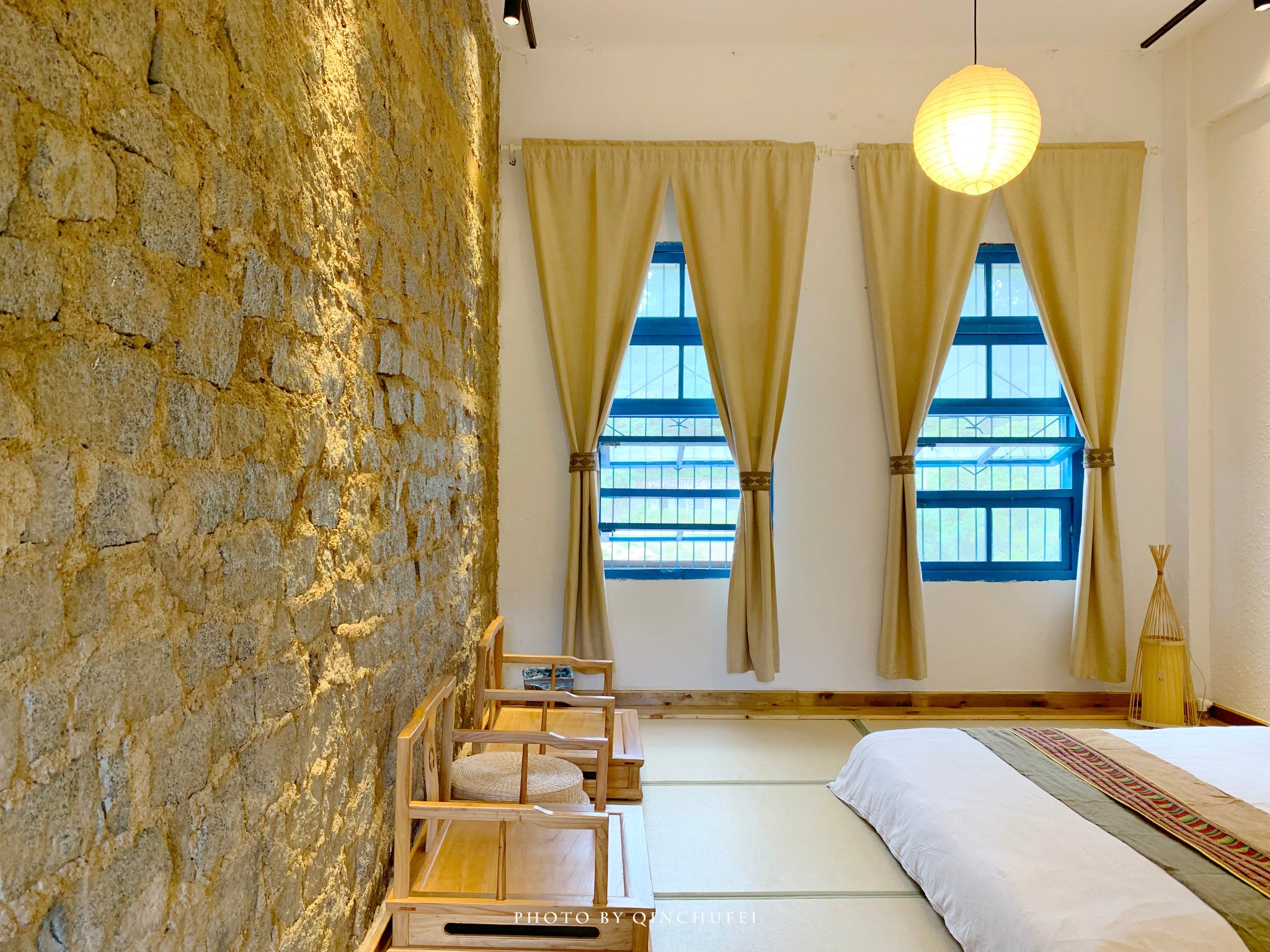 二楼有八间房,房间内摆了一张榻榻米,和两张矮木椅,床铺的对面是一面由粗糙的石块砌成的墙面,质朴的色彩让我瞬间将浮躁丢在了门外。