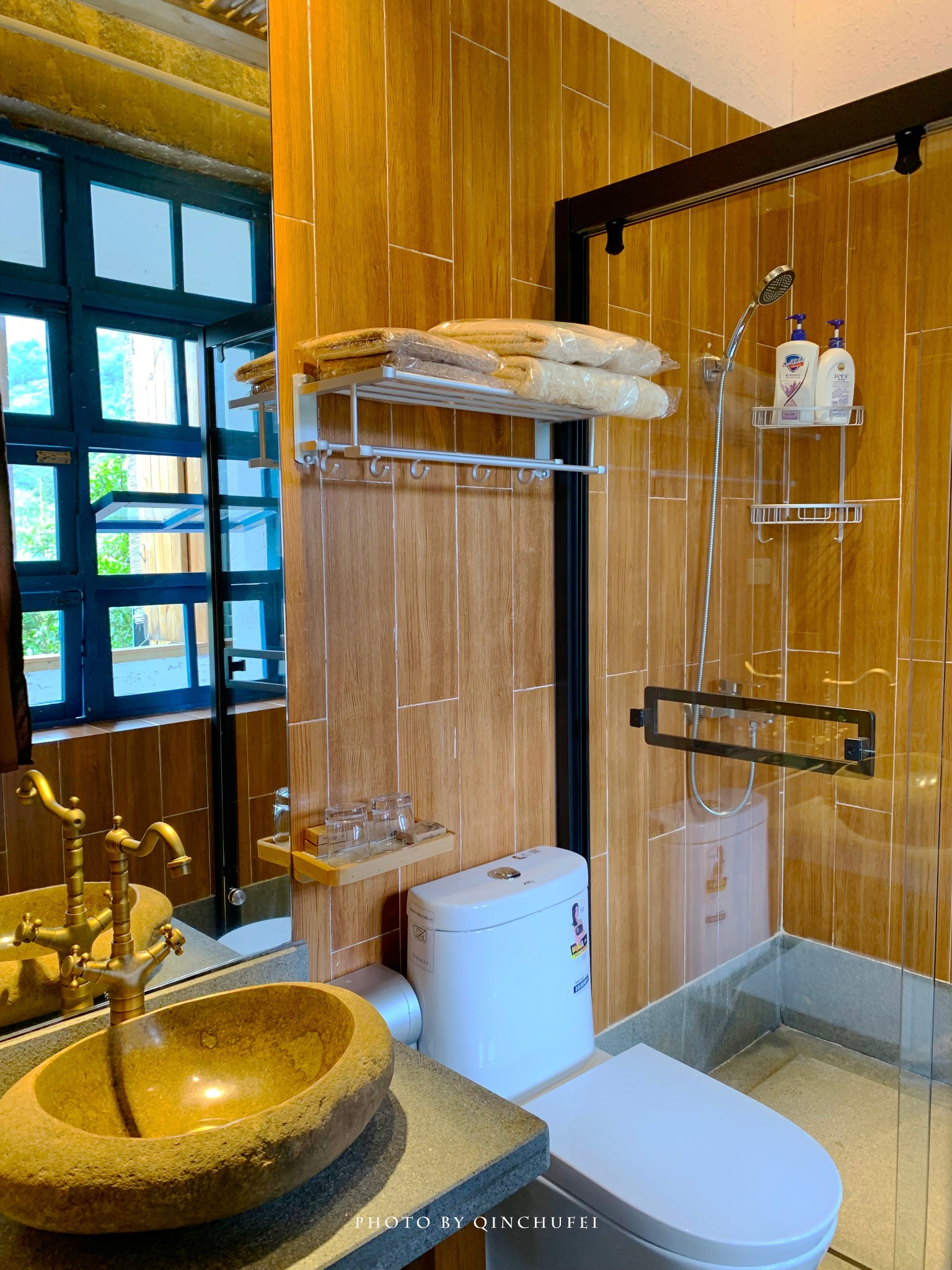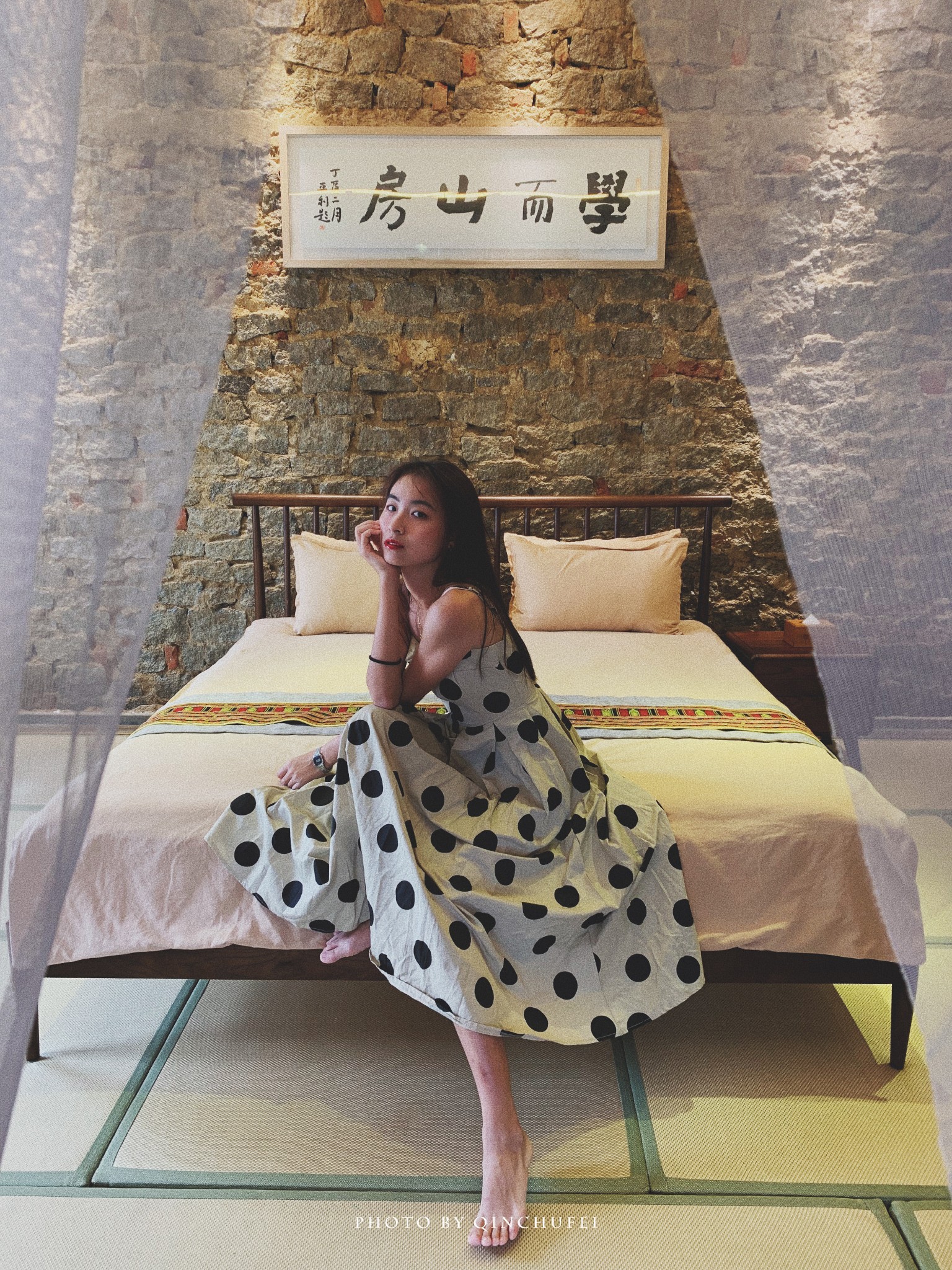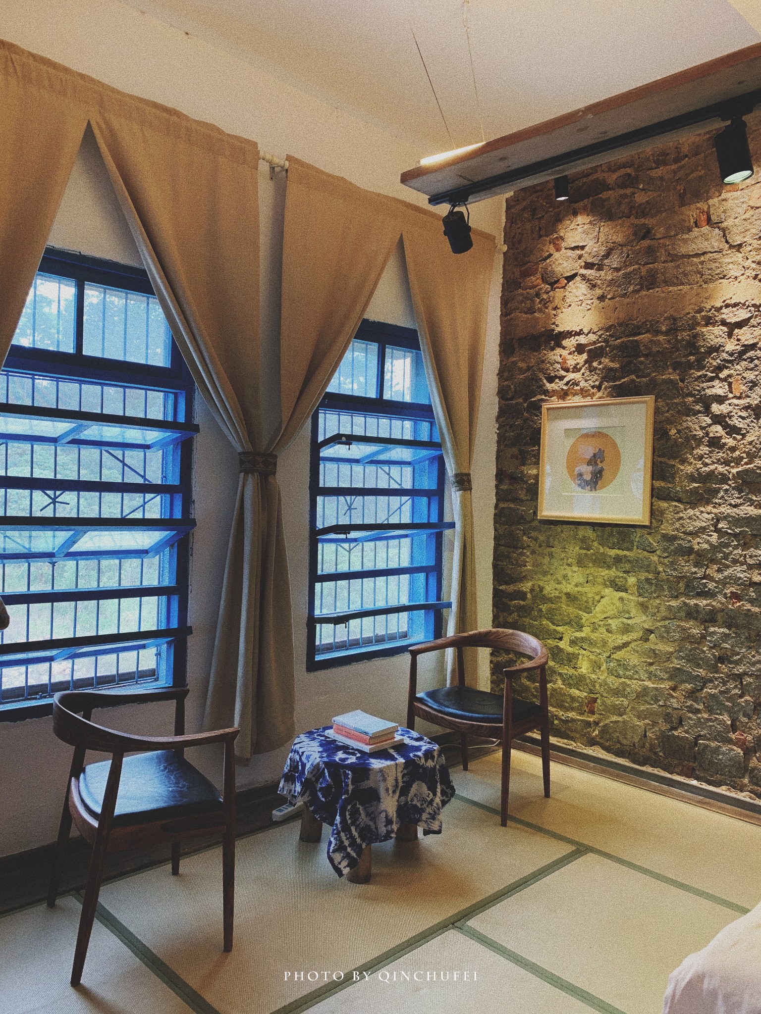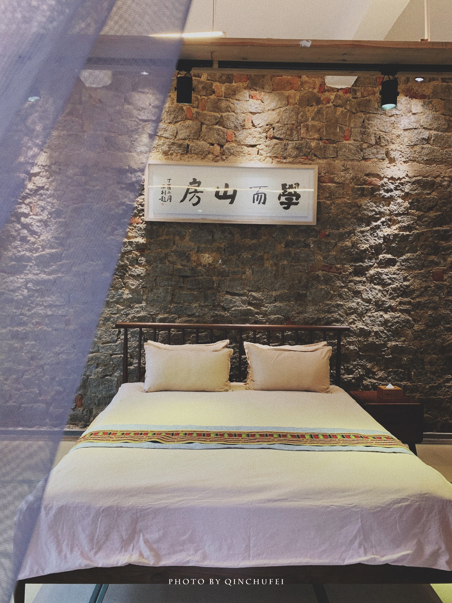 二楼有八间房,房间内摆了一张榻榻米,和两张矮木椅,床铺的对面是一面由粗糙的石块砌成的墙面,质朴的色彩让我瞬间将浮躁丢在了门外。