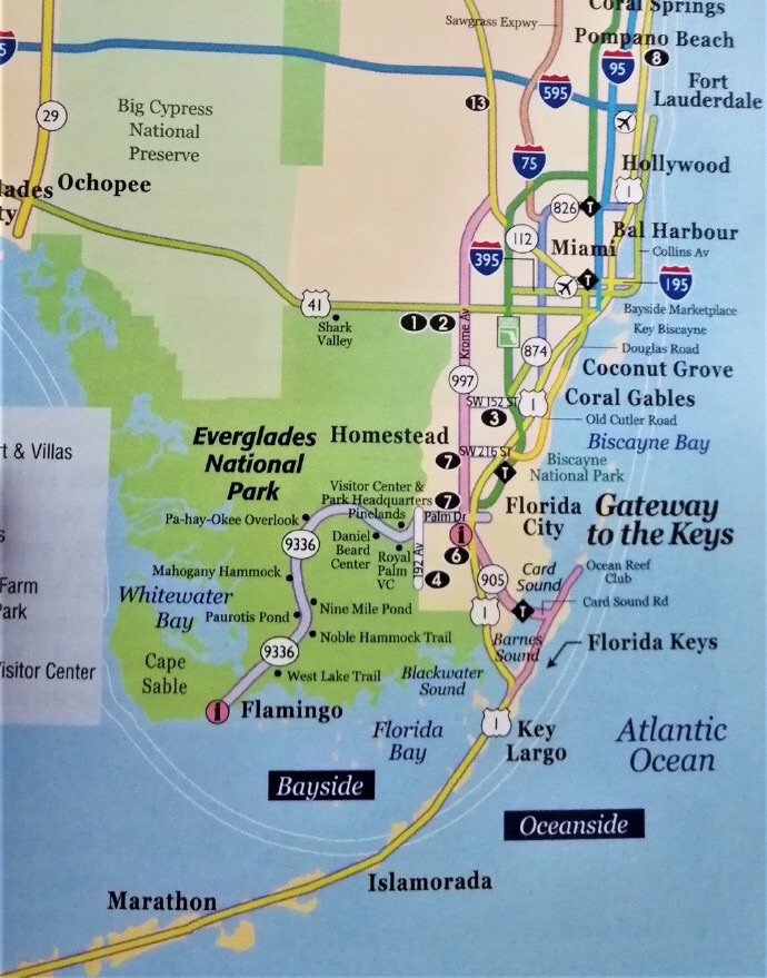 通往Florida最南端Key West的US Highway 1(美国一号高速公路),将大部分佛罗里达群岛连接起来,沿途很多mile markers(英里标记物),0-mile(0英里起始标记物)就在Key West的Whitehead St & Fleming St的交叉口。