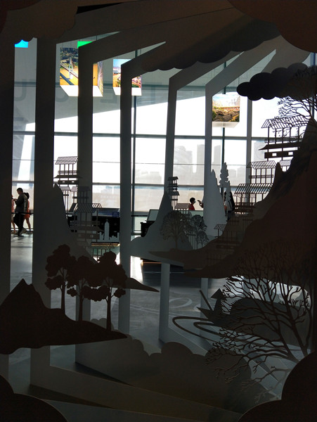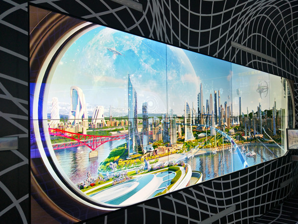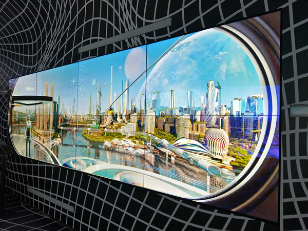 在这条走廊两边的屏幕上,播放着关于未来重庆城的“最终幻想”,置身其中,仿佛“穿越”到未来