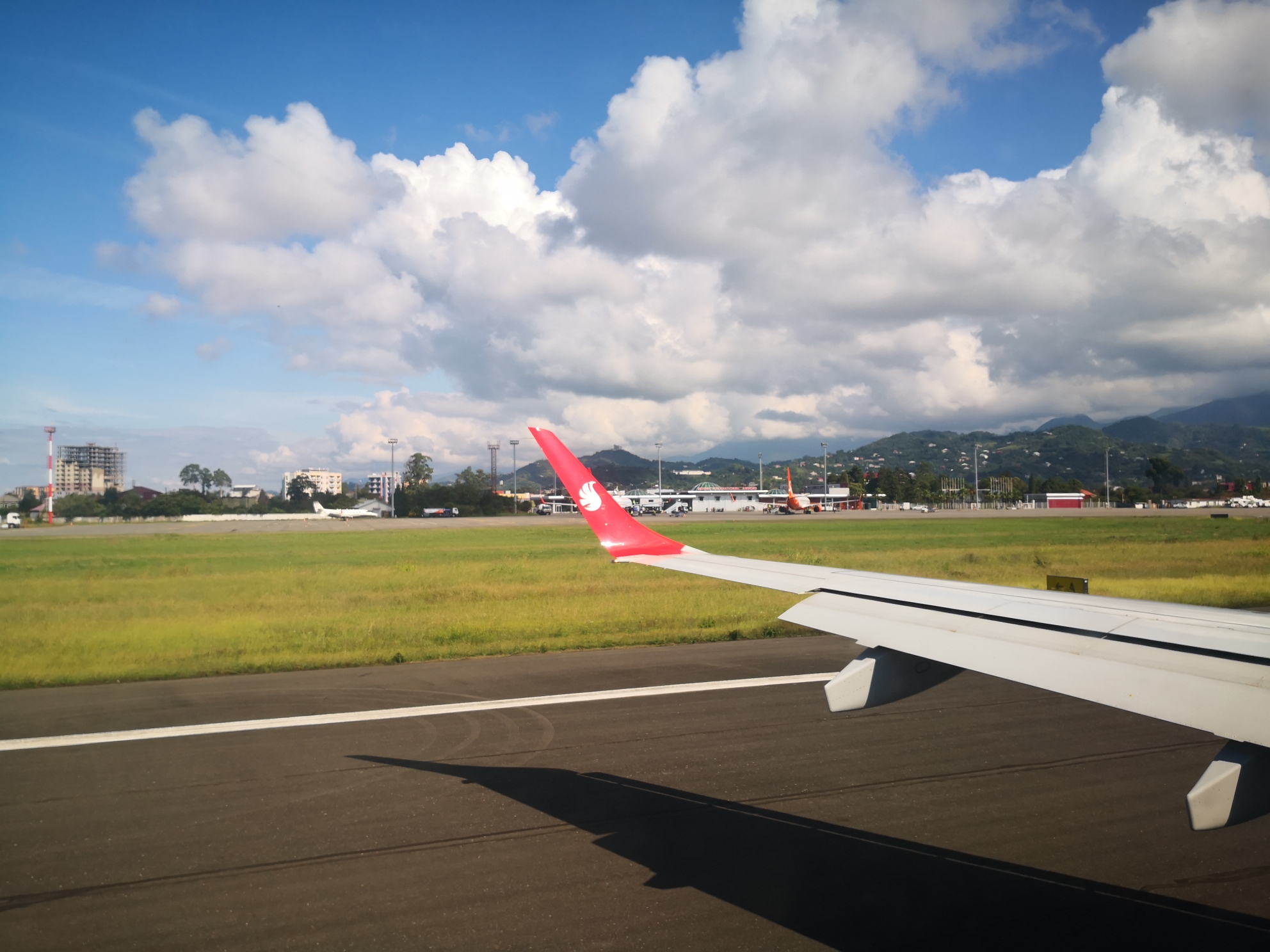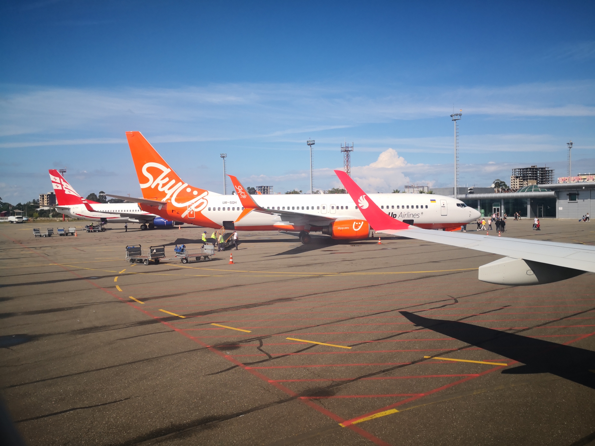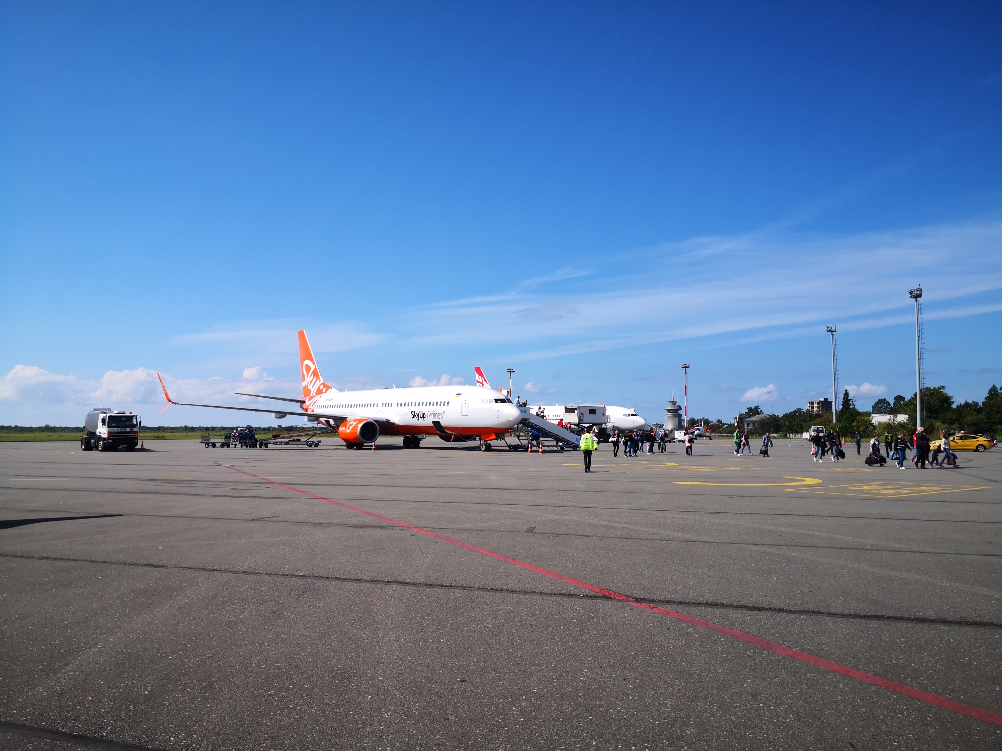 停机坪上停着乌克兰一家航空公司和格鲁吉亚航空公司的飞机,一下子来了3架飞机,小小的机场海关有点应付不过来了。
