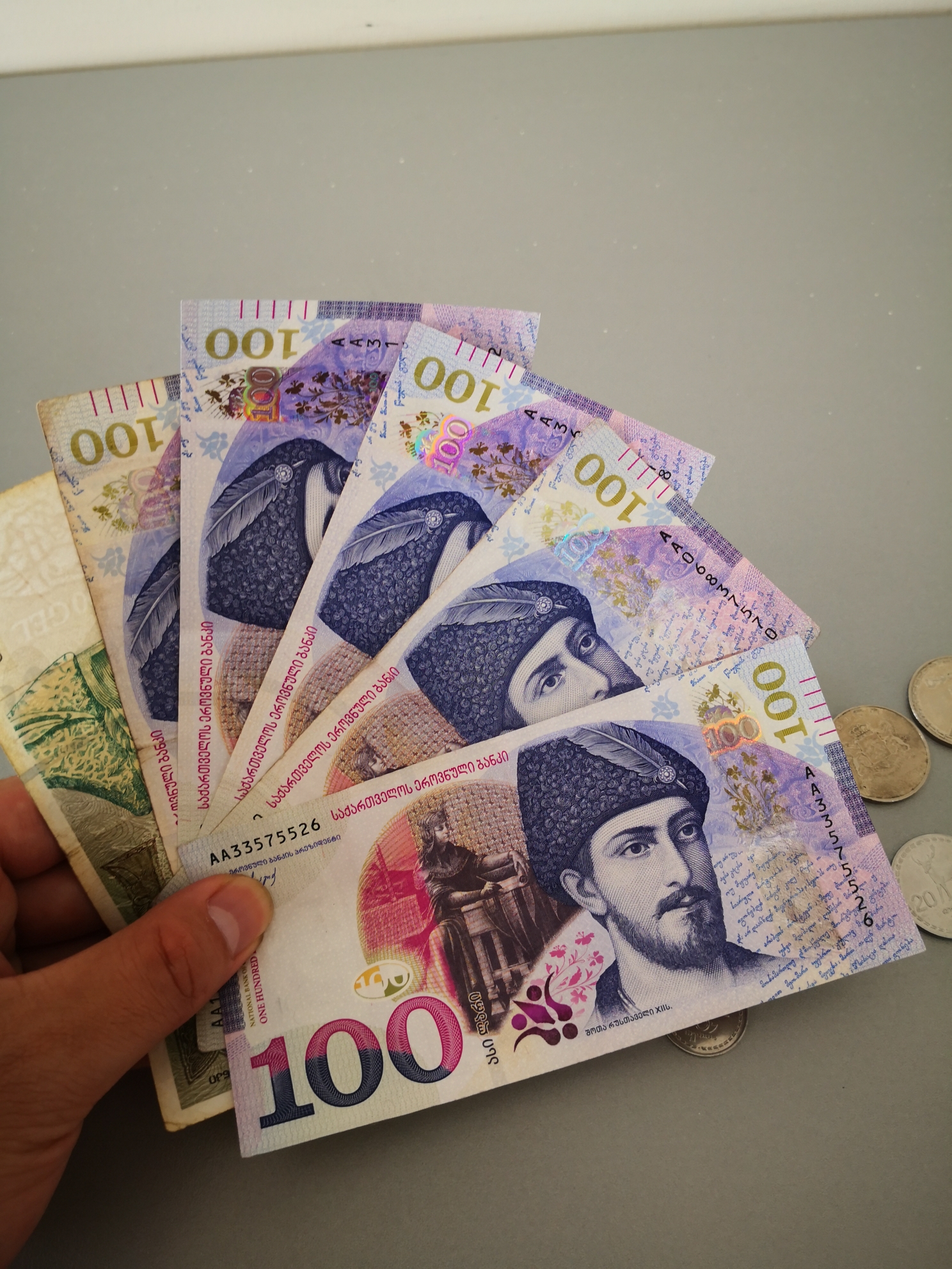 格鲁吉亚的货币是拉里,国内没法兑换,可以拿美金和欧元,到这边来换,巴统机场就有兑换点,汇率比城里稍微差点,但是感觉还可以。或者拿着银联卡到取款机上取,一块钱拉里等于2.3人民币。