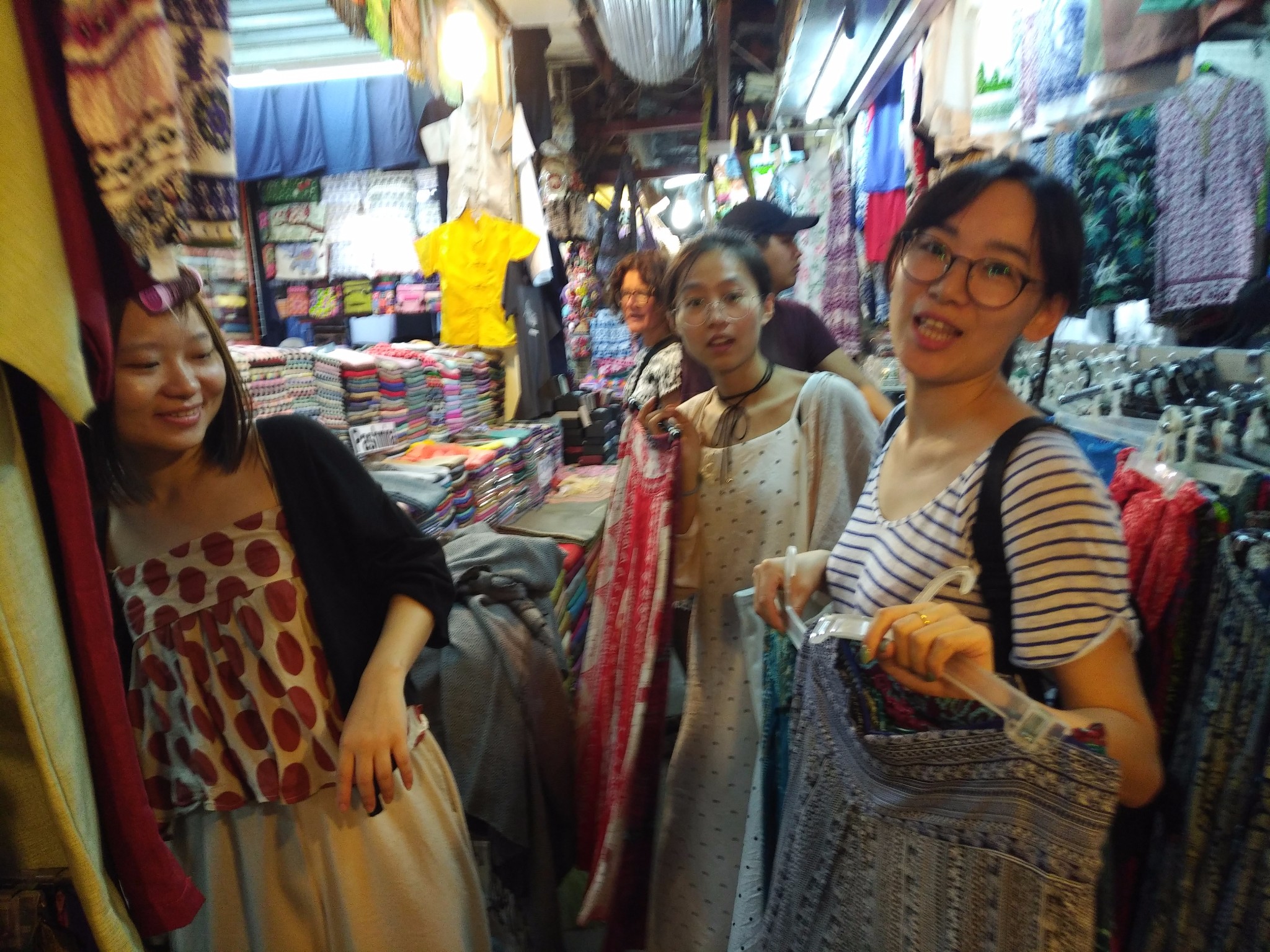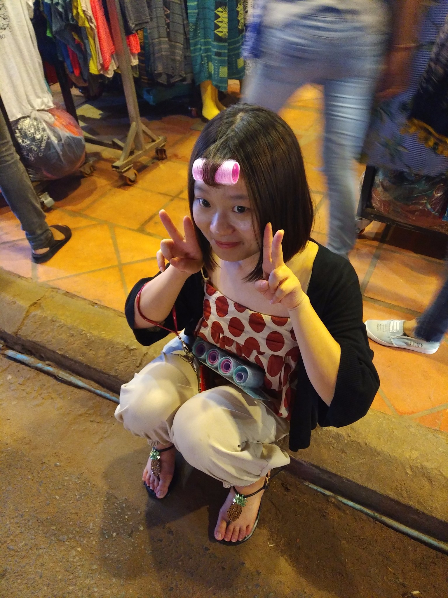 晚上,他们去砍价买裤子,陈静说一定要2刀买下裤子,但是一直砍价失败。请看这两位二货,还有旁边一直用新买的卷发棒撸一个空气刘海的姑娘,我从一开始就没有看出来她有刘海,但是她非常坚持,还在路边弄头发,说看!!!空气刘海哟。
