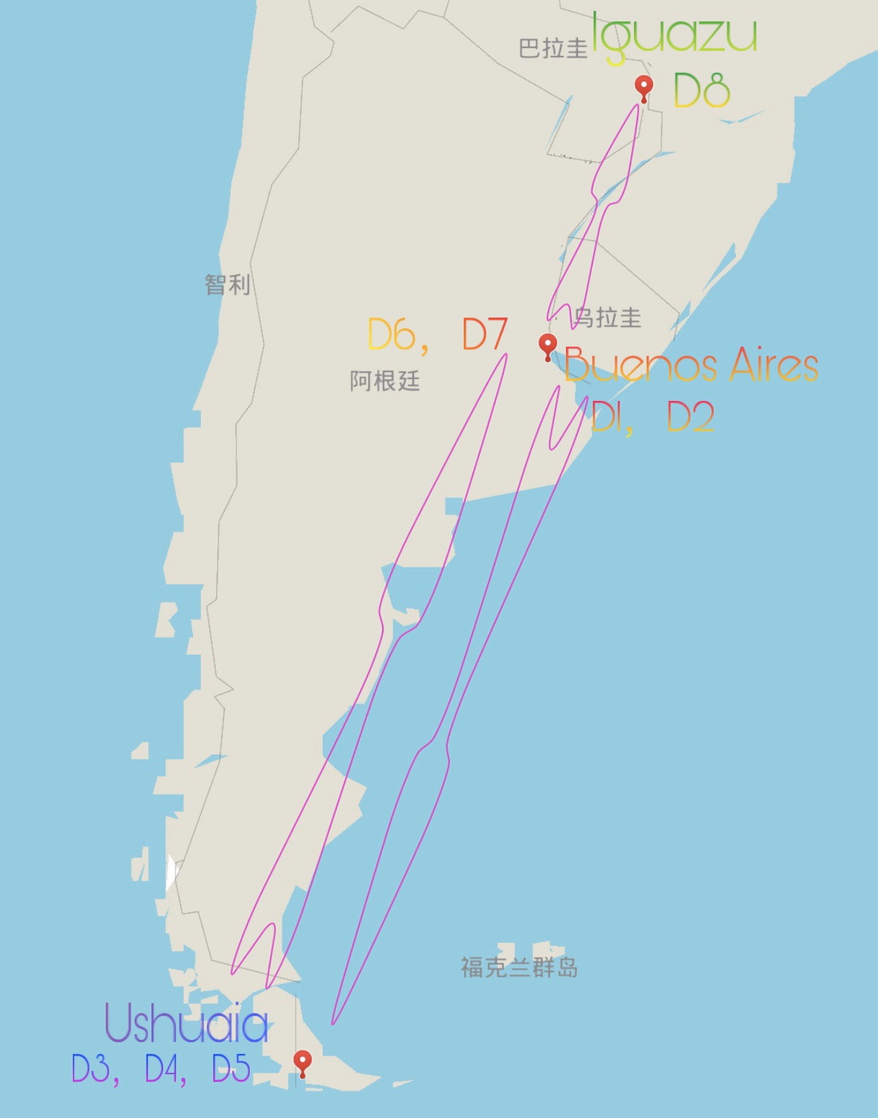 拼凑了二十多天的假期,除去来回飞行以及南极的船期,留给阿根廷的时间只有八天,思来想去,最后选择了首都布宜诺斯艾利斯,最南端的城市乌斯怀亚,和世界最宽的瀑布的伊瓜苏。考虑到要去南极,放弃了莫雷诺冰川。至于“美洲巨人”阿空加瓜,“小瑞士”巴里洛切,40号国家公路...这些就留作下一次的念想吧。