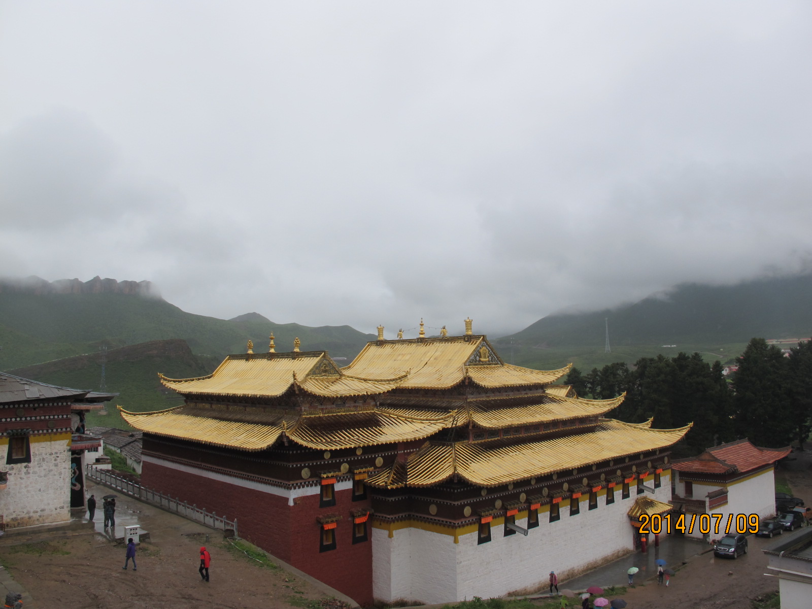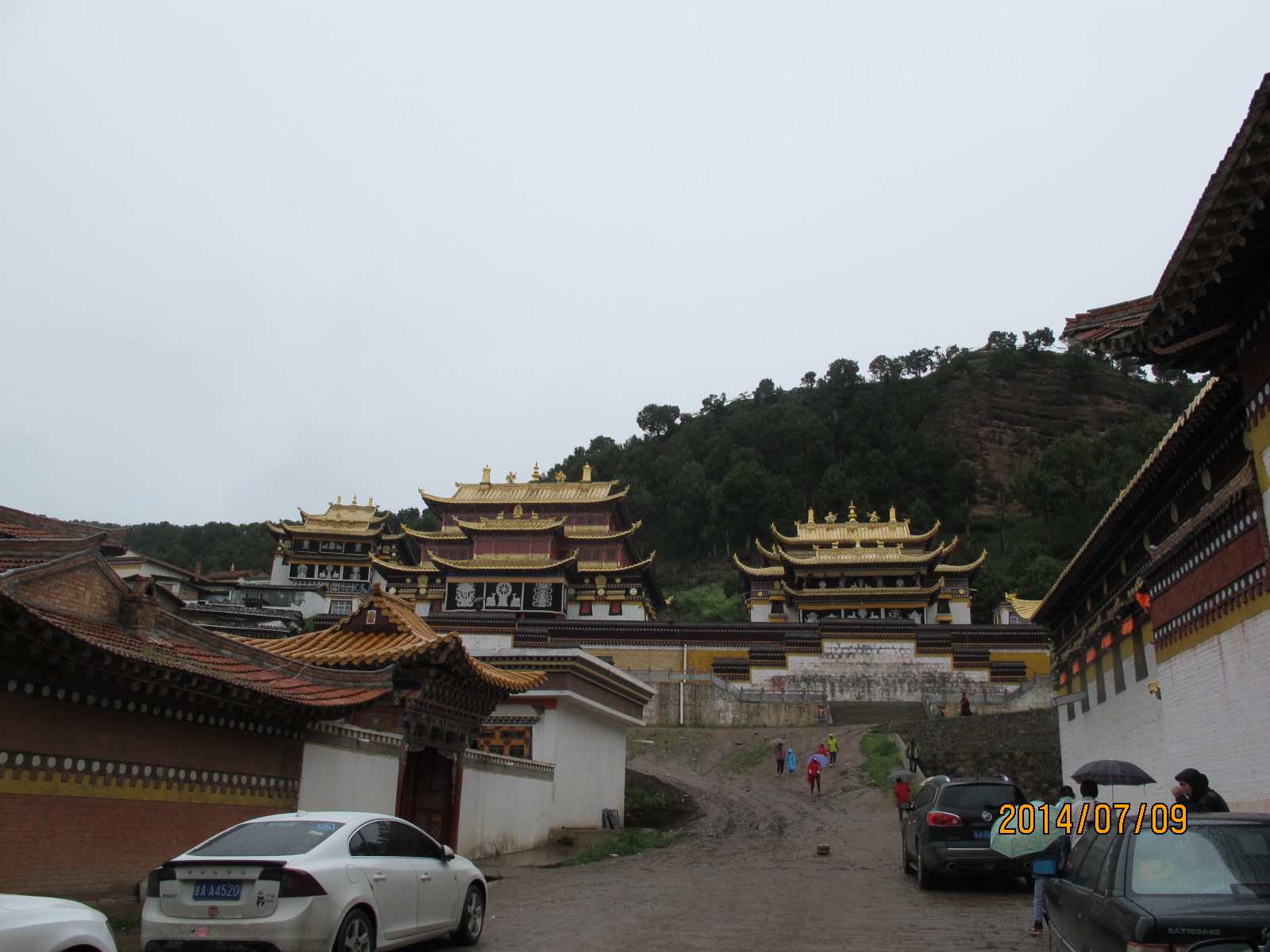 记得那天我们从唐克出发,经过若尔盖湿地,到达郎木寺镇里时已经是下午4、5点钟。山区气候多变,来时路上的艳阳高照到了这里已经变成倾盆大雨。镇里的路上上下下有些坡度,雨势很大,落在地上已汇成小溪从坡上直冲下来。开着新风的车里一下就起了雾,我下意识地去打开除雾开关,一瞥间发现车内液晶屏显示车外气温只有4℃。