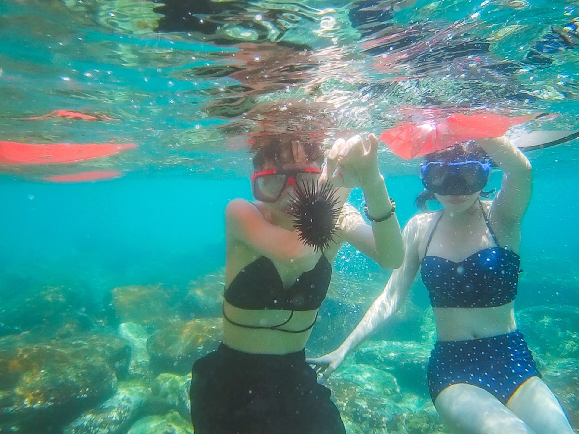 3⃣️:浮潜游玩:大家要听从岛上的工作人员的安排,到指定的区域位置换浮潜设备。在我们在浮潜的过程中呢还有很多可以体验的项目,可以潜水下去抓海胆,海螺,螃蟹️,海星⭐️等等,还有配套相机,拍照救生圈,海上坐骑大黄鸭,火烈鸟等。