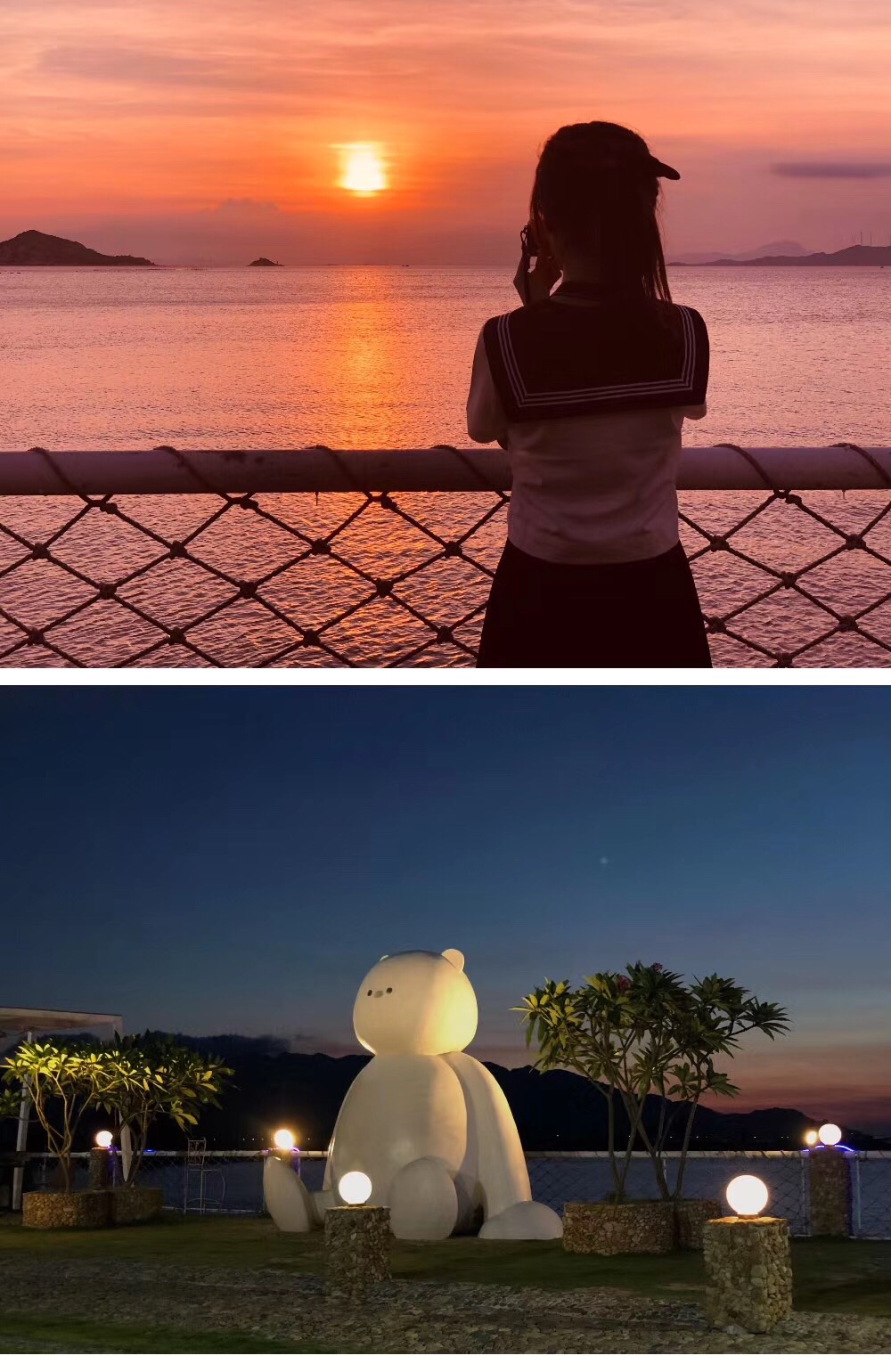 推荐最佳观景点:青澳湾,缓缓的看着太阳升起,日落推荐海滨路前江沙滩,从头走到尾,沙滩上看日落,每天的日落都能给你惊喜,傍晚有时还有小哥哥小姐姐在沙滩上弹唱呢。到晚上还可以买点仙女棒在沙滩上放